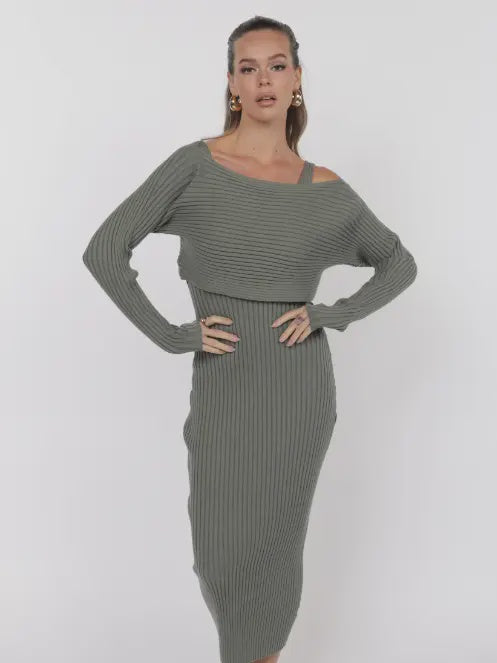 Redefine contemporary cool with this olive ribbed two-piece knit midi dress set. Featuring a sleeveless bodycon dress layered with a matching long-sleeve cropped top, this versatile duo offers endless styling potential. The ribbed knit fabric provides a flattering, curve-hugging fit with comfortable stretch, while the layered look adds dimension and edge. Wear together for a coordinated statement, or mix and match for effortless day-to-night transitions. A must-have for elevated minimalism.