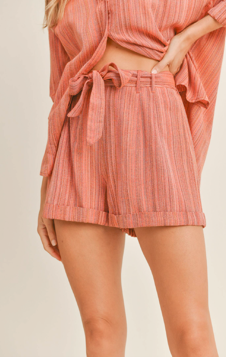 Mixed striped orange,red, and white highwaisted shorts with belt