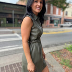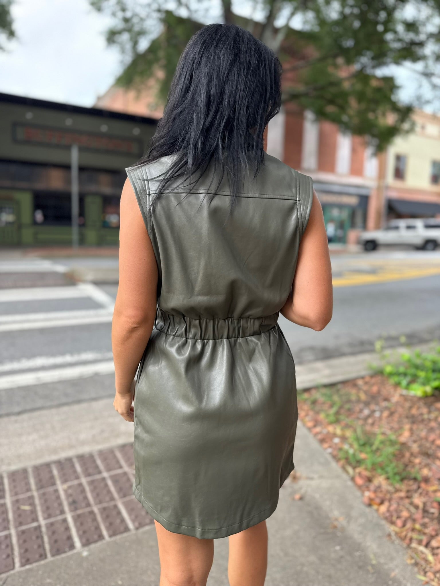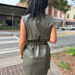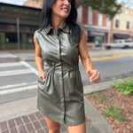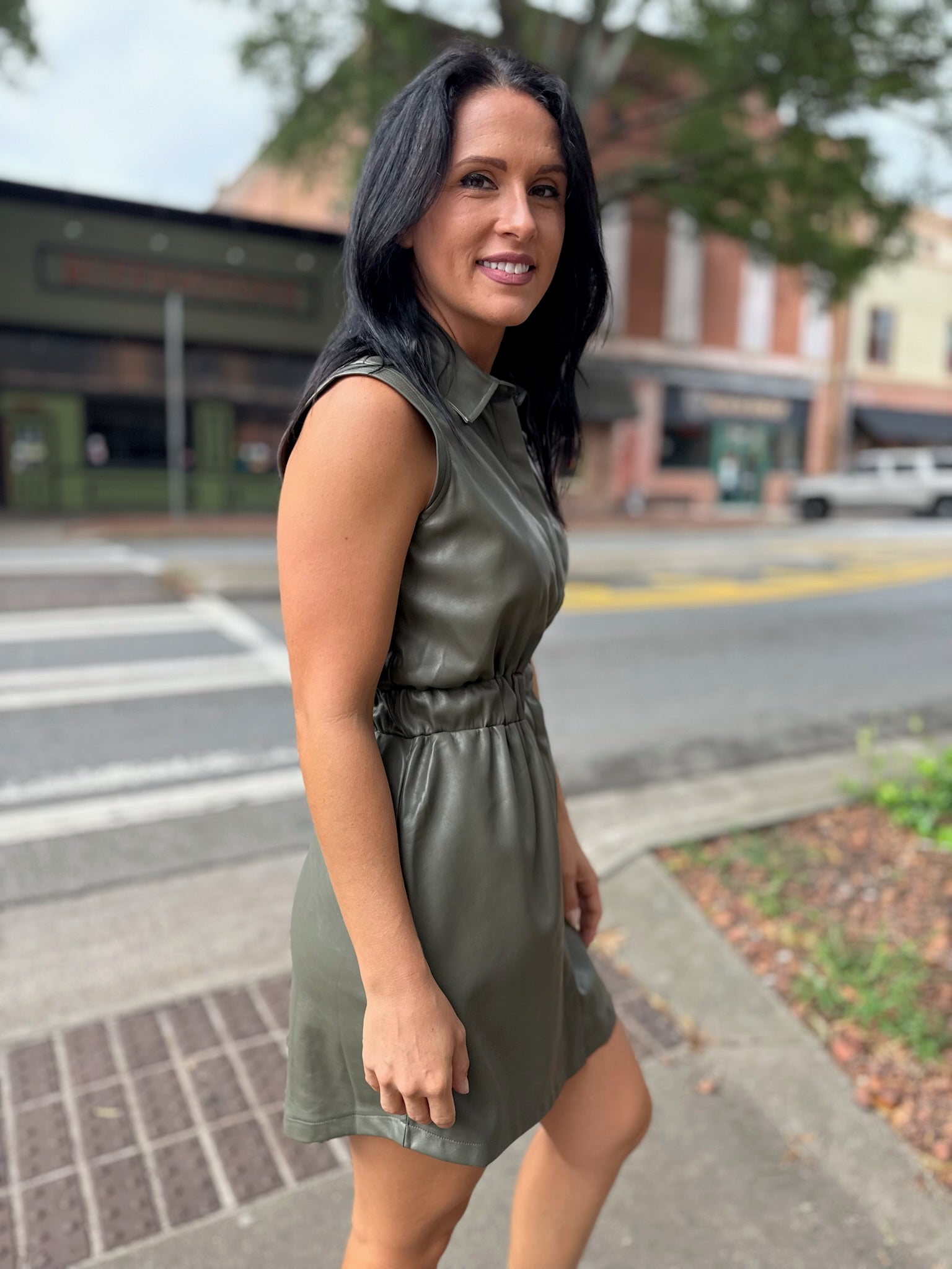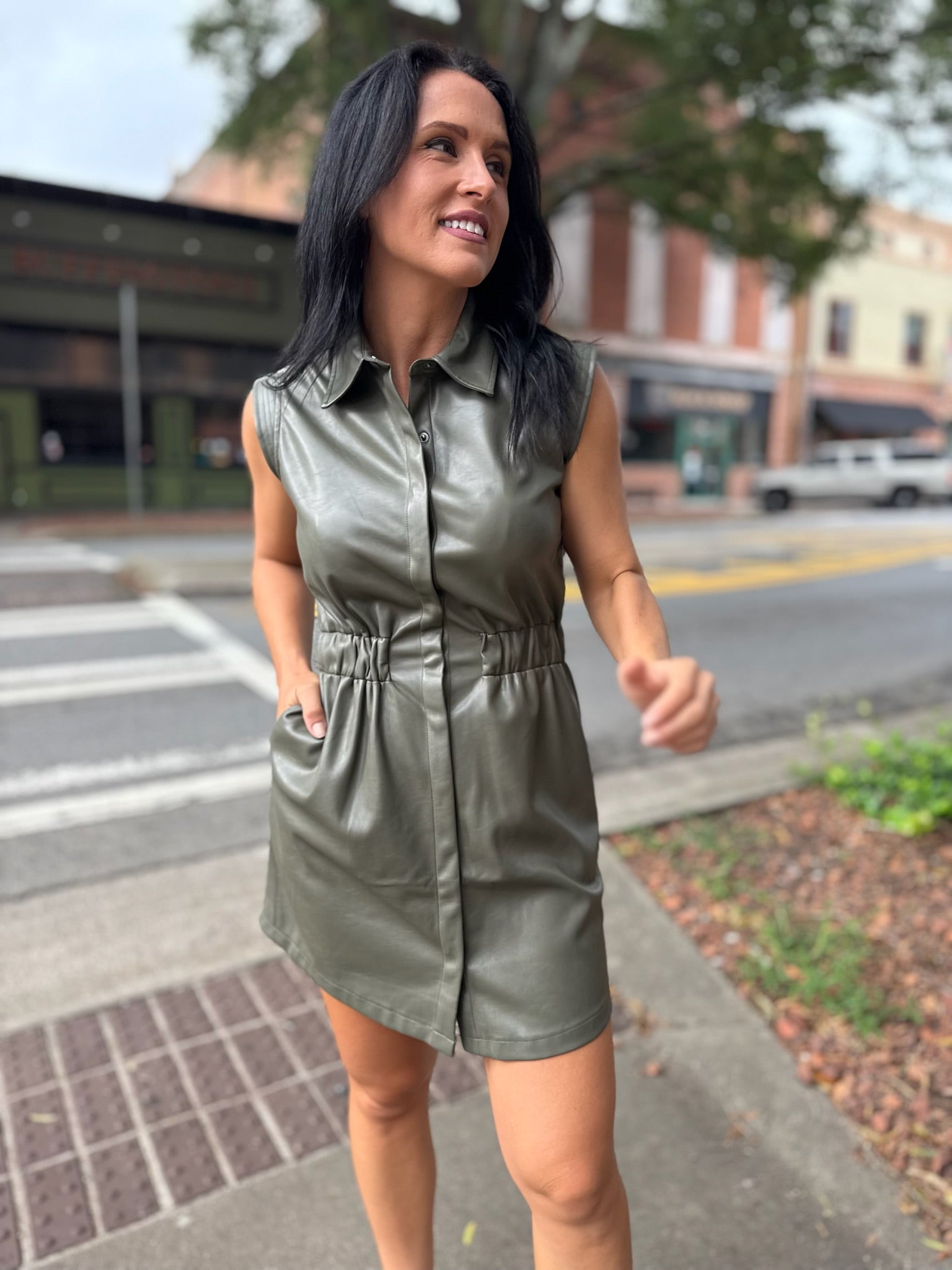 Looking for an edgy yet effortlessly chic piece? Olive Luxe Sleeveless Faux Leather Dress is your new style staple! Crafted in a rich olive tone with a sleek faux leather finish, this dress features a structured collar, button-down front, and flattering cinched waist that hugs in all the right places. The sleeveless cut gives it just the right amount of attitude—perfect for layering with a blazer or rocking solo with boots. Whether you're headed to brunch or a night out, this piece brings confidence and cool-girl vibes every time.