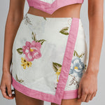 Playful, feminine, and made for sunshine moments, the Floral Print Skort is the ultimate warm-weather statement. Designed in a charming allover floral print with contrast trim detailing, this cotton-linen blend skort brings a fresh and flattering silhouette. The high-waisted mini skort offers a polished wrap-style design with contrast trim accents, combining the look of a skirt with the comfort of built-in shorts. The coordinating cropped cami-style top features a straight neckline with adjustable spaghetti straps and an open back finished with an oversized self-tie bow for a sweet yet striking finish. Perfect for brunch dates, vacations, and summer outings.