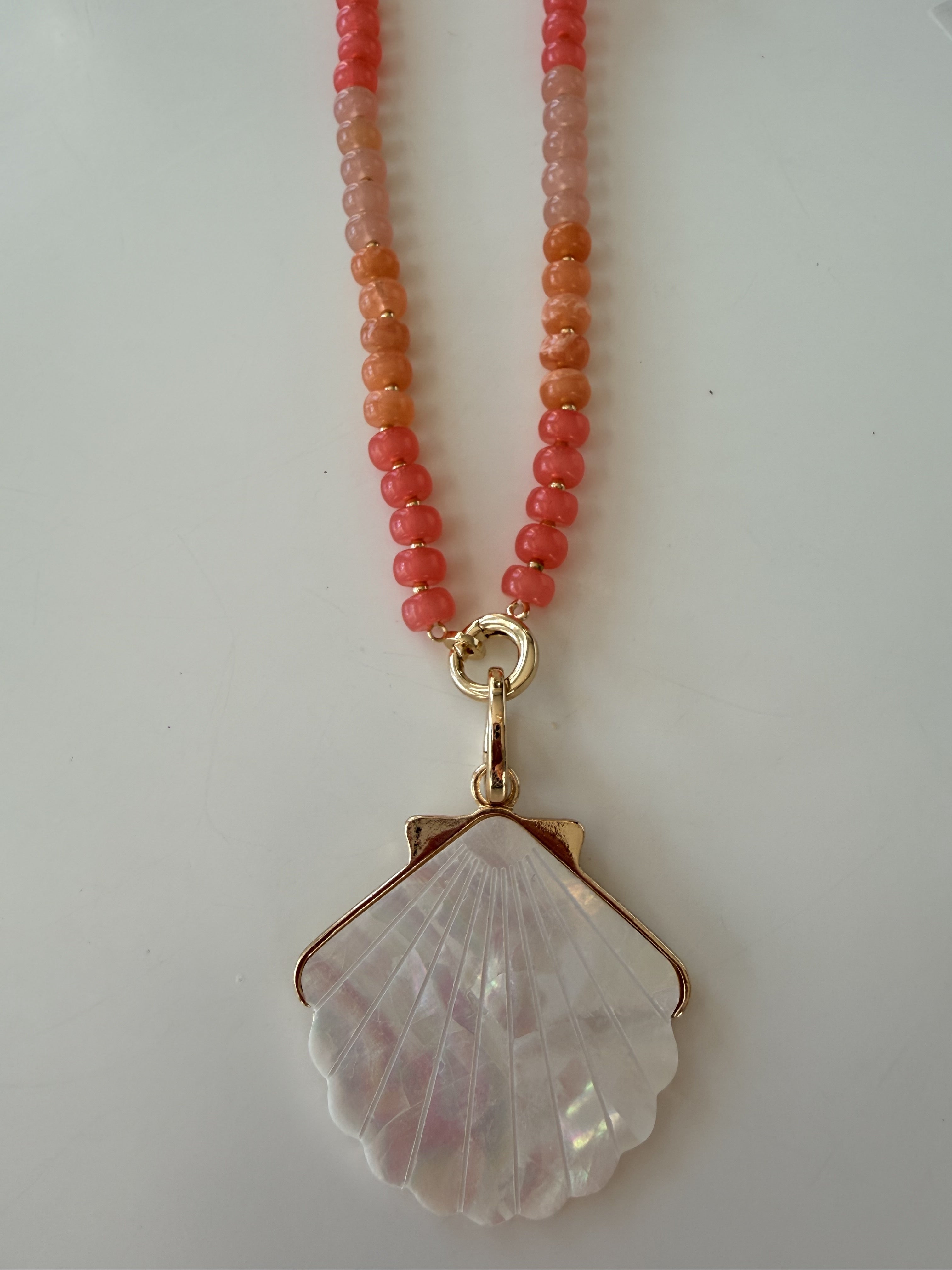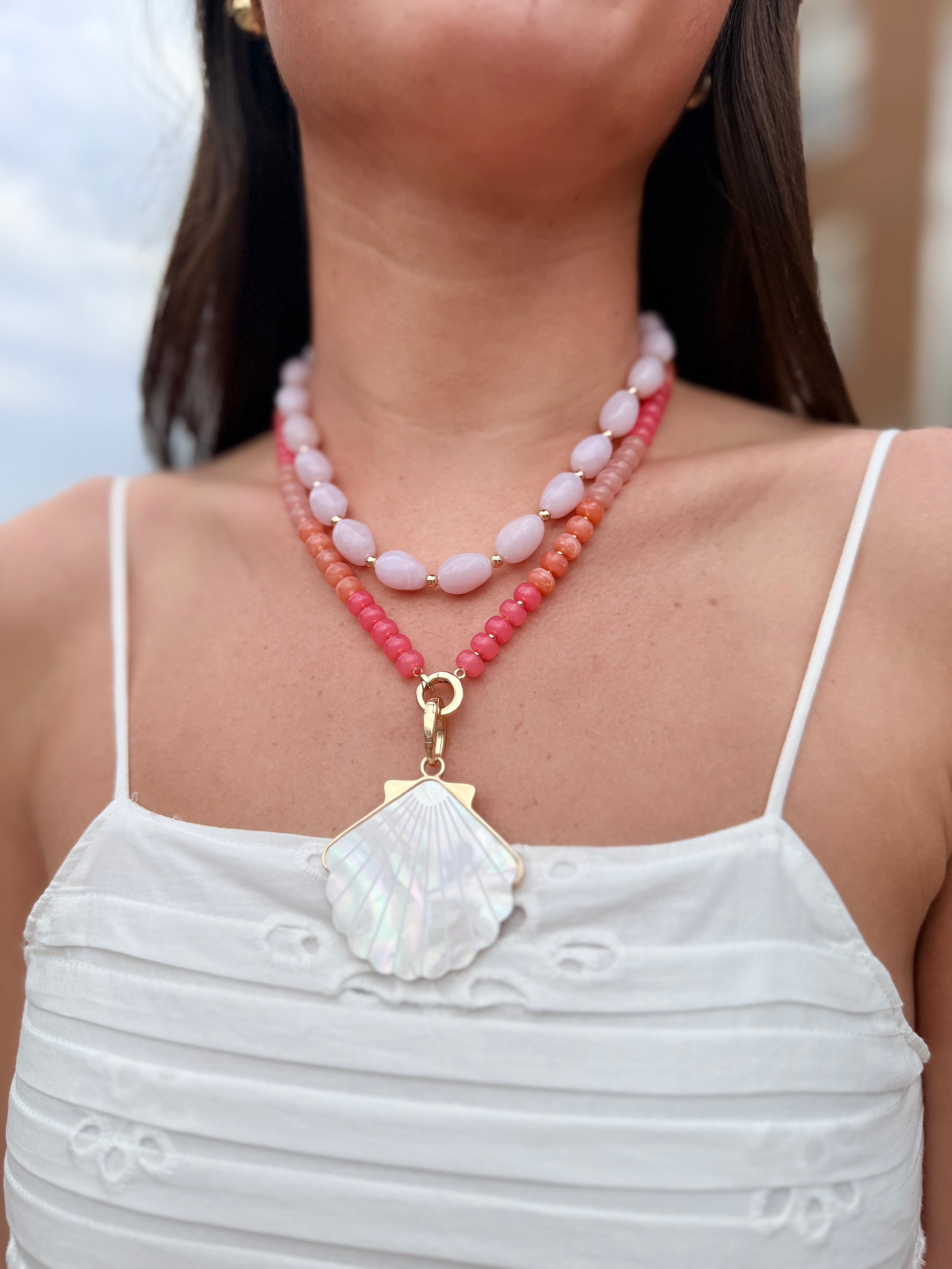 Color meets coastal charm. This triple-strand necklace layers vibrant pink beads with a glowing shell pendant framed in gold for the ultimate statement accessory. Perfect for summer outfits, vacations, or adding a pop of fun to everyday wear, it’s lightweight, lively, and effortlessly chic.