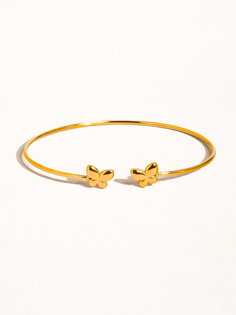 Embrace delicate charm with the Poppy 18K Gold Non-Tarnish Butterfly Bangle, a graceful piece designed to capture the essence of whimsy and elegance. Featuring dainty butterfly accents that gently adorn each end, this slender, adjustable bangle is crafted in lustrous, non-tarnish 18-karat gold for enduring beauty. Its minimalist design effortlessly pairs with other accessories, making it ideal for everyday wear or special occasions. Add a touch of joyful sophistication to your wrist with this lovely, feminine treasure.