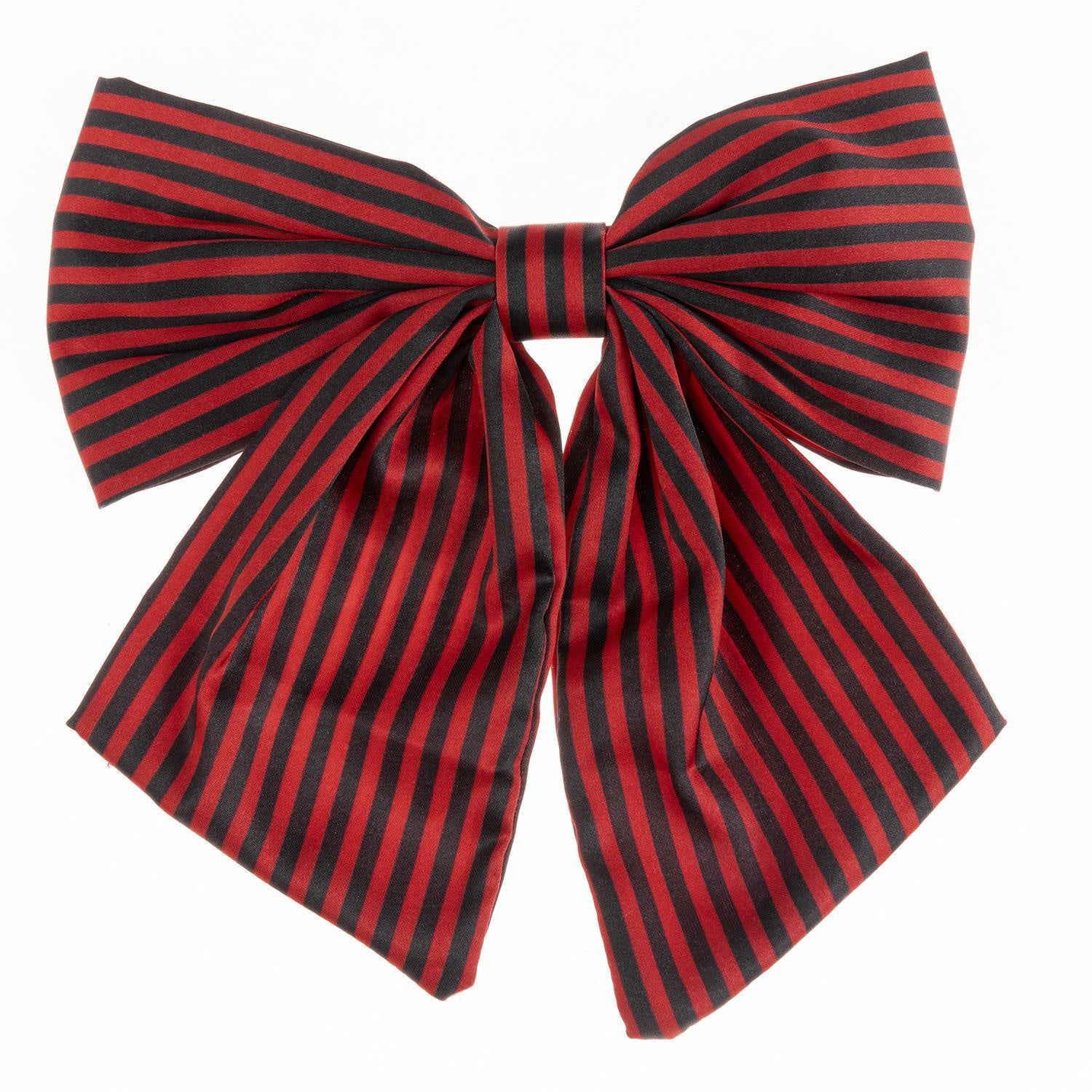 The Red & Black Carly Hair Bow is a striking and stylish accessory featuring a bold striped pattern. Made from a smooth, satin-like fabric, the bow showcases alternating red and black stripes, creating a visually dynamic and elegant look. The oversized design with flowing tails adds a dramatic flair, making it a standout piece for any hairstyle. Whether worn for a vintage-inspired look or to add a sophisticated touch to an outfit, this bow is a perfect statement accessory for those who love bold and classic styles.