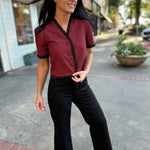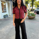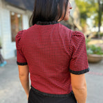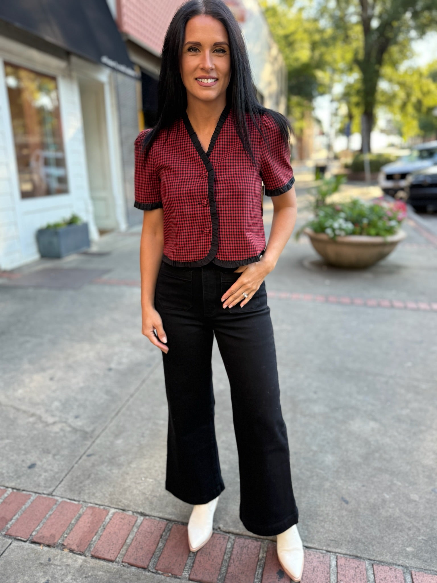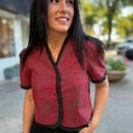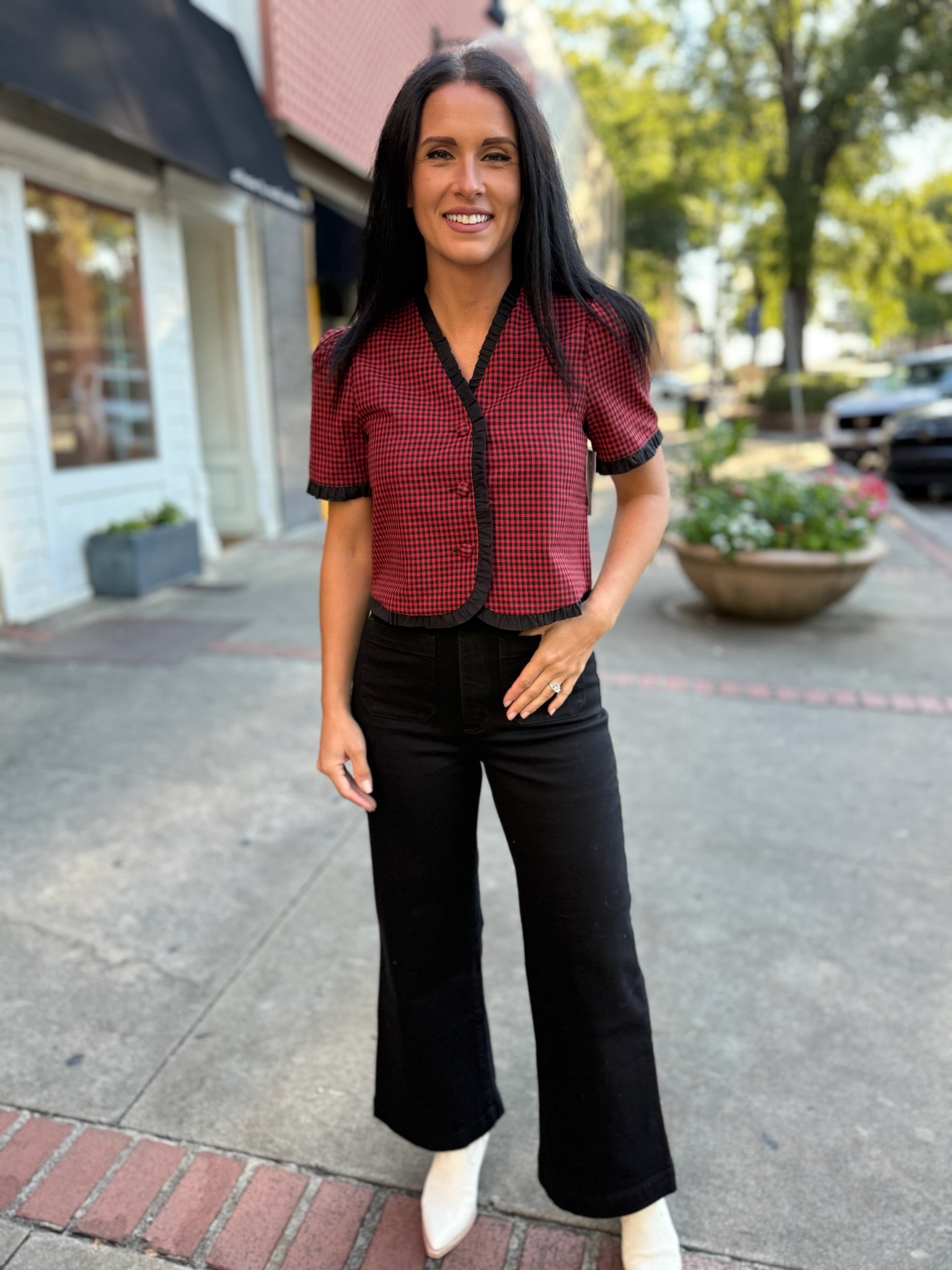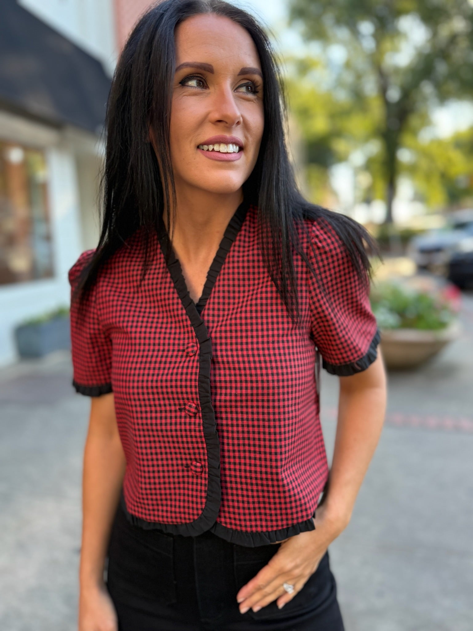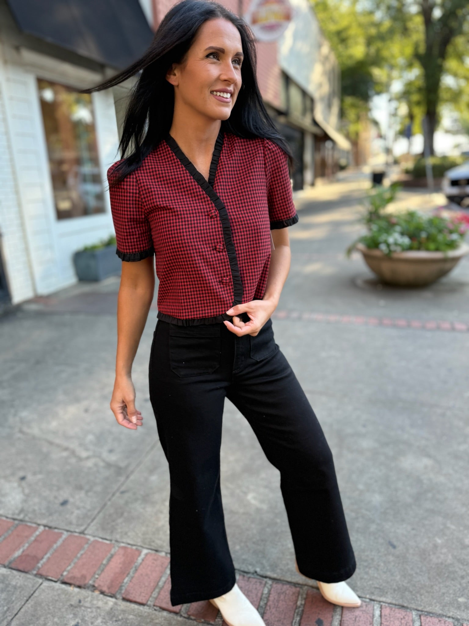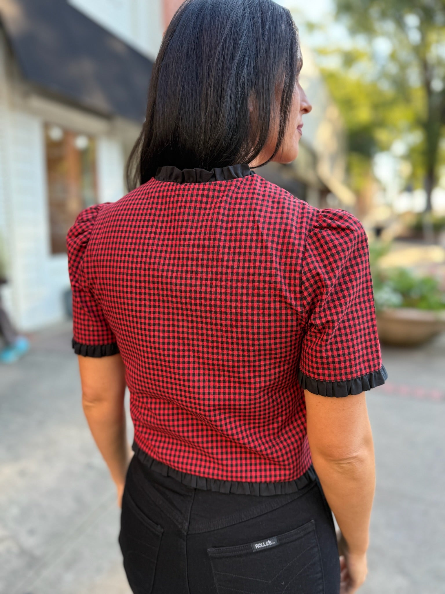 The Red Black Tarra Checkered Top is a playful yet polished piece perfect for adding a pop of pattern to your wardrobe. Featuring a bold checkered print, delicate ruffled hem, and a classic button-down front, it blends feminine charm with timeless style. Pair it with skirts, trousers, or jeans for an effortlessly chic look.