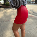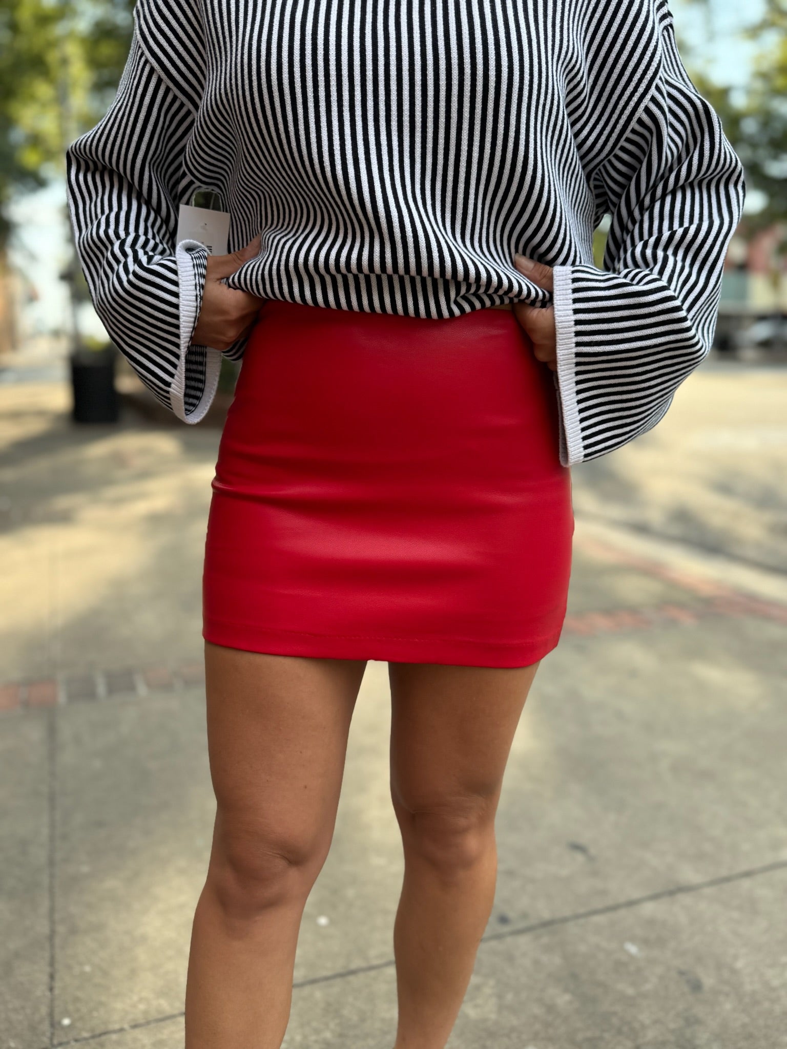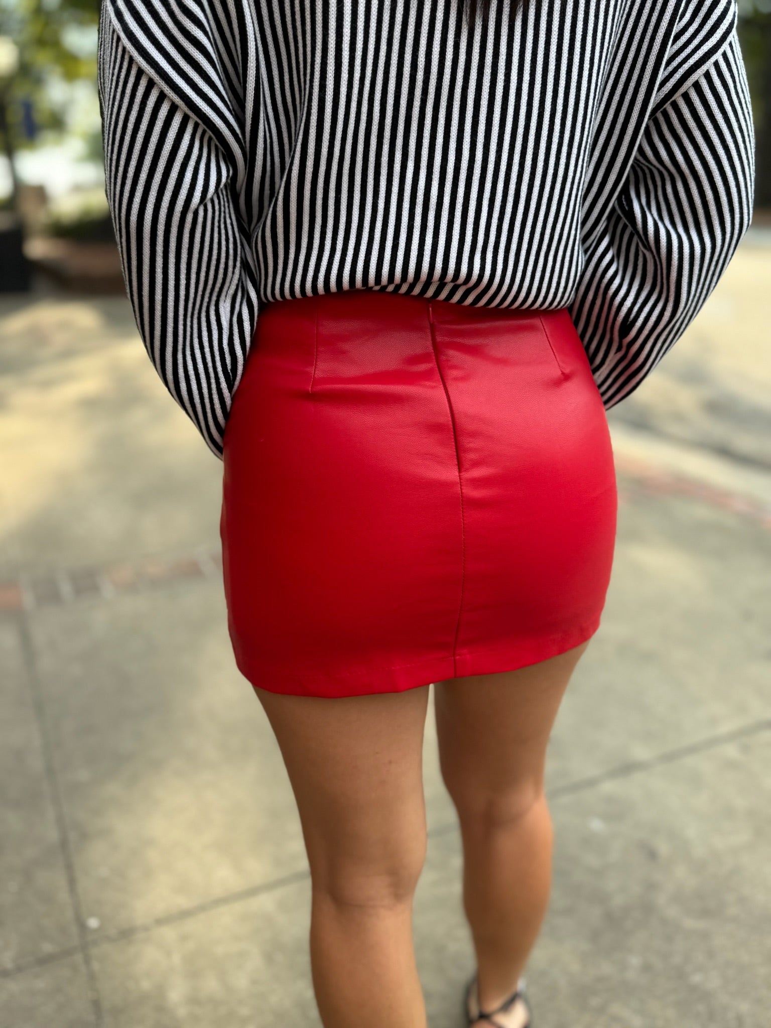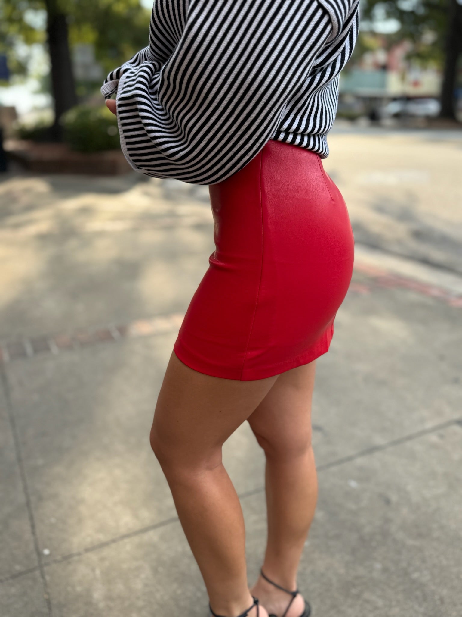 The Red Lucy PU Skirt is a bold and edgy staple that instantly elevates any look. Crafted from sleek faux leather, the Lucy PU Skirt features a high-waisted fit and a secure zipper closure for a flattering, streamlined silhouette. Perfect for pairing with fitted tops, blouses, or oversized sweaters for versatile styling.