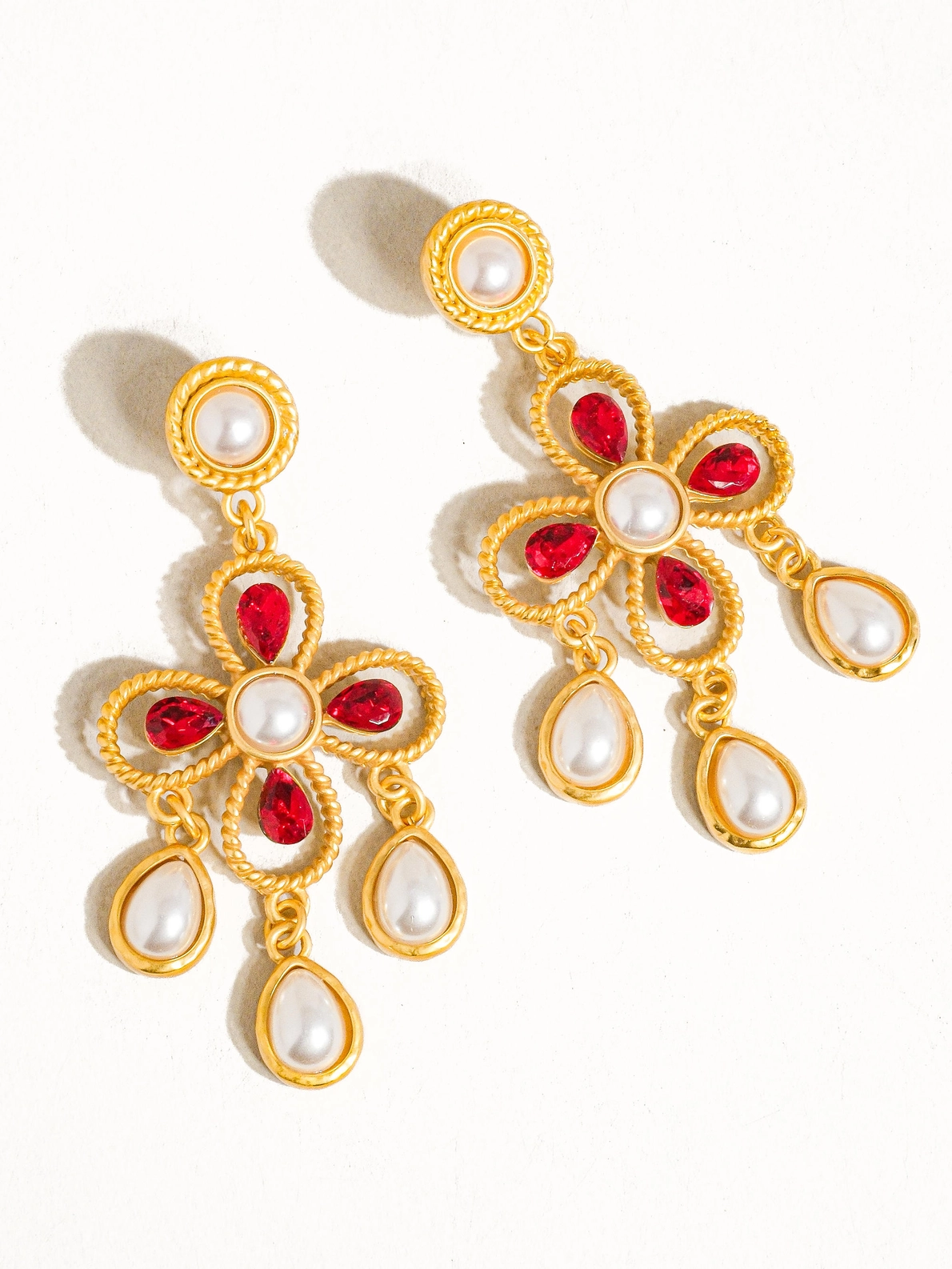 Make a stunning statement with the Malani 18K Gold Vintage Flower Dangle Earrings, showcasing an exquisite design of rich gold, dazzling ruby-red accents, and luxurious pearl details. Evoking vintage glamour, these earrings feature intricate floral motifs that gracefully cascade, catching the light with every movement. Ideal for those special events or simply when you want to feel extraordinary, this timeless pair adds sophistication and femininity to any ensemble. Indulge in their elegant charm and let your style blossom beautifully.