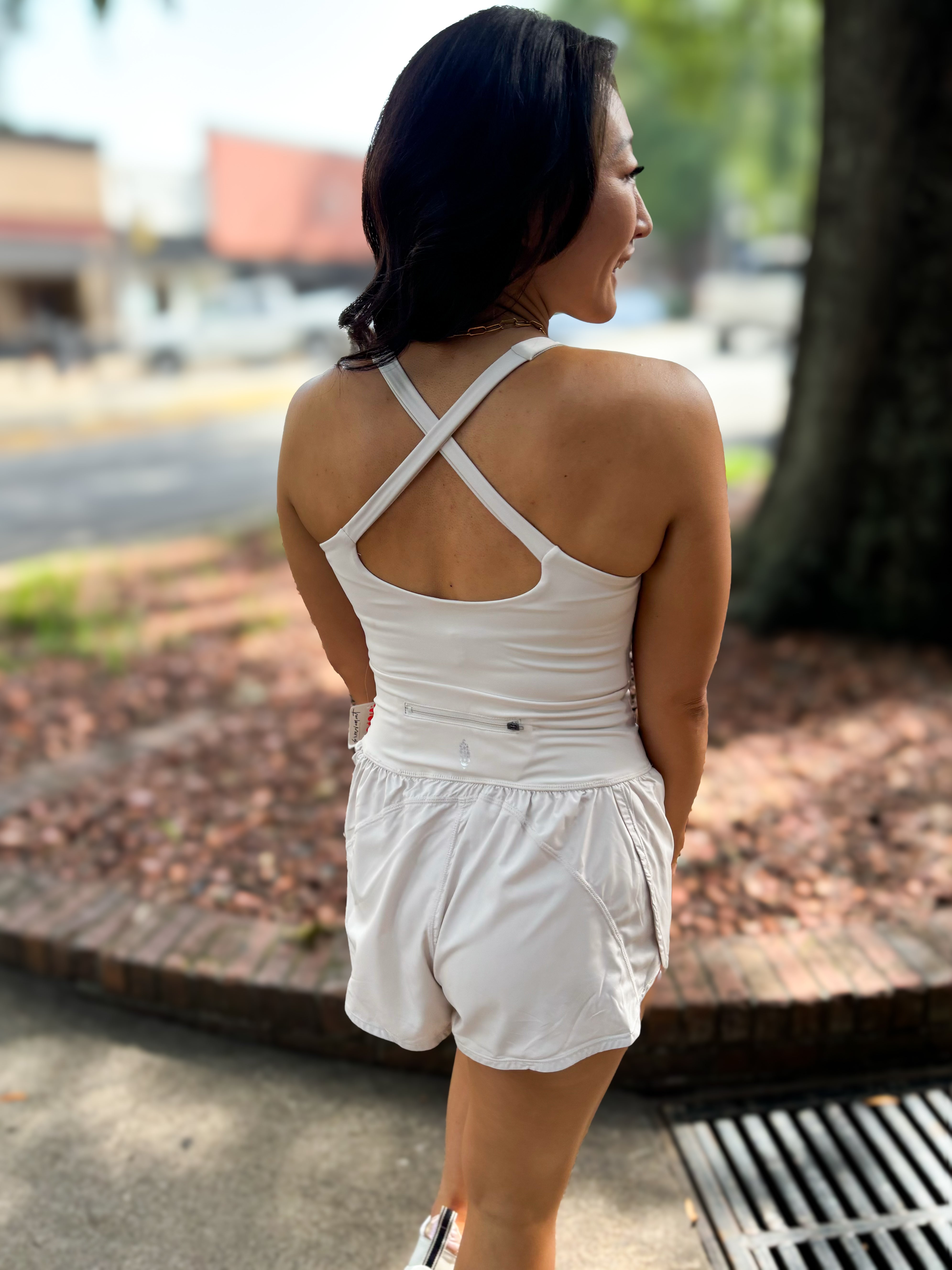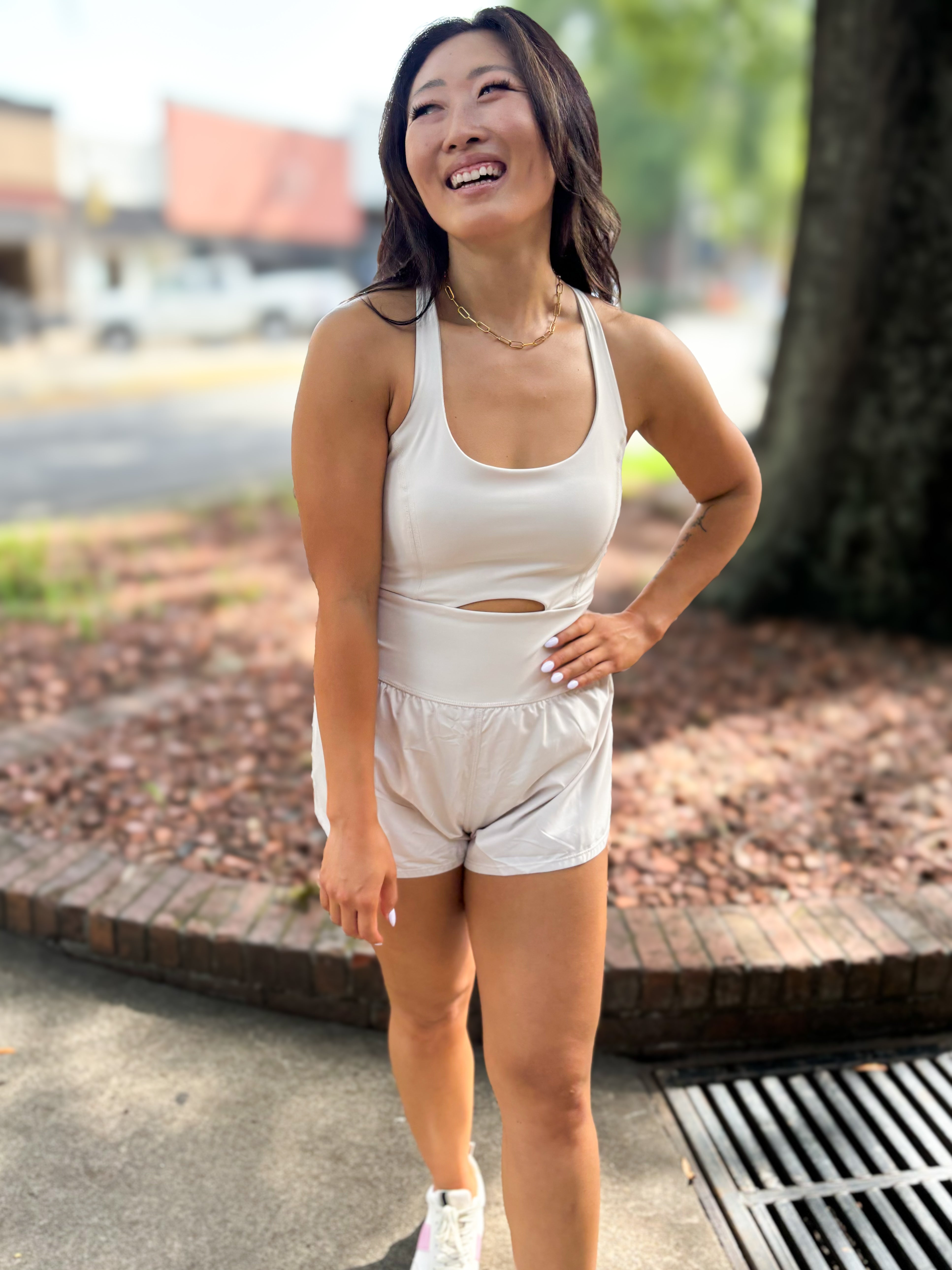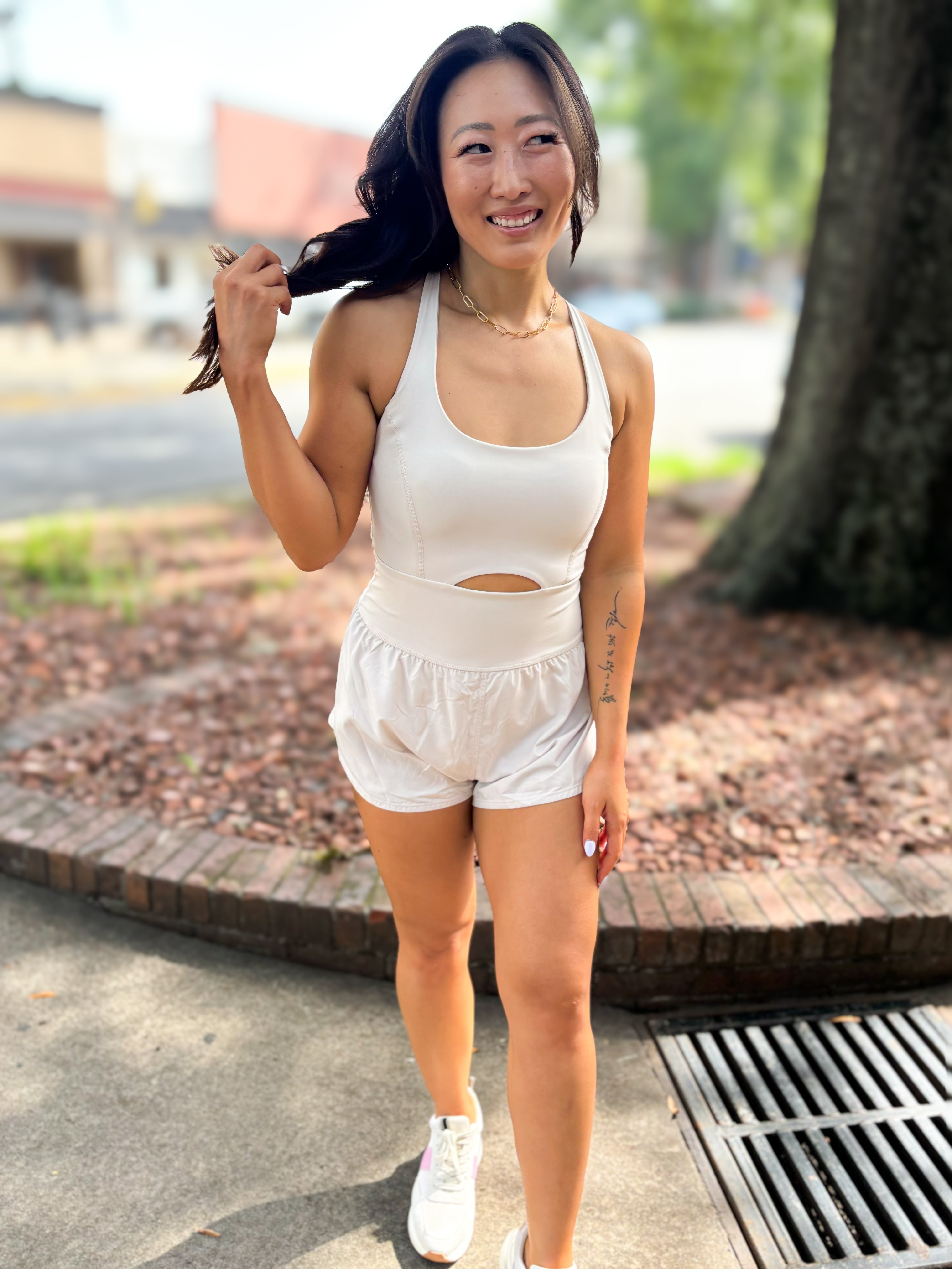 The perfect one-and-done running outfit, this easy romper features a slim-fitting top with a cooling cutout at the center paired with airy retro-style shorts.