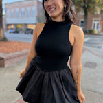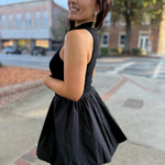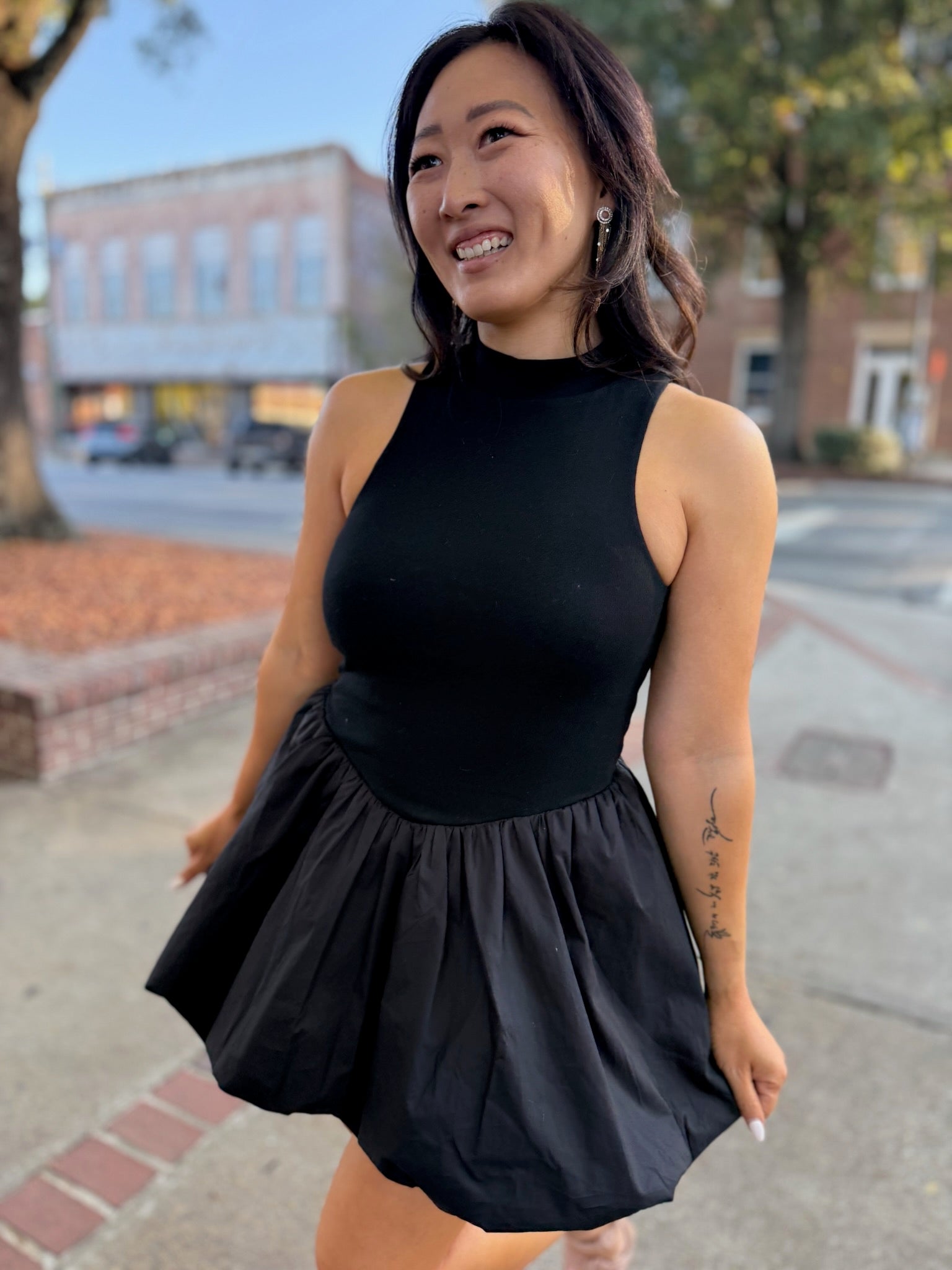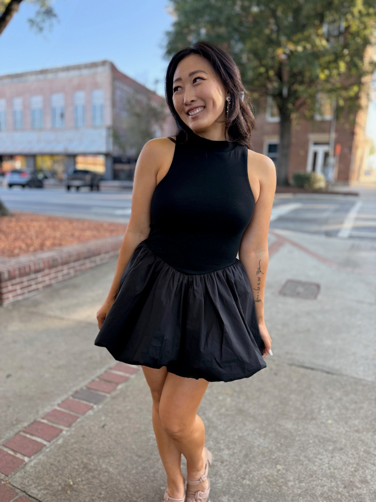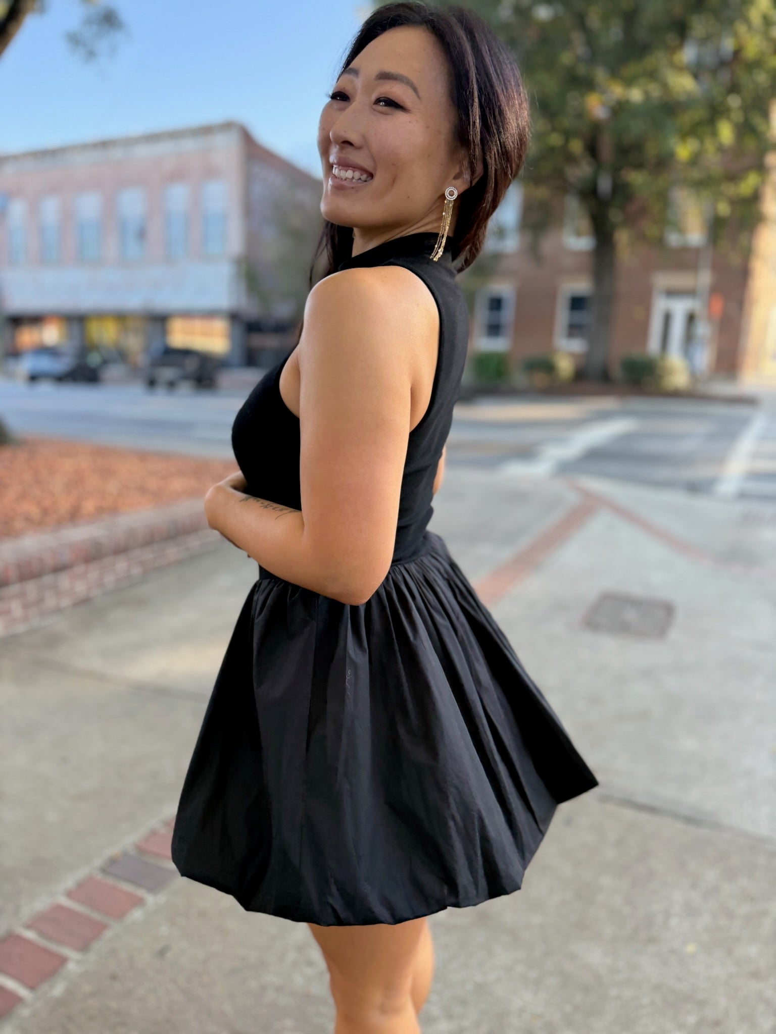 Command attention in the Rita Black Dress, where sleek sophistication meets playful volume. Featuring a fitted high-neck bodice and a dramatic bubble skirt, this striking silhouette is perfect for making a statement. Ideal for cocktail parties or nights out, it’s the ultimate blend of modern elegance and bold style.