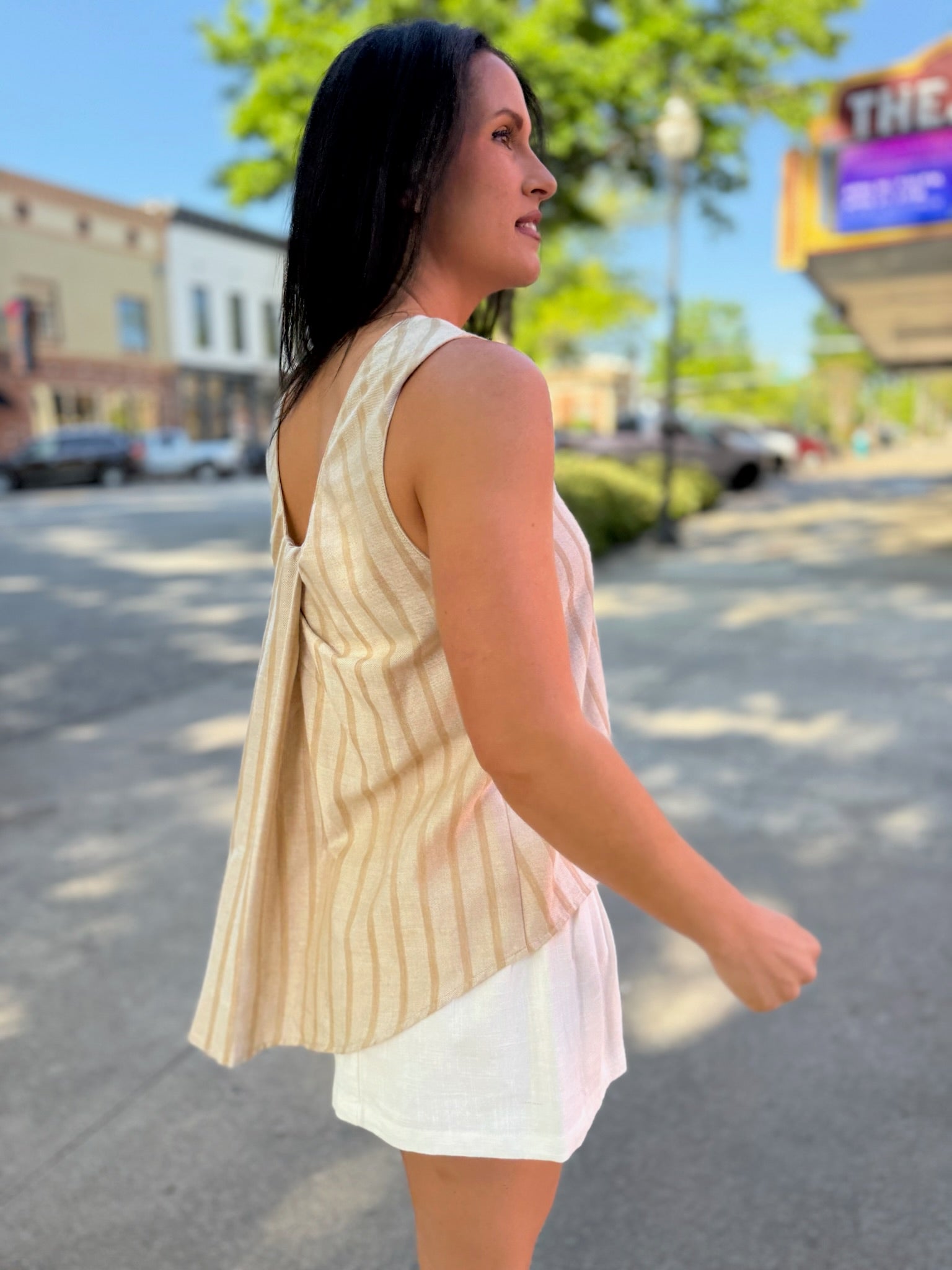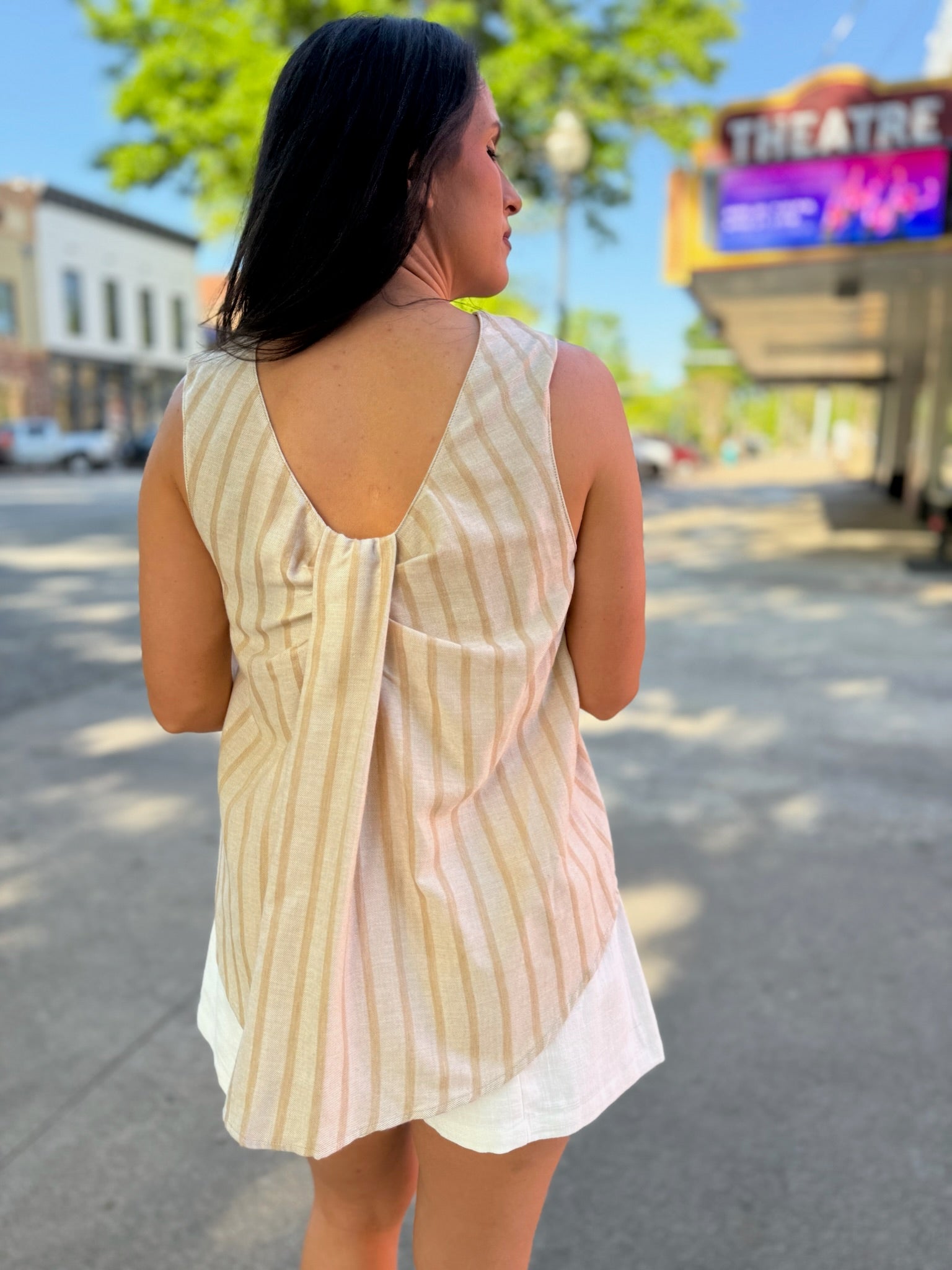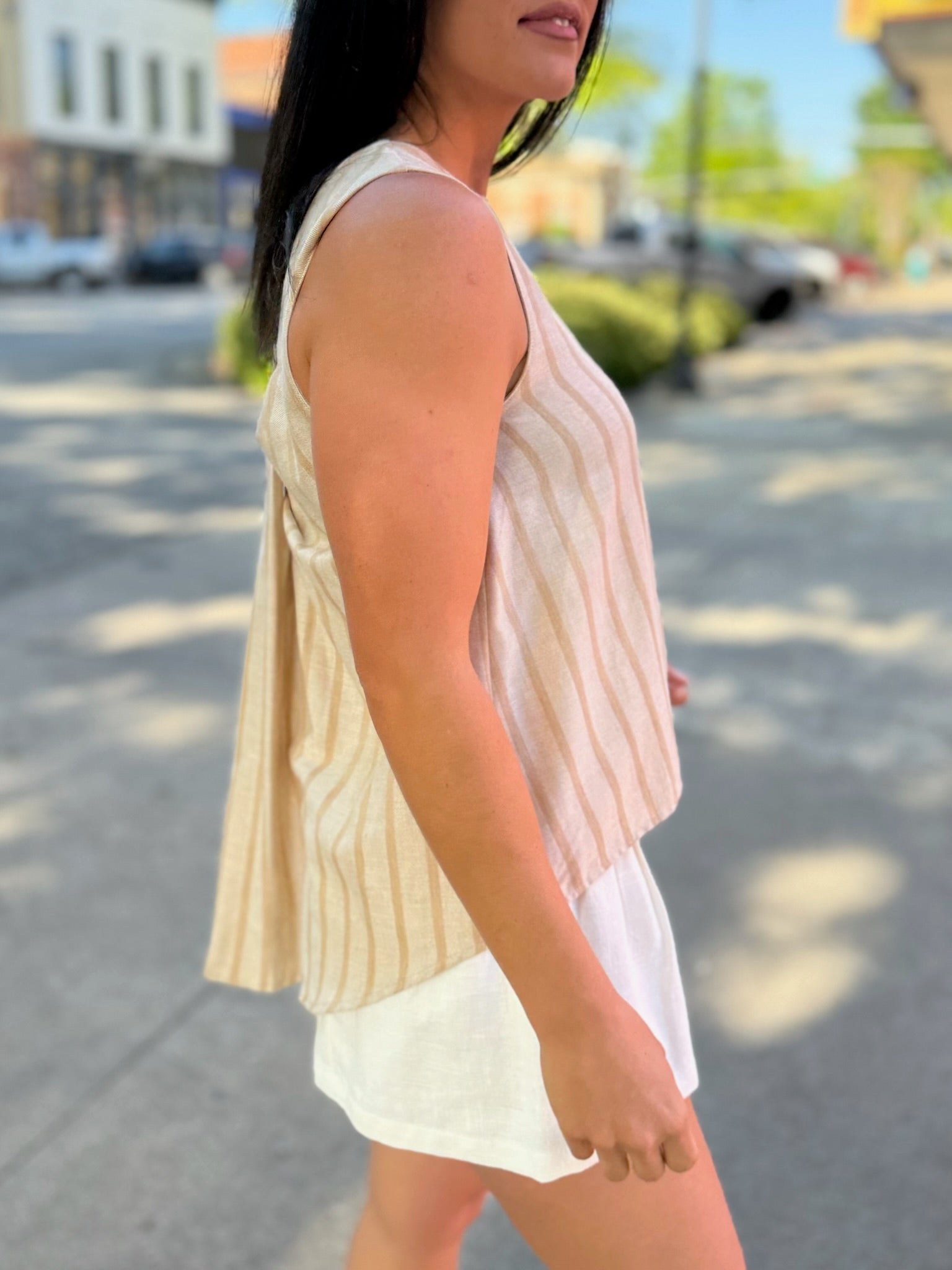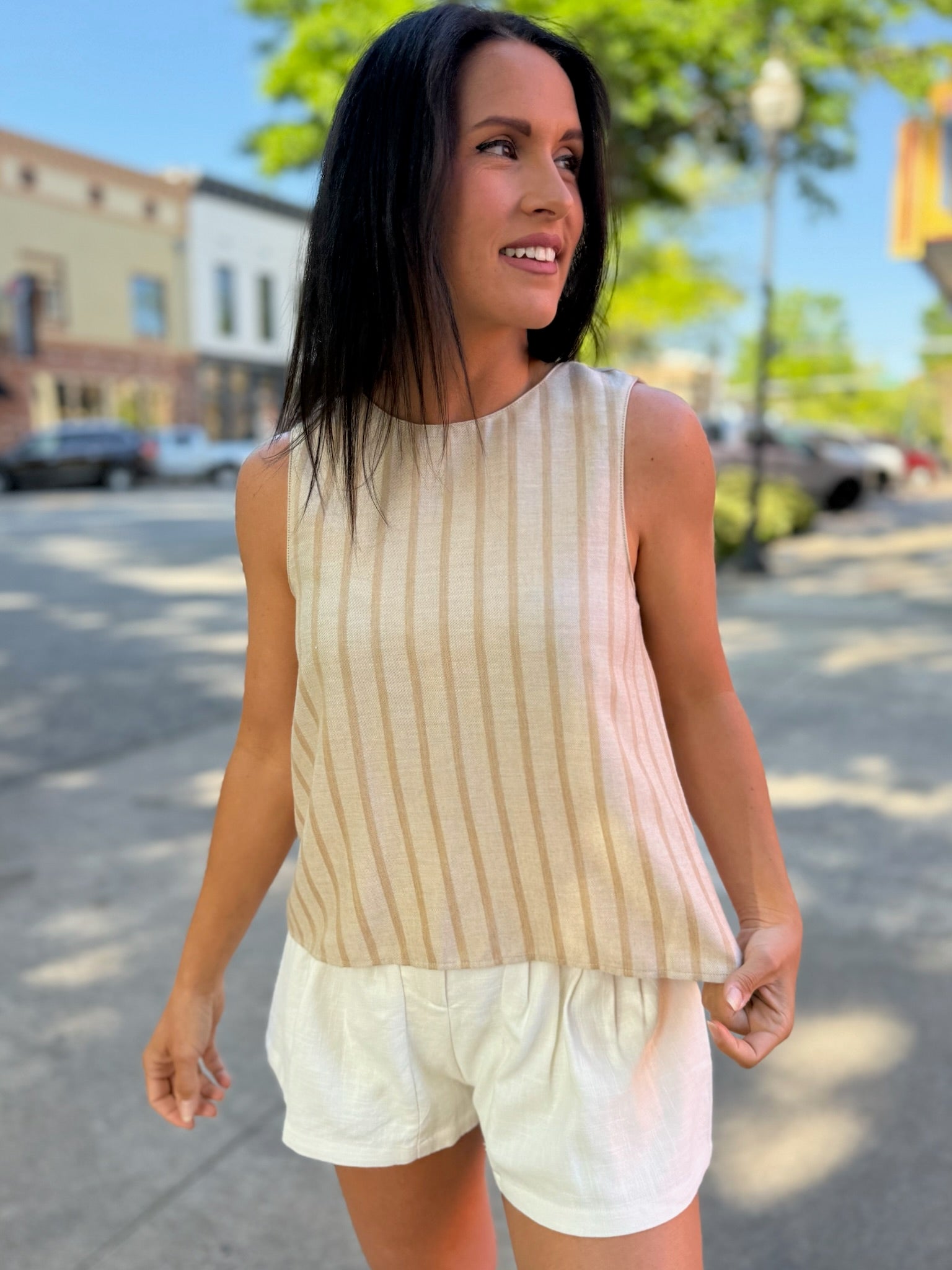 Soft, breezy, and feminine — the Rosé Striped Sleeveless Blouse brings subtle elegance to your everyday wardrobe. Made from a lightweight woven fabric, it features vertical stripes for a flattering, elongated silhouette. The scoop back detail adds a touch of allure, perfectly balancing its relaxed, boxy fit. Pair it with the matching bottoms for a coordinated look or wear it solo with high-rise denim or tailored shorts for a chic warm-weather vibe.