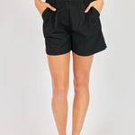 Tailored, timeless, and effortlessly chic, the Royale Shorts bring polished style to warm-weather dressing. Designed with a high-rise fit and softly structured fabric, these black shorts create a flattering silhouette with just the right amount of drape. The pleated front adds a touch of refinement while the relaxed leg keeps them comfortable and easy to wear.