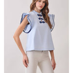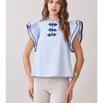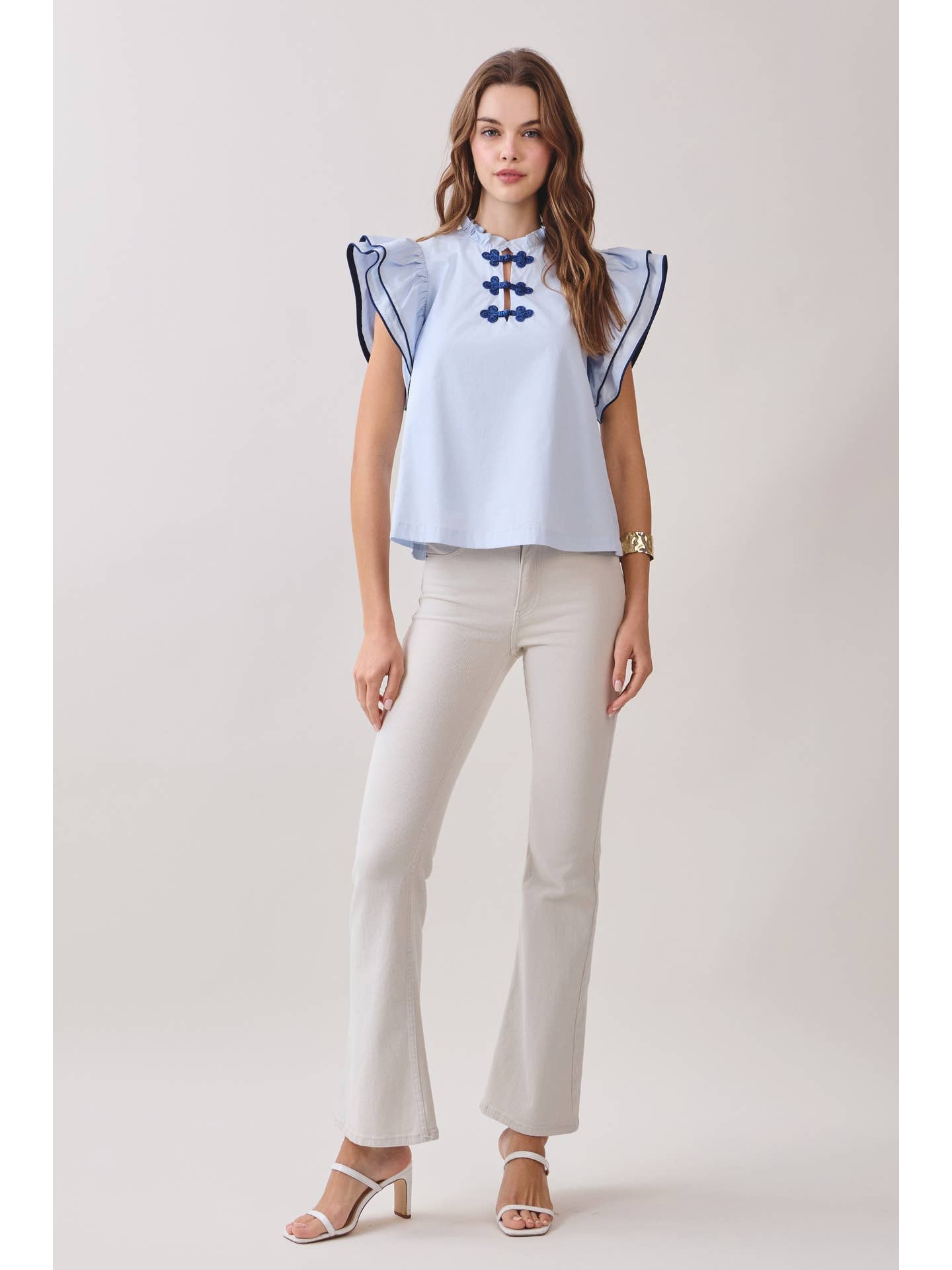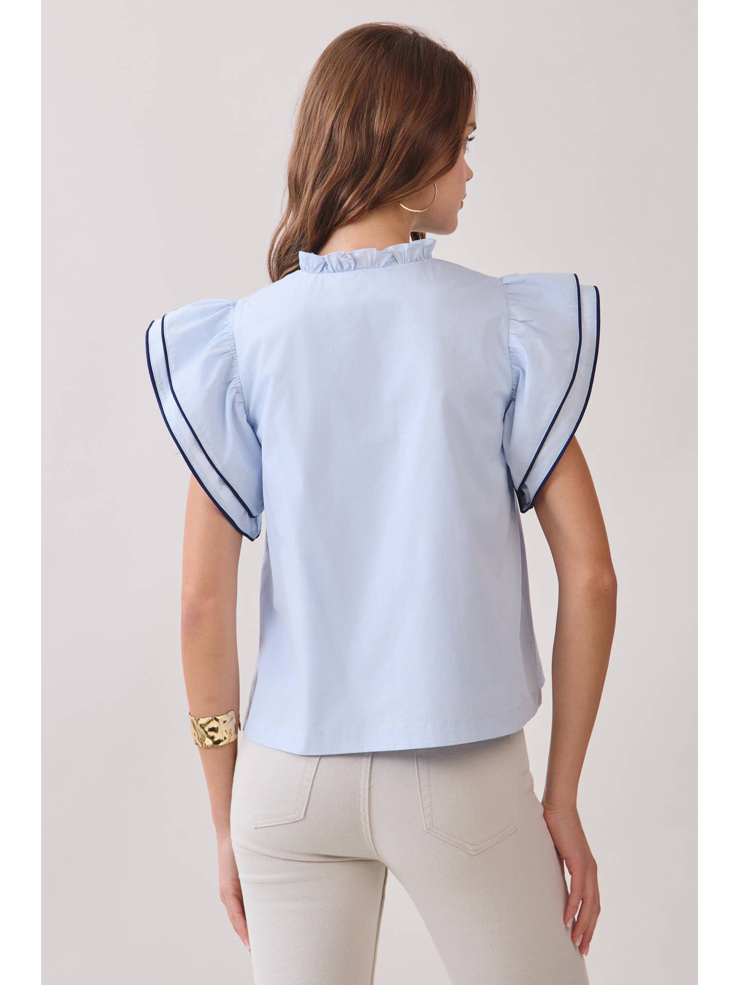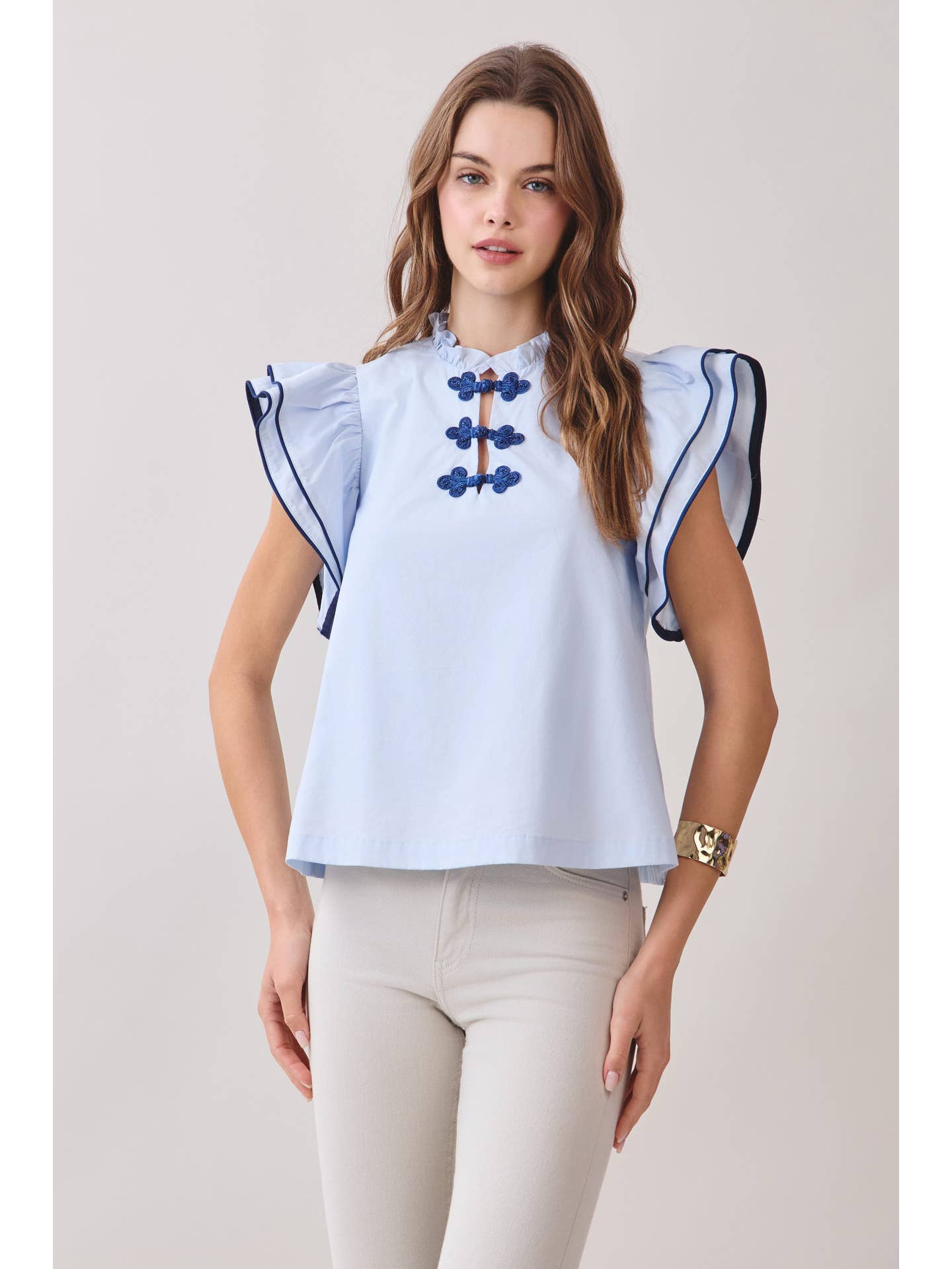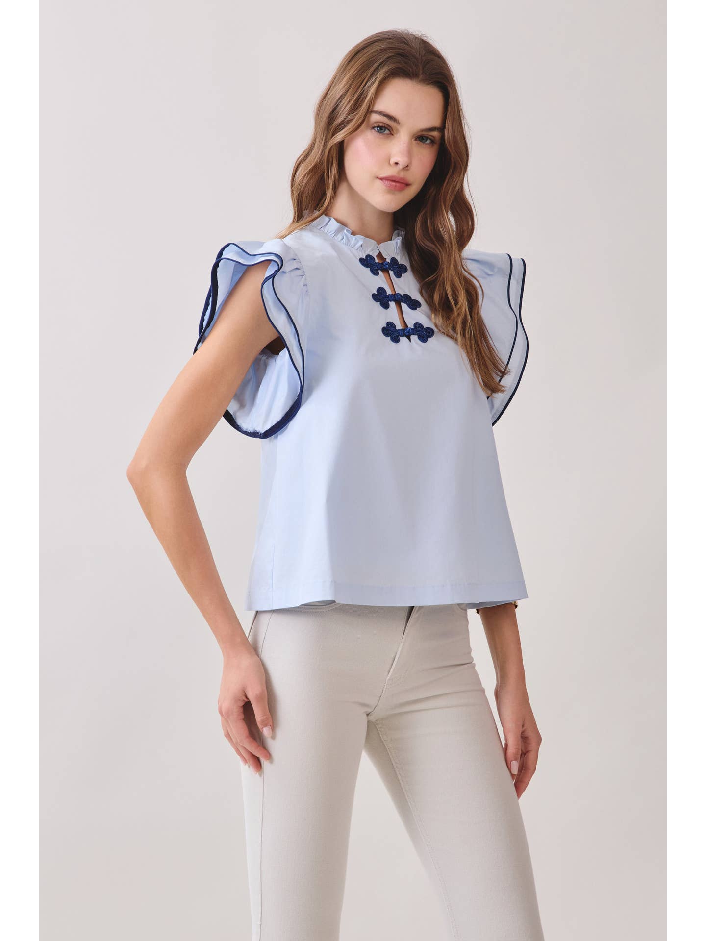 Soft and polished, the Ruffle Layered Flutter Sleeve Contrast Piping Top blends feminine details with a clean, modern silhouette. Designed with layered flutter sleeves and delicate contrast piping, this top features a ruffled neckline and decorative frog closures at the front. The relaxed fit makes it an easy piece to style from day to night.