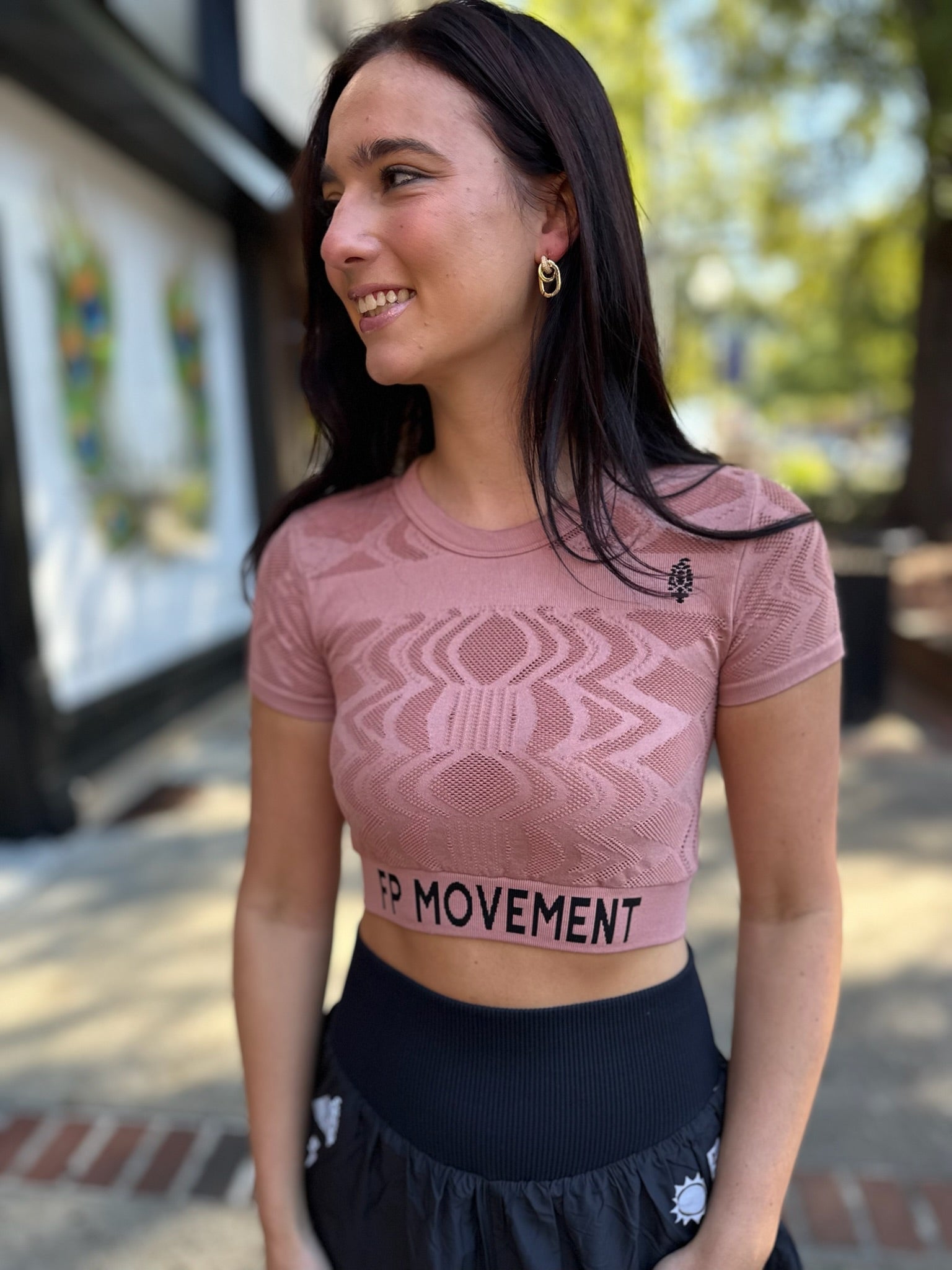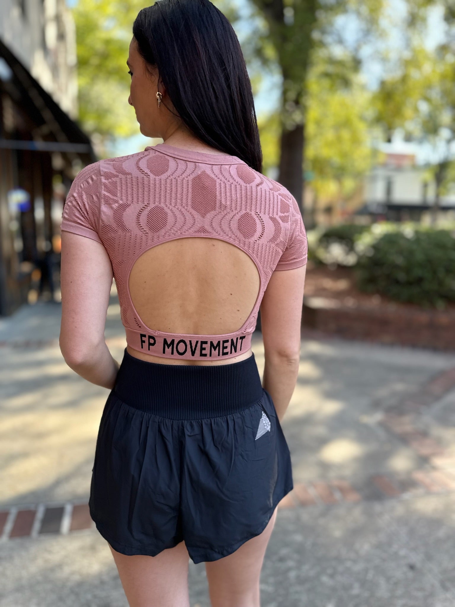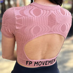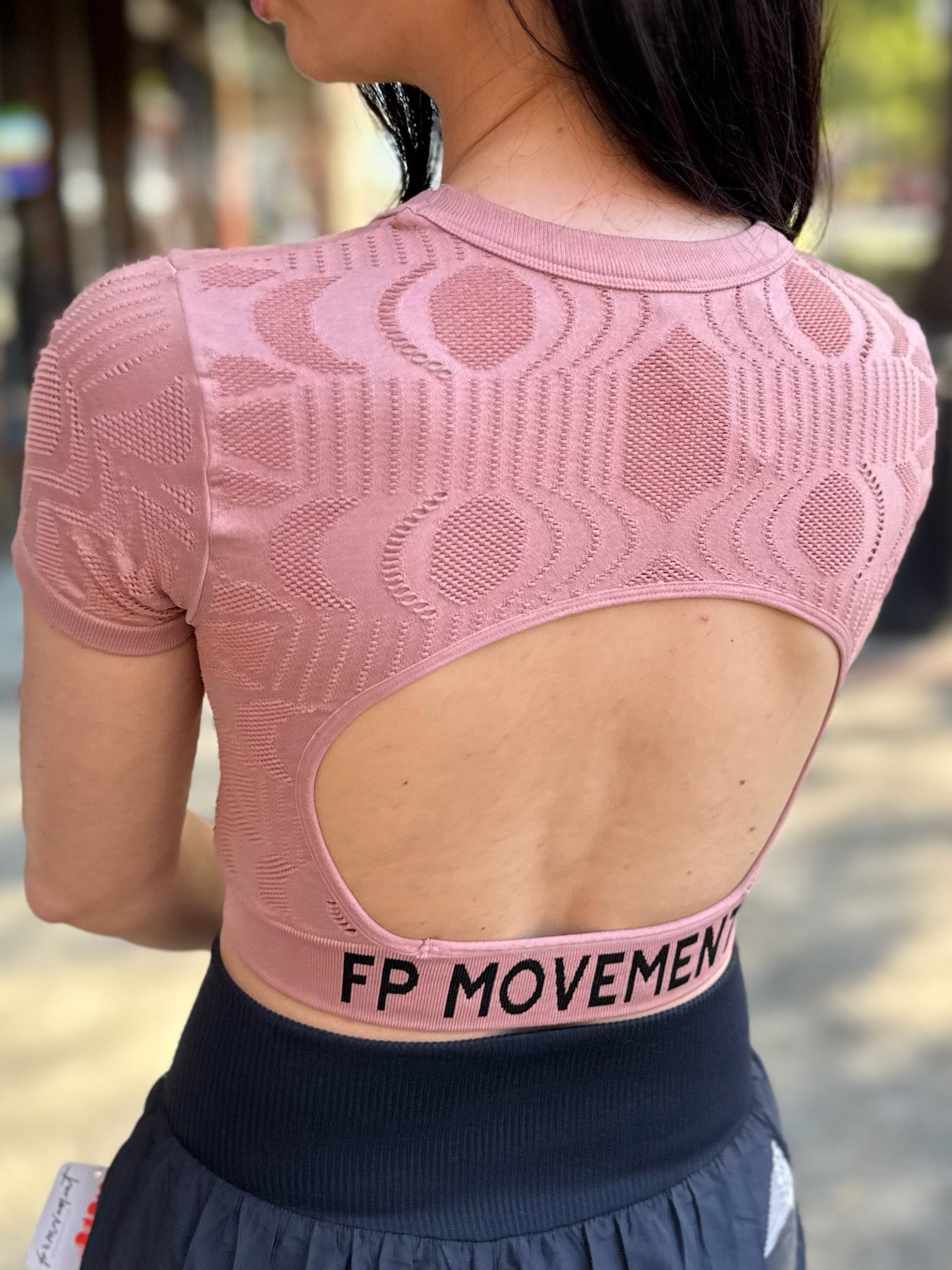 - Features: Scoop neckline, Fitted stretch fabrication, Mesh piecing, FP Movement logo-adorned bottom hem, Cutout at back.