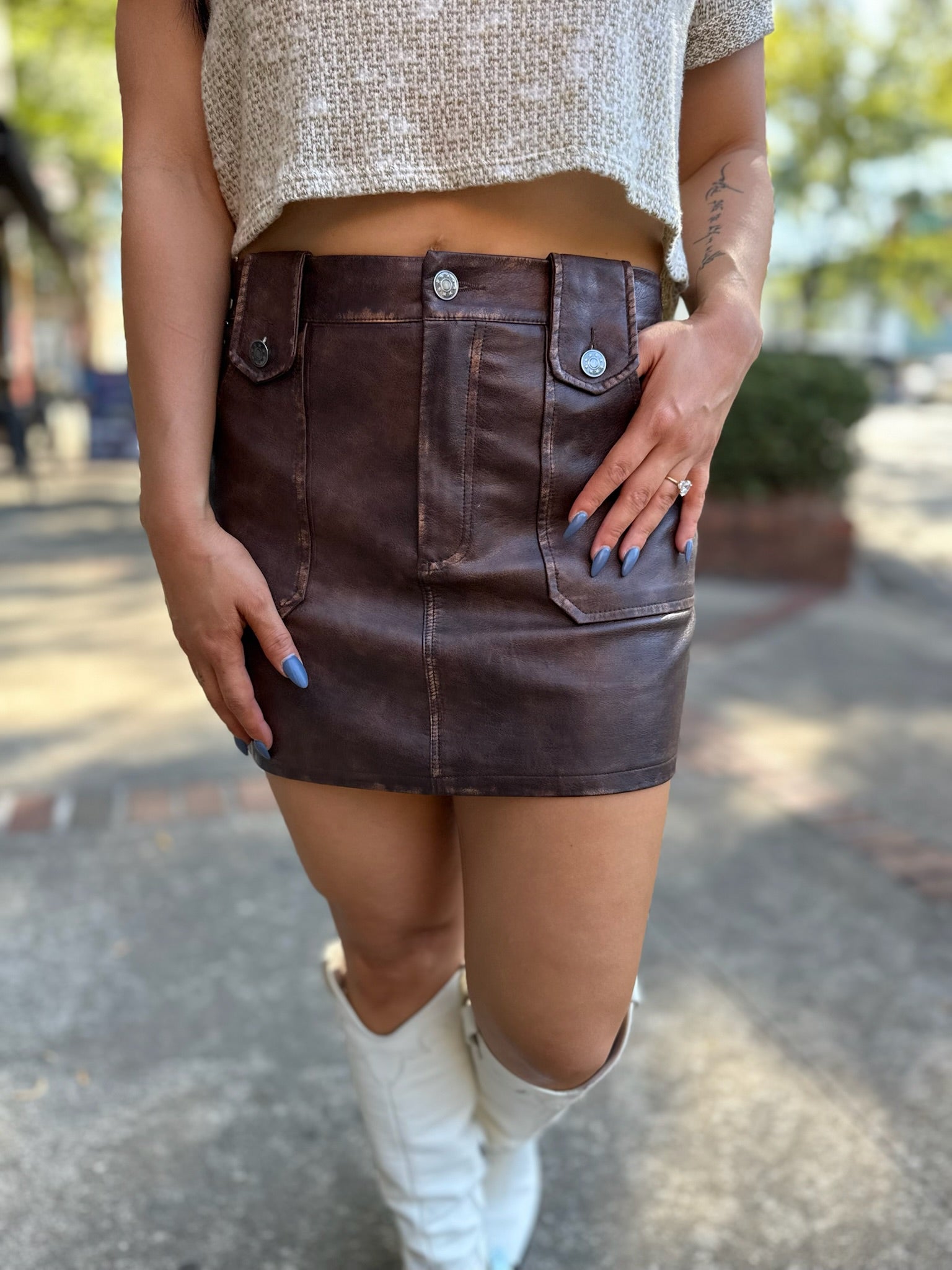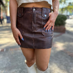 Edgy and versatile, the Rustic Brown Patch Pocket Mini Skirt is crafted in a washed leather-like finish that adds instant cool-girl appeal. Designed with front patch pockets, a button and zip closure, and a flattering high-waist cut, this mini is both functional and stylish. Pair it with a casual tank and boots for a laid-back vibe, or elevate it with a chic blouse for a night out.