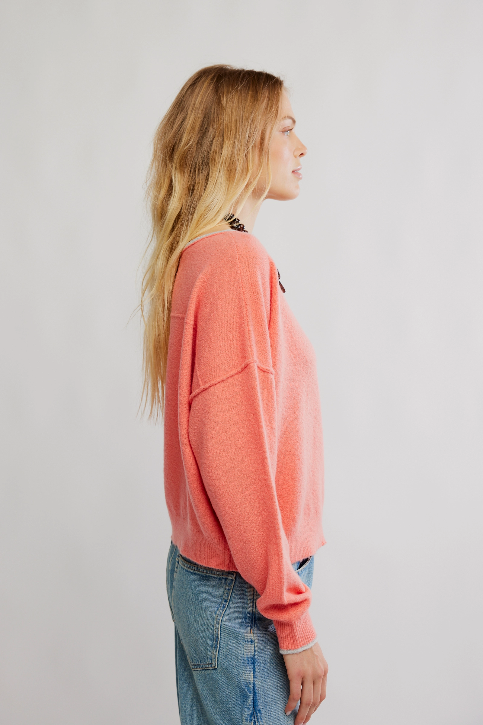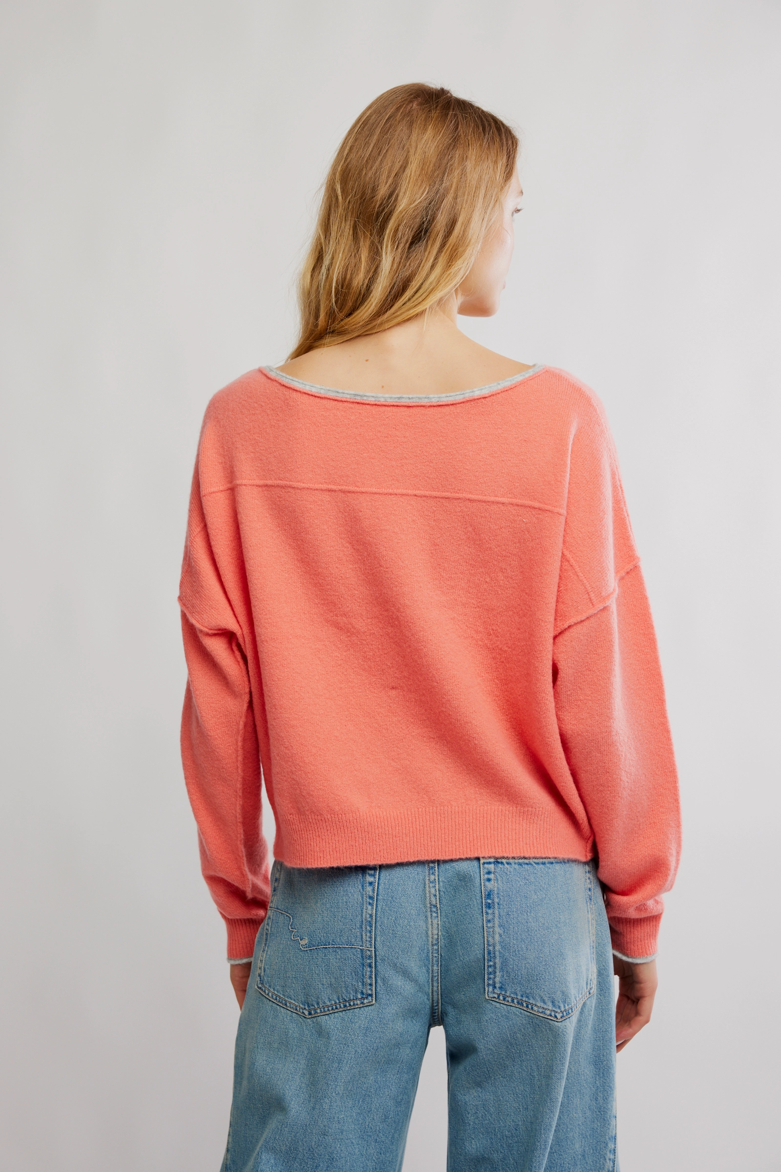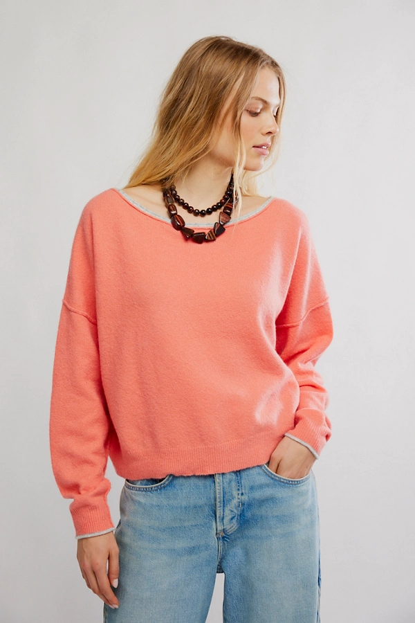 Features: So-soft wool blend, boat neckline, contrasting rolled trims, ribbed hem, drop-shoulder sleeves