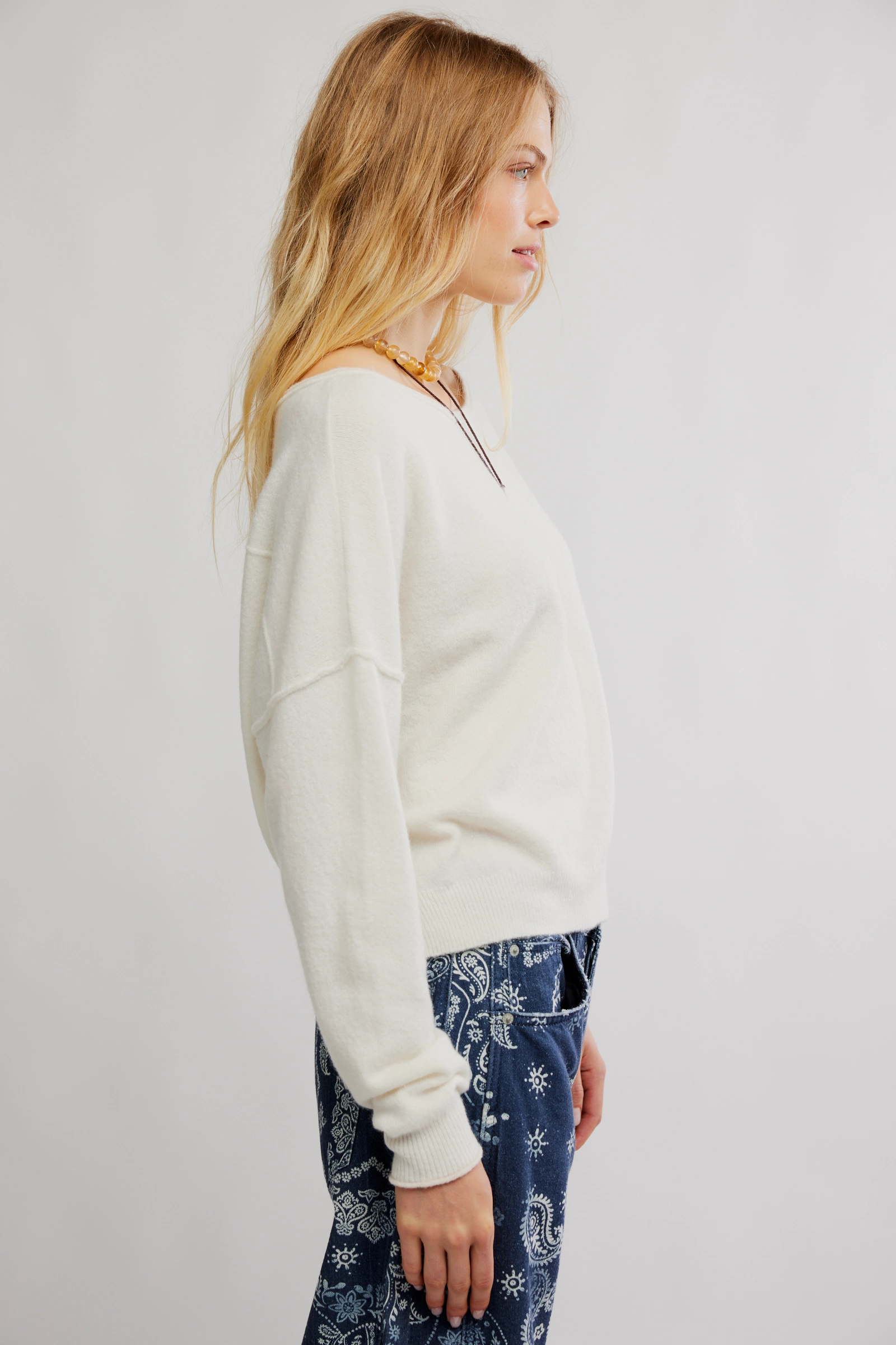Features: So-soft wool blend, boat neckline, contrasting rolled trims, ribbed hem, drop-shoulder sleeves