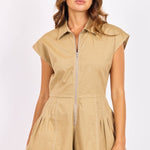 Sporty, structured, and effortlessly cute, the Seedling Contrast Stitch Romper is the perfect one-and-done outfit for warm-weather days. Designed in a versatile khaki tone with ivory contrast stitching, this romper features a polished collared neckline and a sleek zip-front closure for a modern utility-inspired look. The fitted waist and flared short silhouette create a flattering shape, while the cotton blend with a hint of stretch keeps it comfortable and easy to move in. Finished with functional pockets, it’s perfect for weekend plans, casual outings, or vacation styling—just add sandals or sneakers and go.