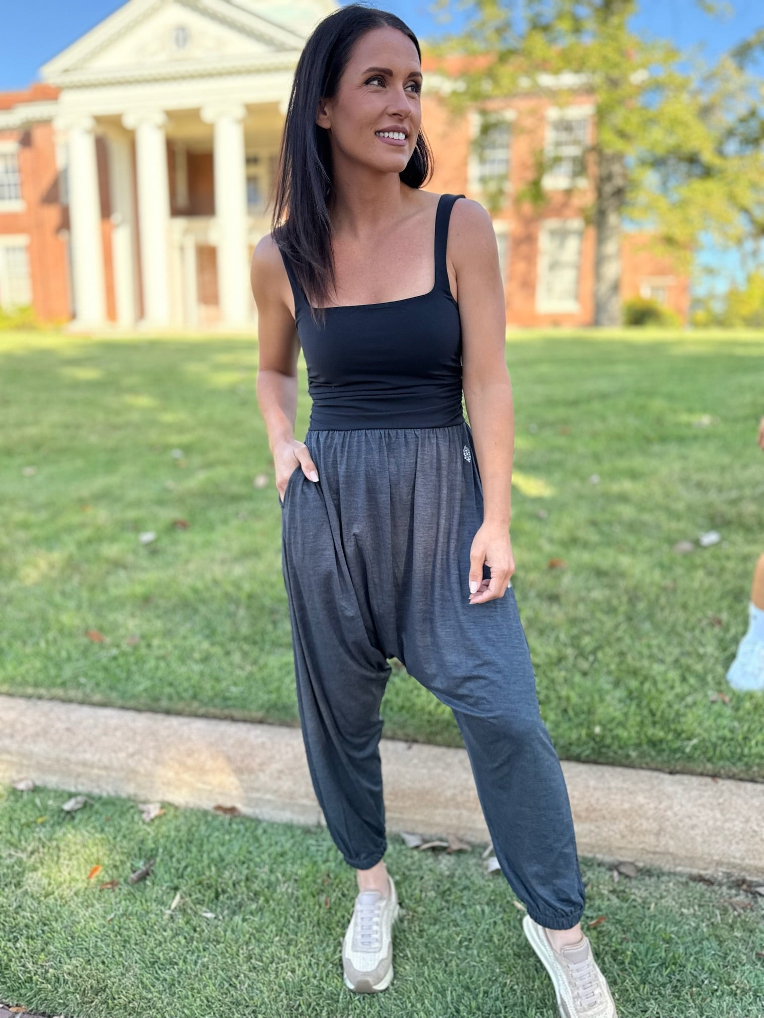 Features: Fitted bodice offers low-impact support; four-way stretch upper; sweat-wicking; jersey fabrication bottoms; relaxed harem fit; subtle shine