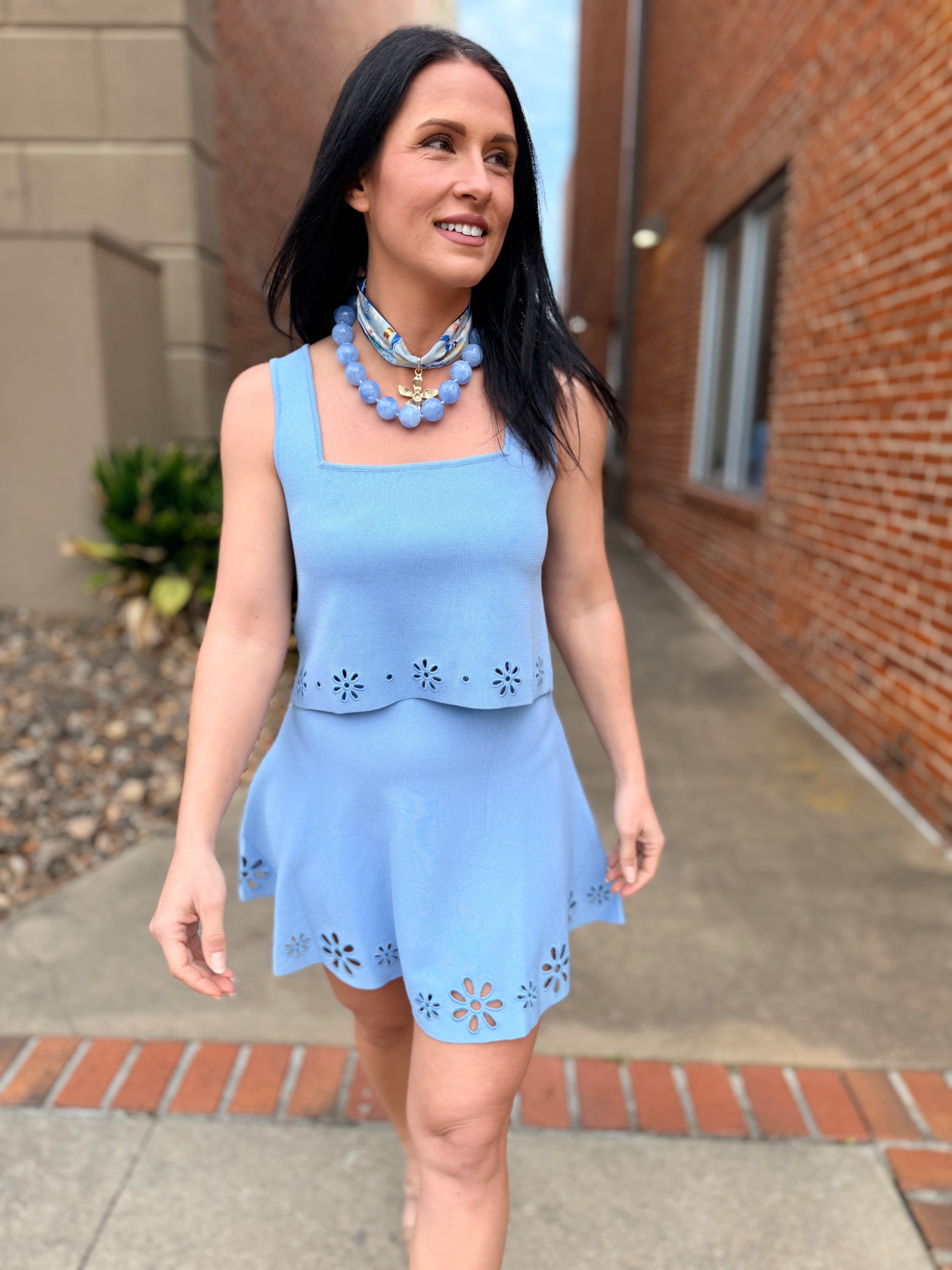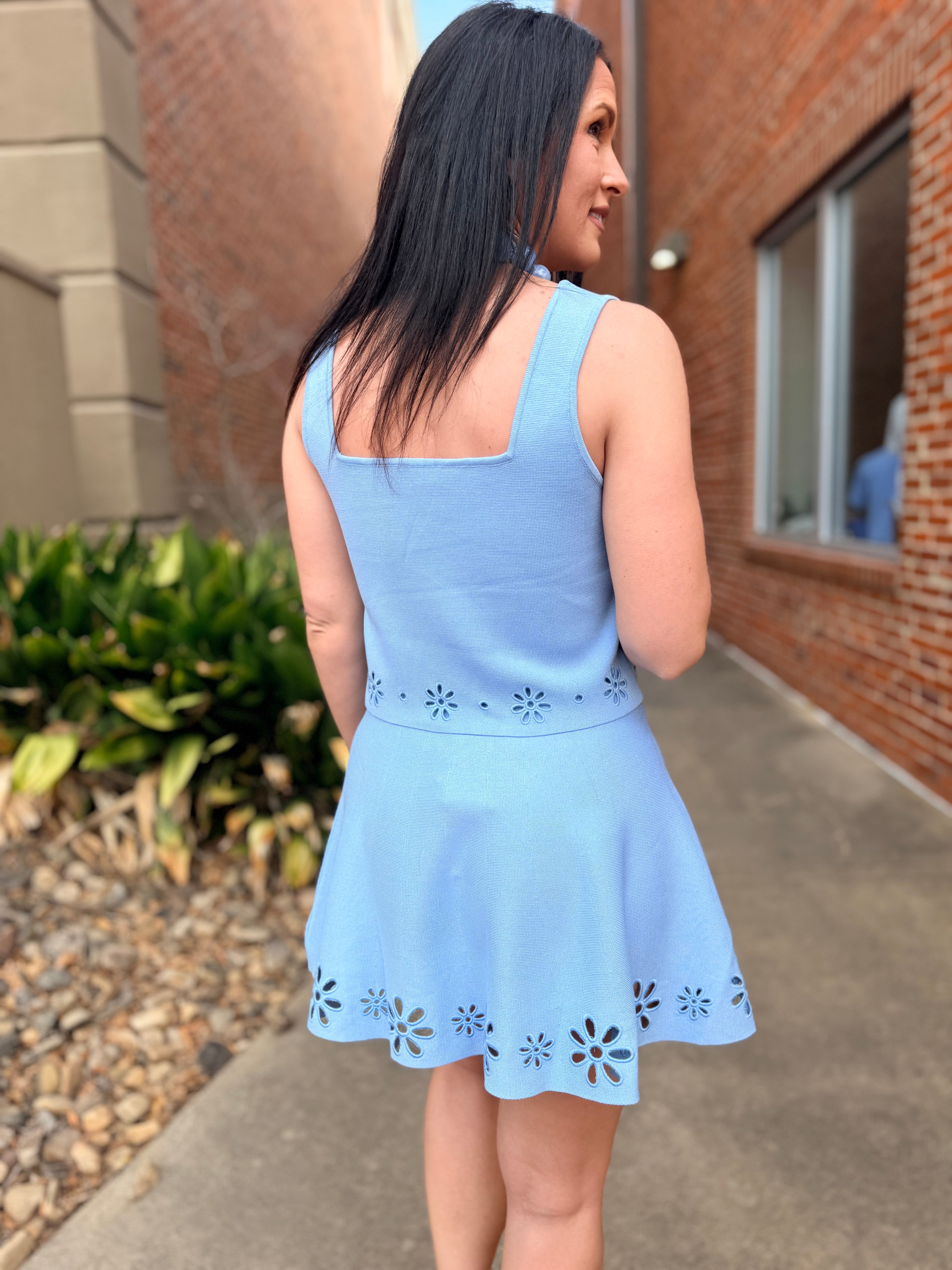 This top is the definition of effortless charm. Designed with a clean square neckline and wide straps, it offers a flattering, modern silhouette that feels both polished and easy to wear. The delicate floral cutout detail along the hem adds a playful, feminine finish that instantly elevates the look. Crafted in a structured knit, it holds its shape beautifully while staying comfortable all day long. Style it with the matching skirt for a head-turning set, or pair it with denim or trousers for a chic, standalone moment.