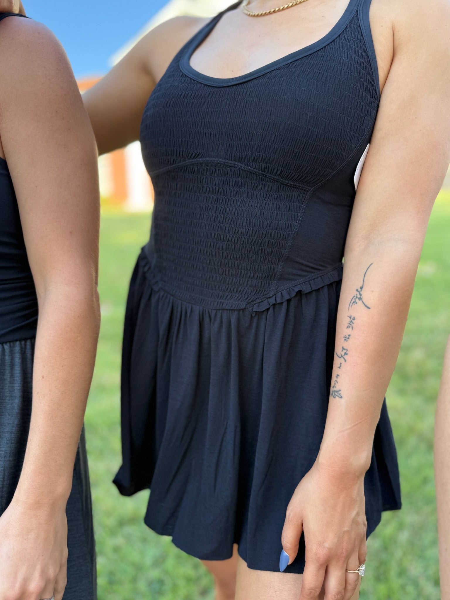 Features: Lightweight, soft fabrication is sweat-wicking; built-in shorty bodysuit (bra and shorts) for added coverage; smocked front with elasticated ruching; sweetheart-neck; cross-back strap detail; built-in shorts feature phone pocket; corset-style detailing