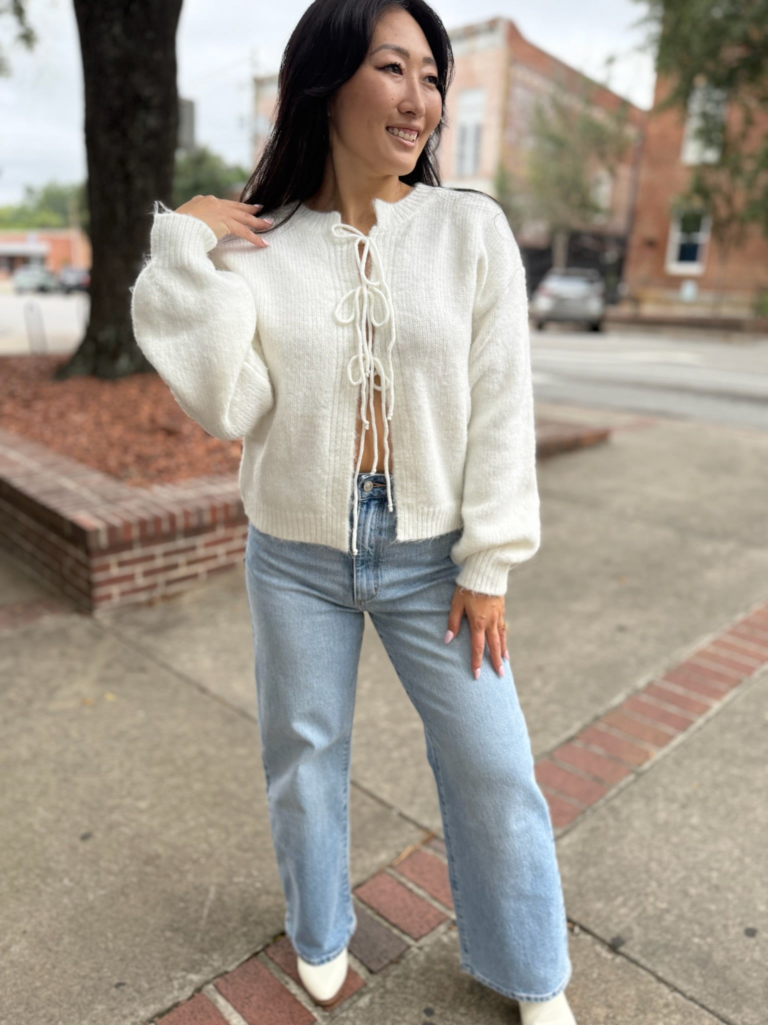 Wrap yourself in cozy-chic perfection with Snowfall Soft Tie-Front Cardigan. This dreamy ivory knit features playful front ties, a relaxed silhouette, and a slightly cropped cut for that effortless, model-off-duty vibe. Whether layered over a bralette for a flirty flair or thrown on with your favorite high-rise pants, this cardigan brings just the right amount of warmth and style to every outfit. It’s the statement sweater you didn’t know you needed—but won’t want to take off!