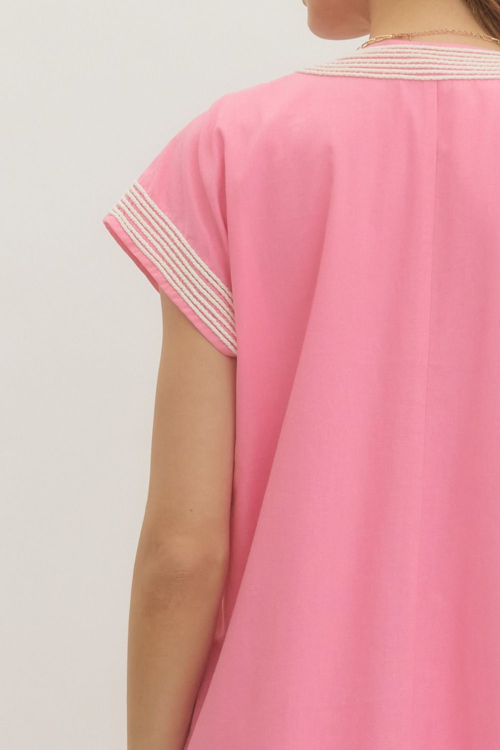- Featuring a V-neckline with geometric applique trim.