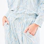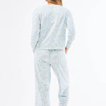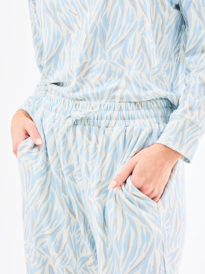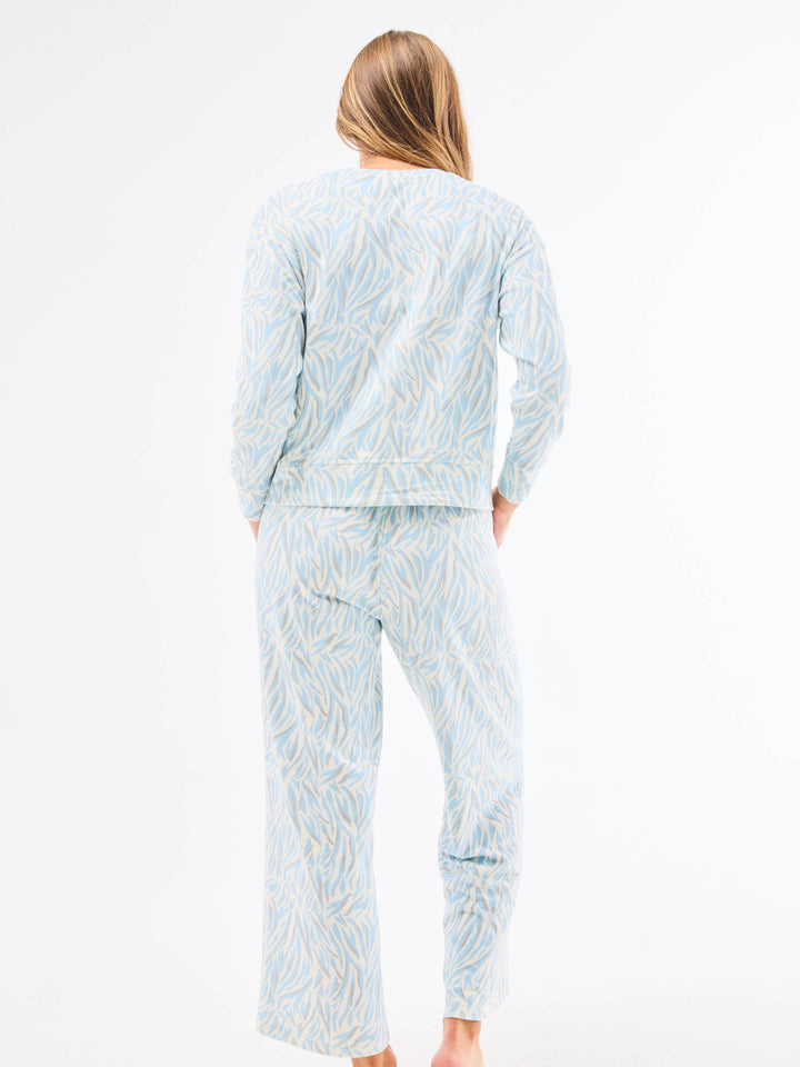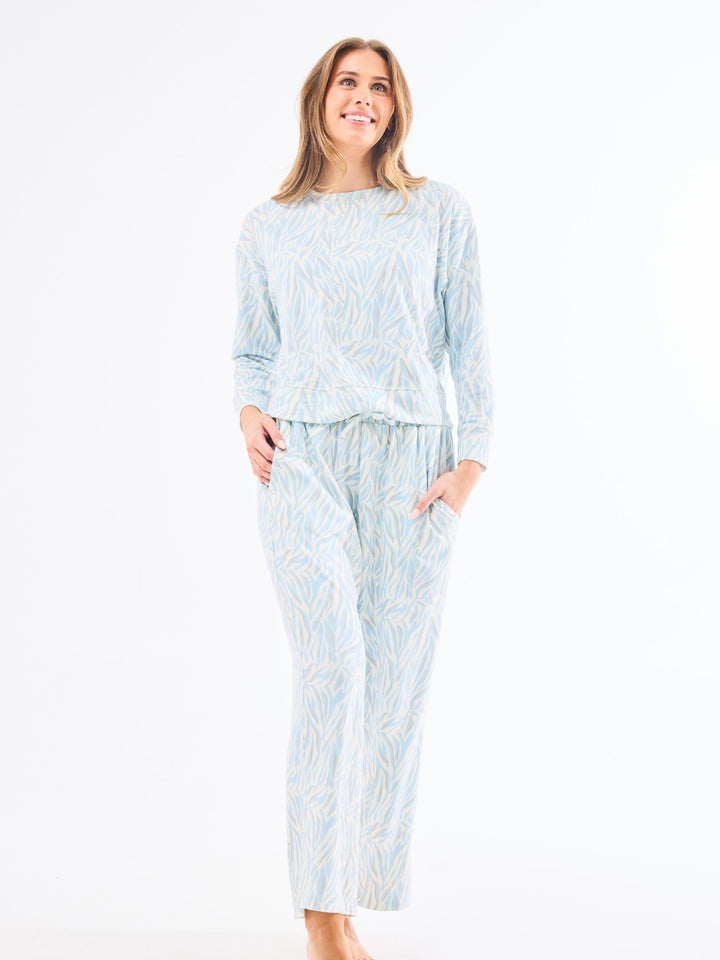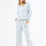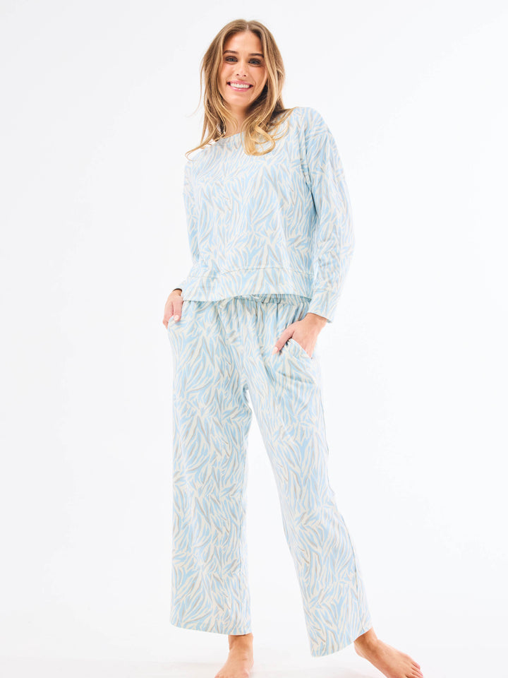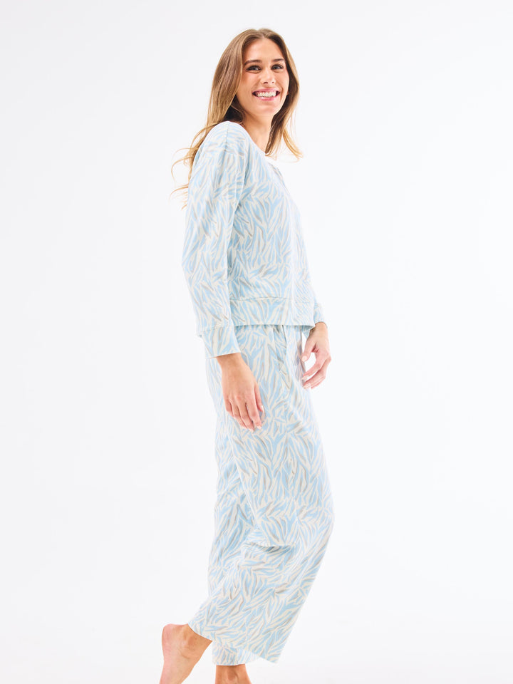 This cozy pajama set is designed for ultimate comfort and effortless style. It features a relaxed long-sleeve top and wide-leg pants, both adorned with a soft blue and white abstract leaf pattern that adds a fresh, calming touch. The top offers a loose, boxy fit with a subtle drop shoulder, while the pants include an elastic waistband and side pockets for added convenience. Made from lightweight, breathable fabric, this set is perfect for lounging at home or enjoying a restful night's sleep in style.