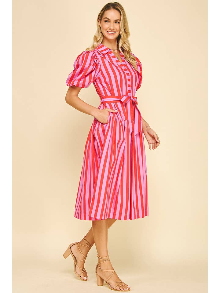 Fresh, flattering, and effortlessly wearable—this striped midi dress is a warm-weather must-have. Crafted from breathable 100% cotton, it features a classic collar with a feminine V-neckline for a polished yet relaxed look. Statement balloon sleeves add a touch of volume, while the adjustable self-tie waist creates a flattering silhouette. Finished with convenient side pockets and a versatile midi length, this dress is perfect for spring and summer days, from casual outings to weekend getaways.