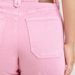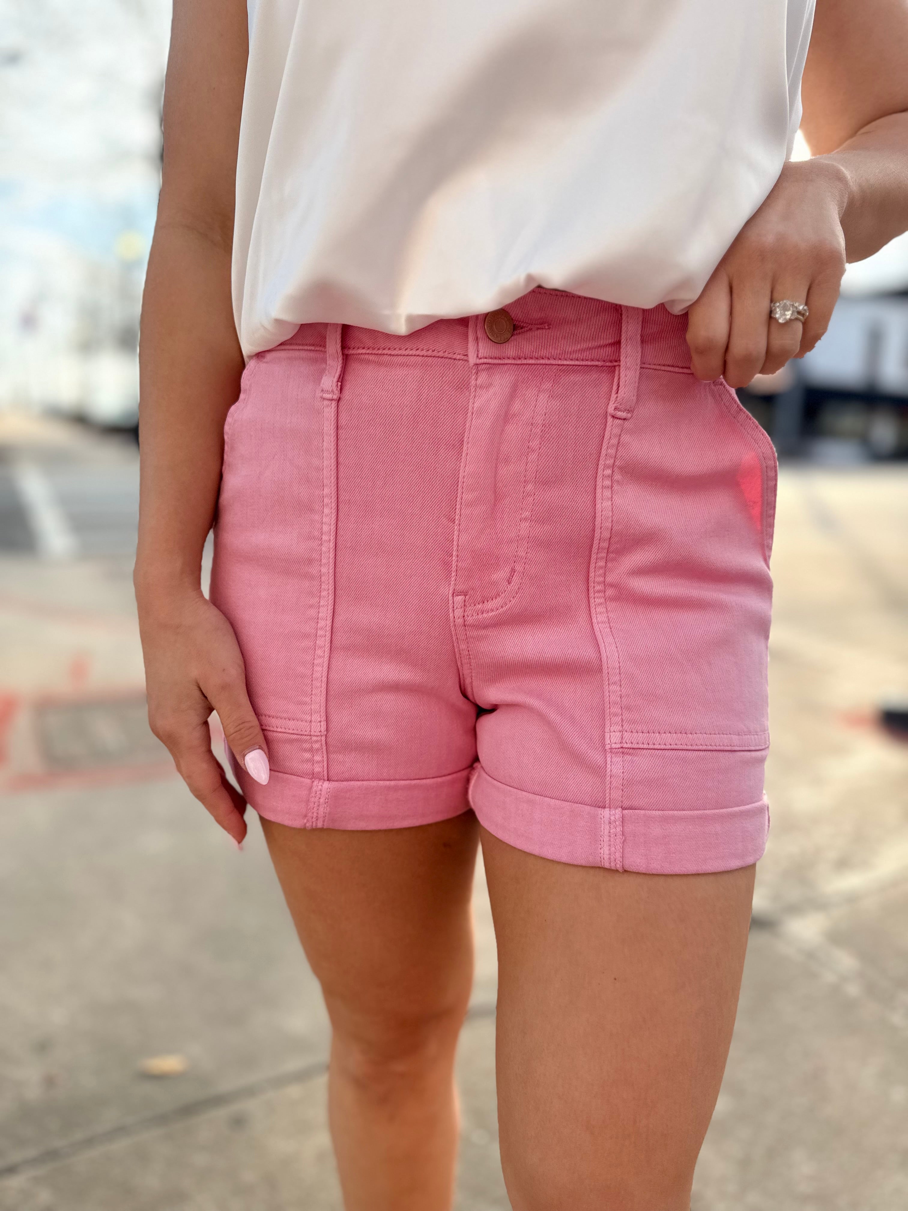 Add a fun pop of color to your warm-weather wardrobe with these High-Rise Aurora Weekender Shorts. Designed with a flattering high waist and a clean, structured fit, this pair features a chic double rolled cuff that gives them a polished, put-together look. The soft cotton-blend denim with a touch of stretch keeps you comfortable while still holding its shape—perfect for all-day wear. Whether you’re headed to brunch, a weekend getaway, or just soaking up sunshine, these shorts are the ultimate easygoing staple.