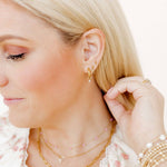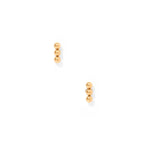 These earrings feature sleek, minimalist gold screwback studs with a unique design. The studs are structured with a horizontal bar and two small spheres, one at each end, giving them a modern, geometric look. Their simple yet stylish design makes them a versatile accessory that pairs well with a variety of outfits, adding a touch of sophistication and subtle elegance.