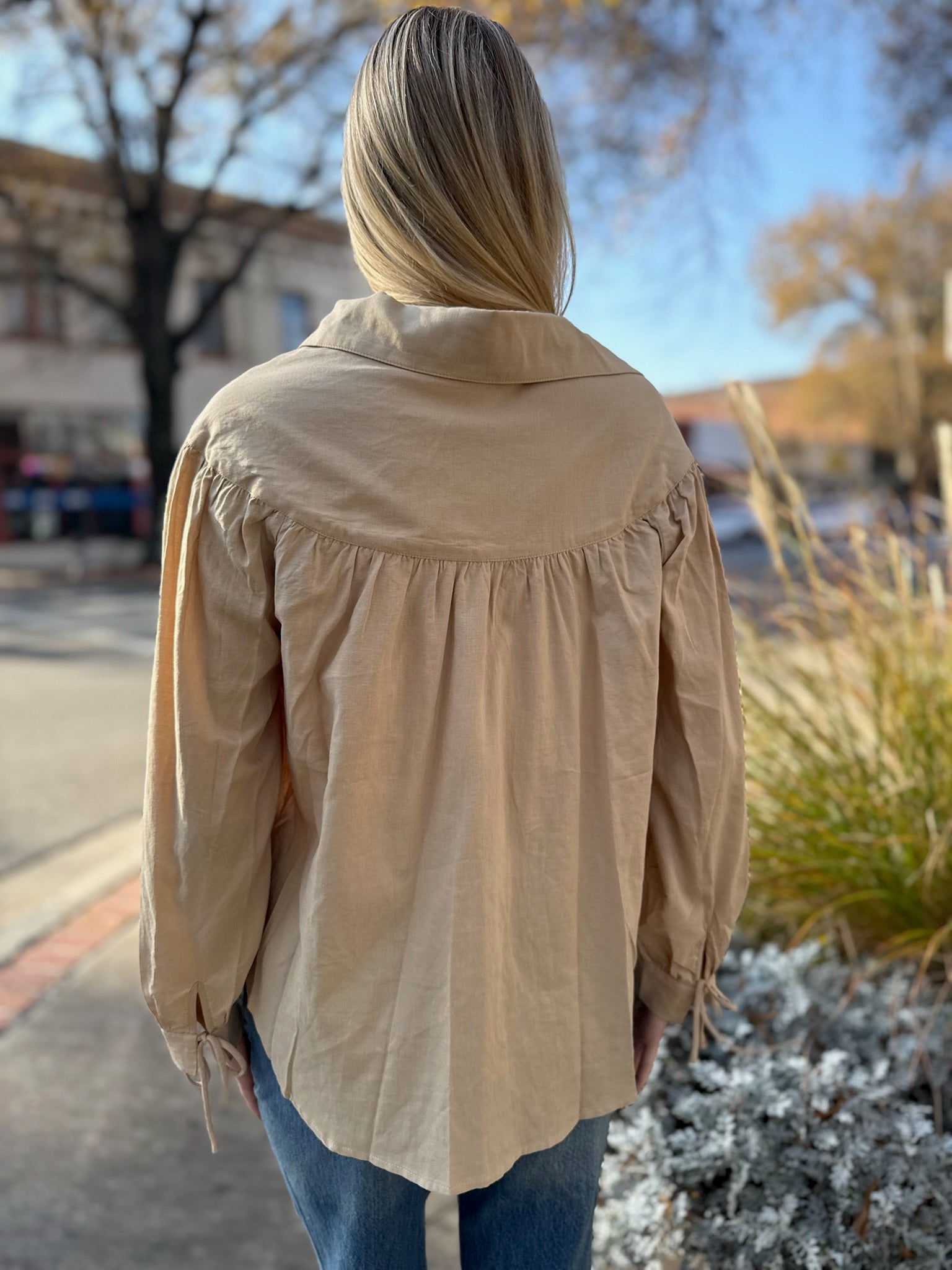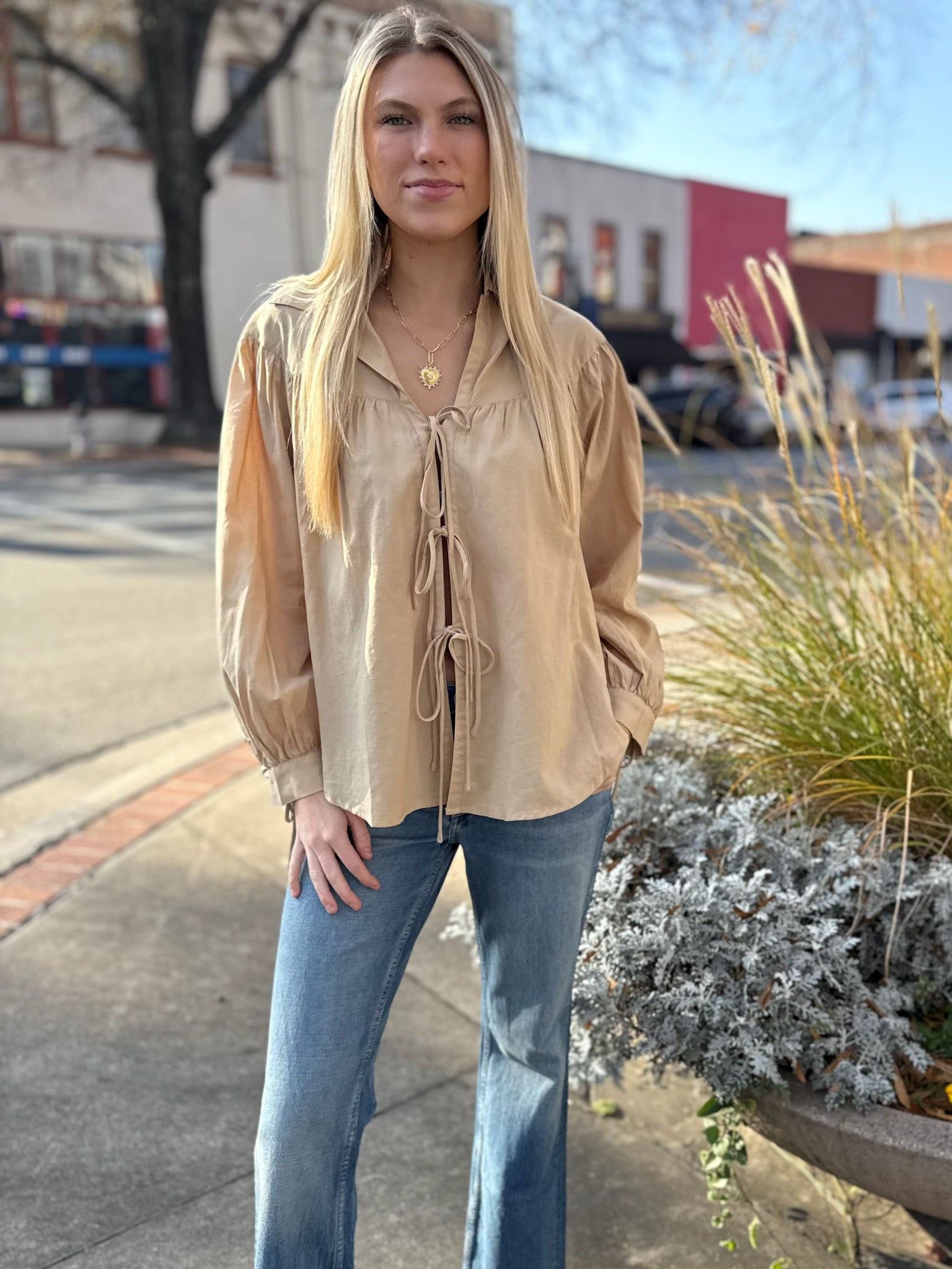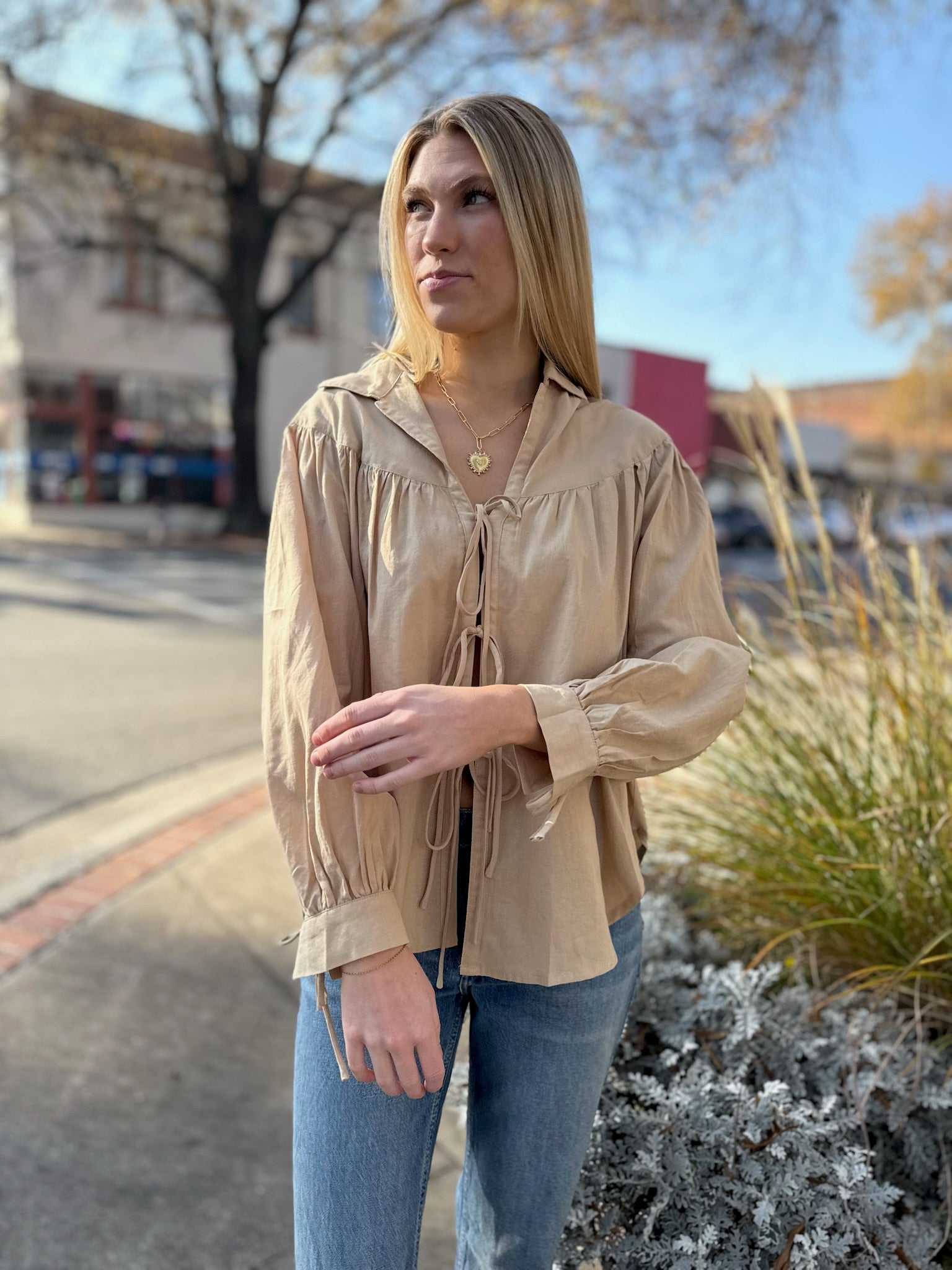 Relaxed yet refined, this Taupe blouse features a button-front design with soft pleating that drapes effortlessly. Its long sleeves and collared neckline add a touch of polish, making it versatile for both workwear and casual styling. A timeless wardrobe essential that pairs seamlessly with denim or tailored bottoms.