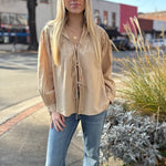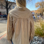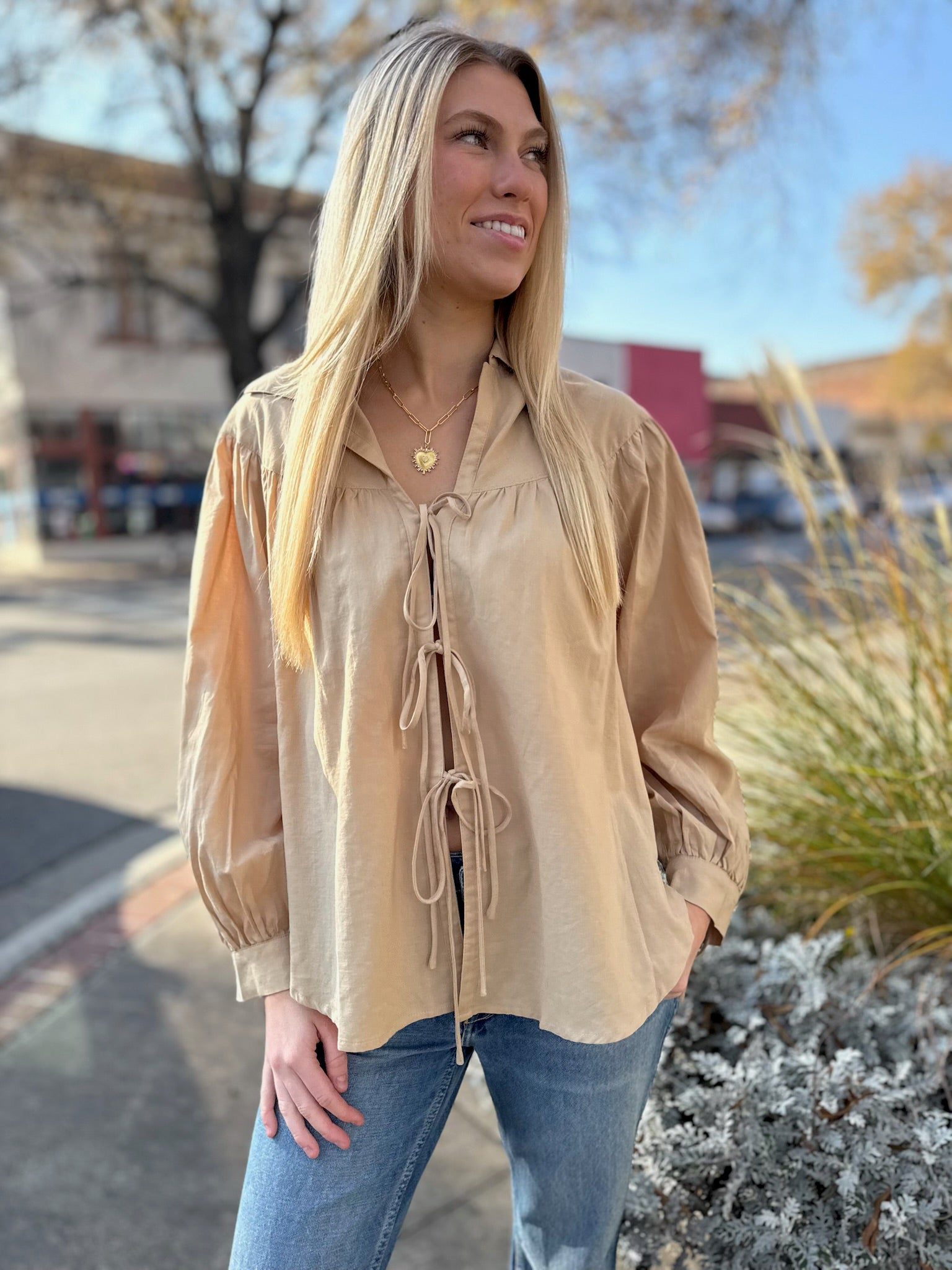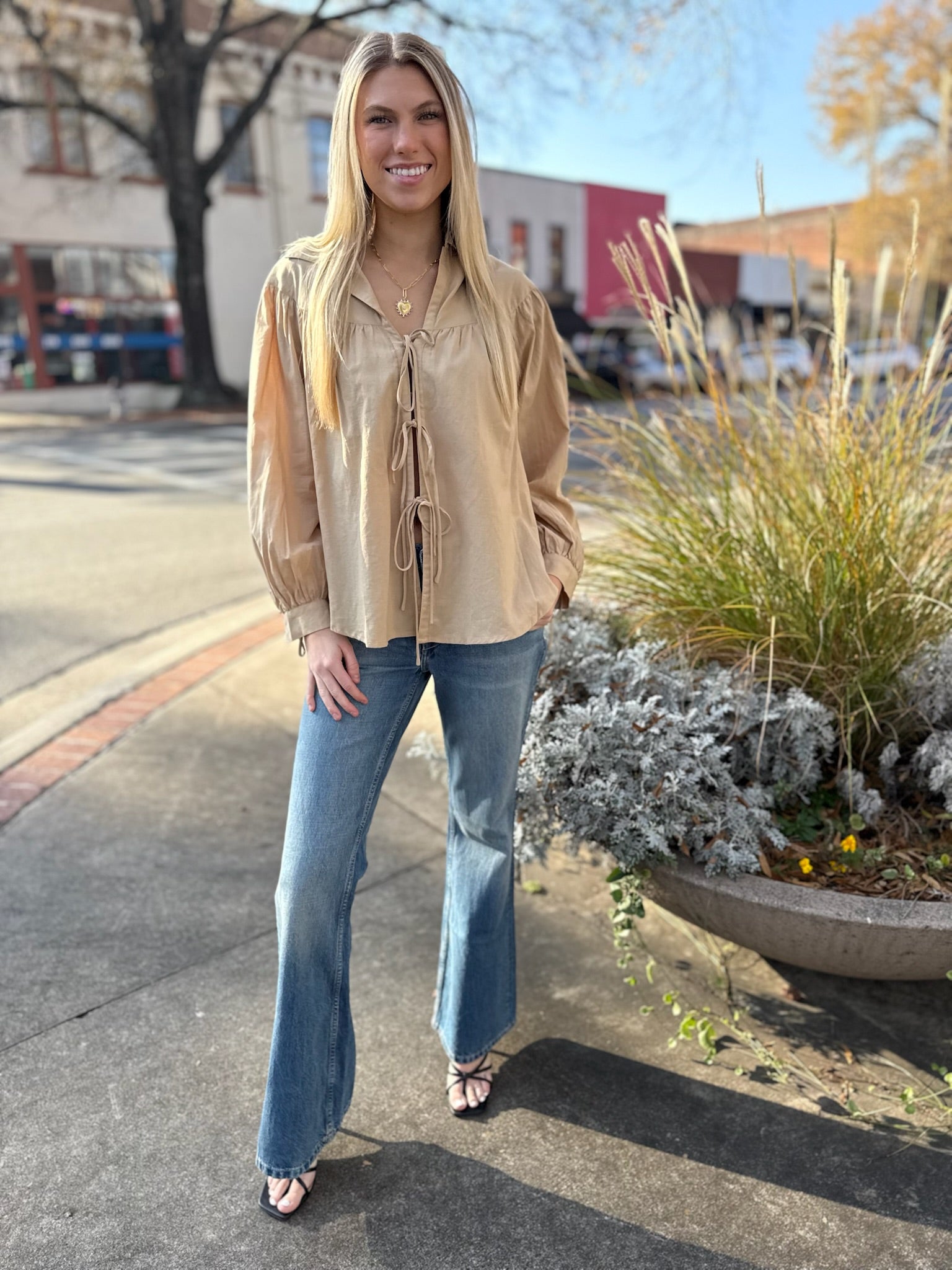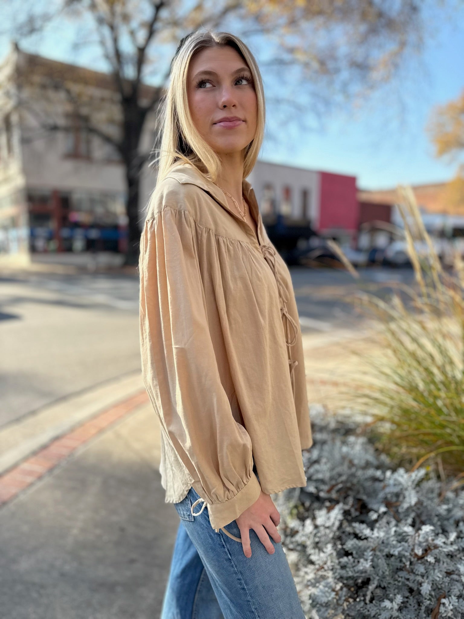 Relaxed yet refined, this Taupe blouse features a button-front design with soft pleating that drapes effortlessly. Its long sleeves and collared neckline add a touch of polish, making it versatile for both workwear and casual styling. A timeless wardrobe essential that pairs seamlessly with denim or tailored bottoms.
