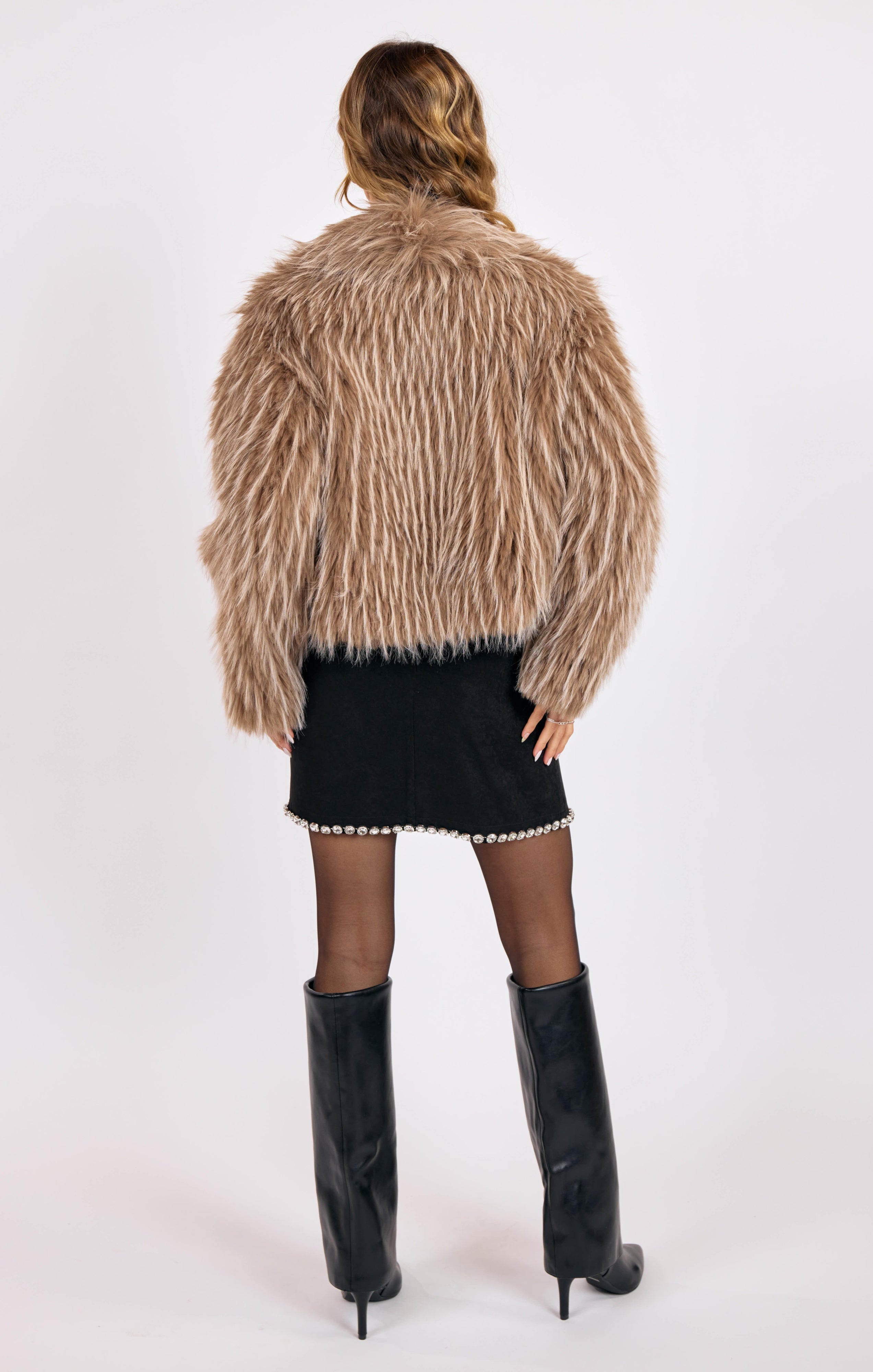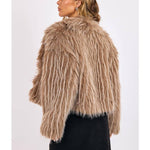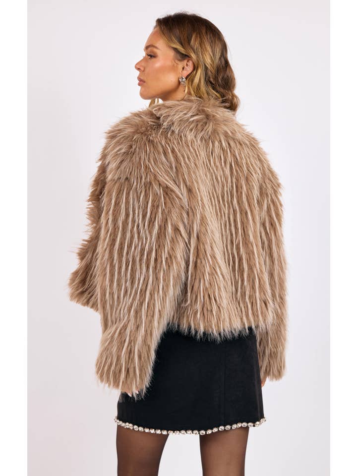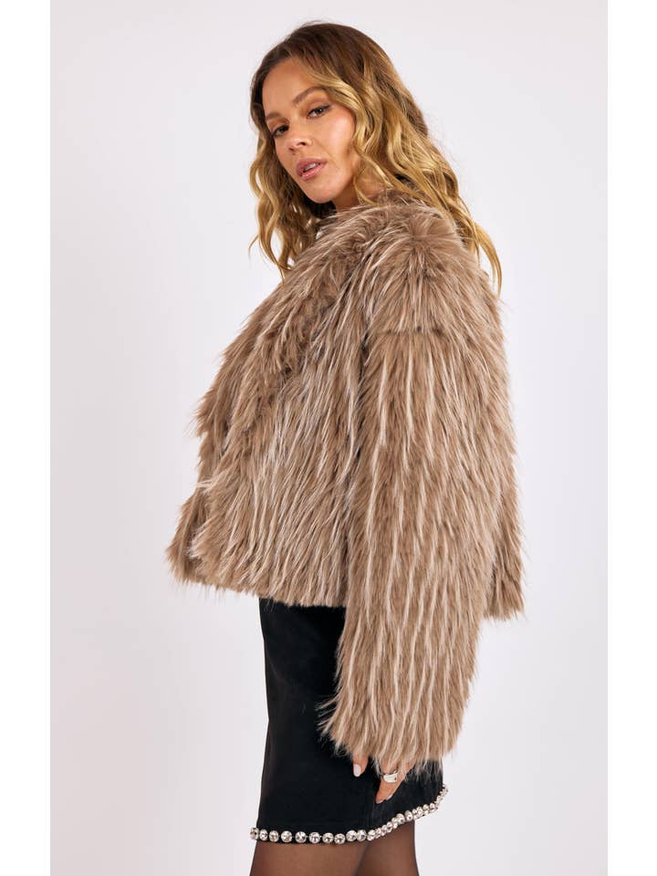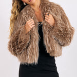 Make a bold statement with this luxe faux fur jacket, crafted in a rich taupe two-tone design that exudes effortless glamour. With its plush texture and modern cropped fit, it’s the perfect layering piece to elevate any look—from casual denim to a sleek night-out dress. Soft, stylish, and unforgettable, this jacket radiates pure ladylike energy.