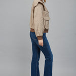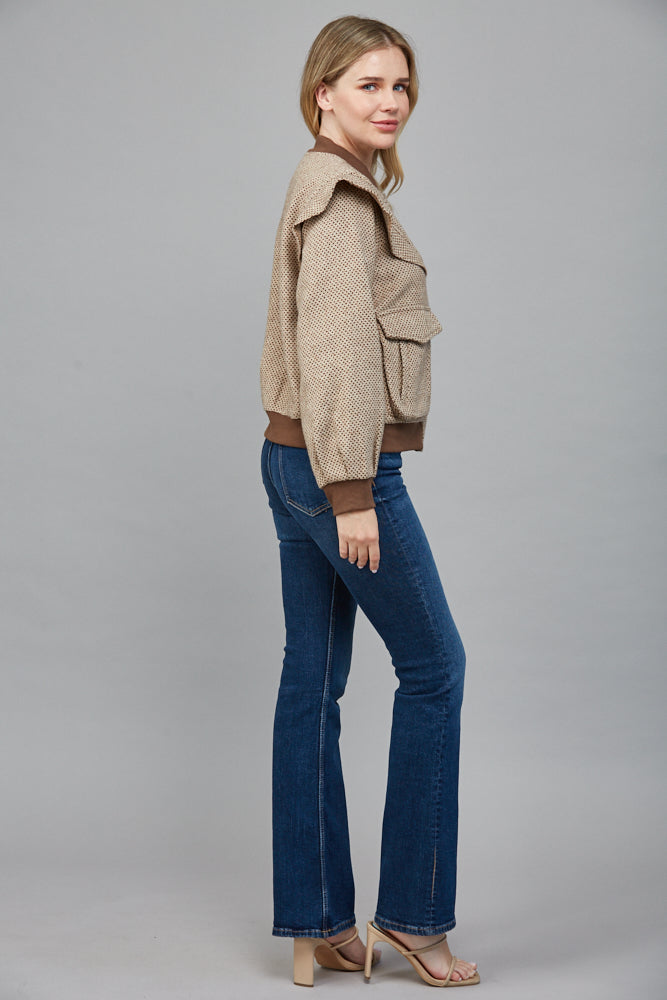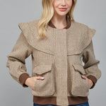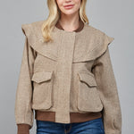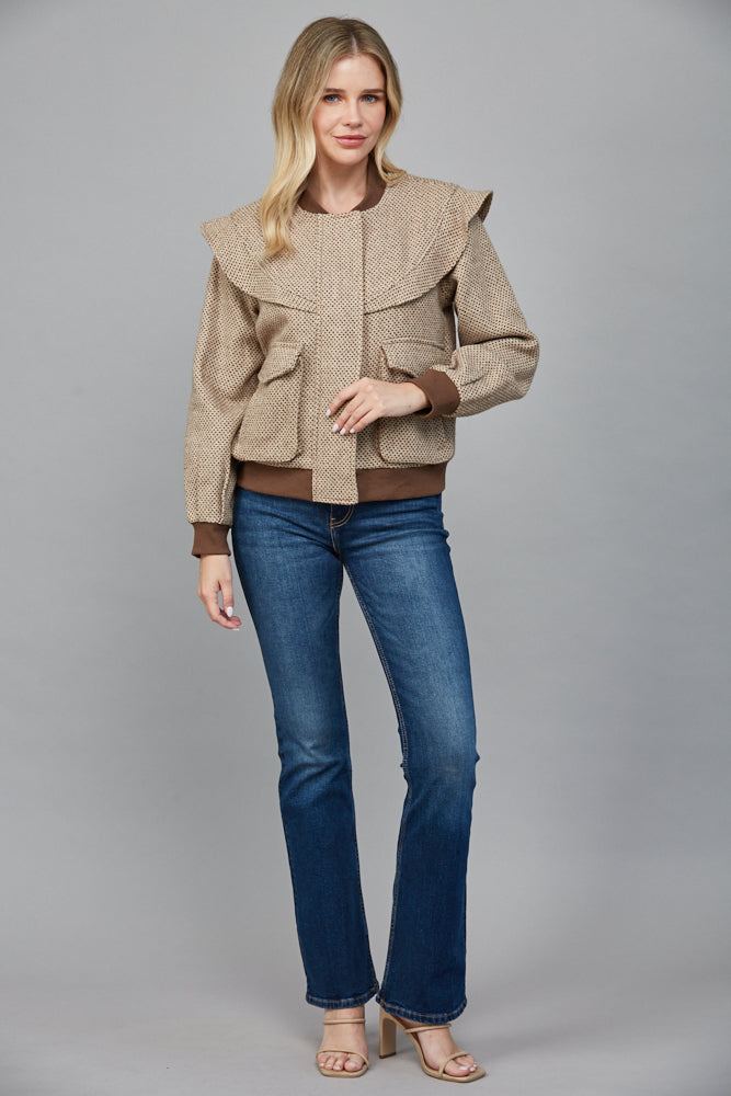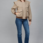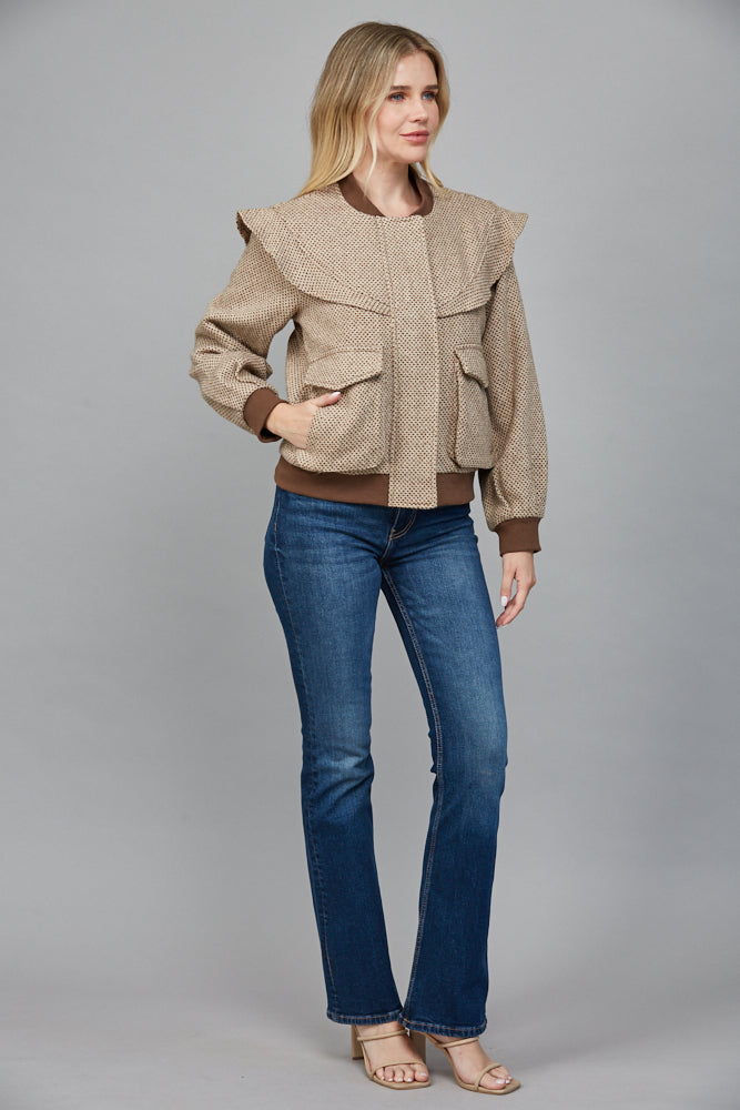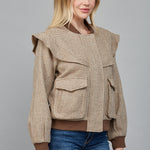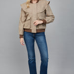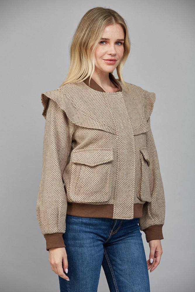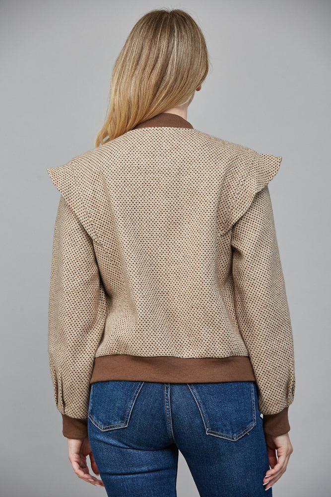 Taupe/Brown Perforated Pattern Ruffle Detail Bomber Jacket