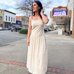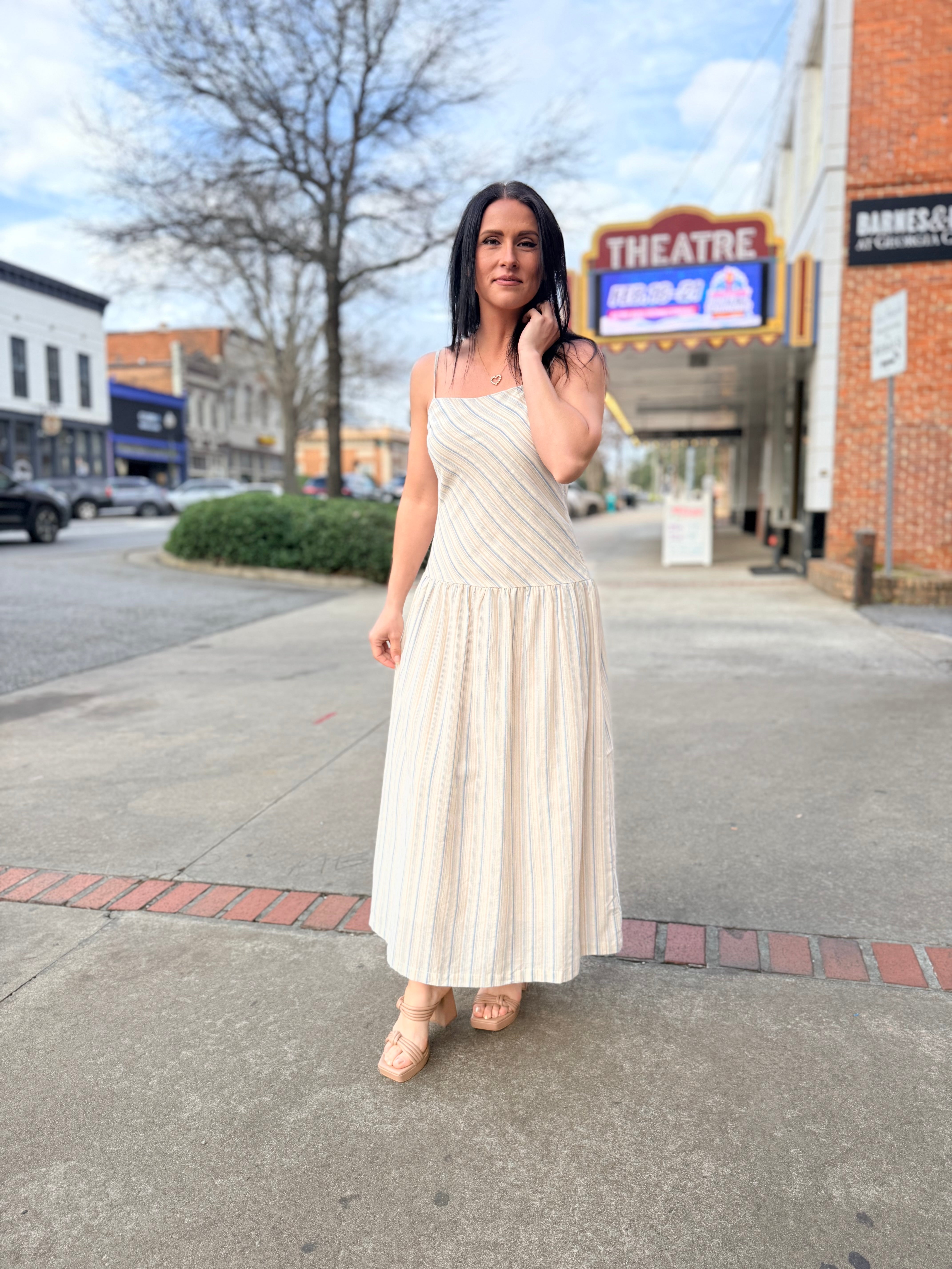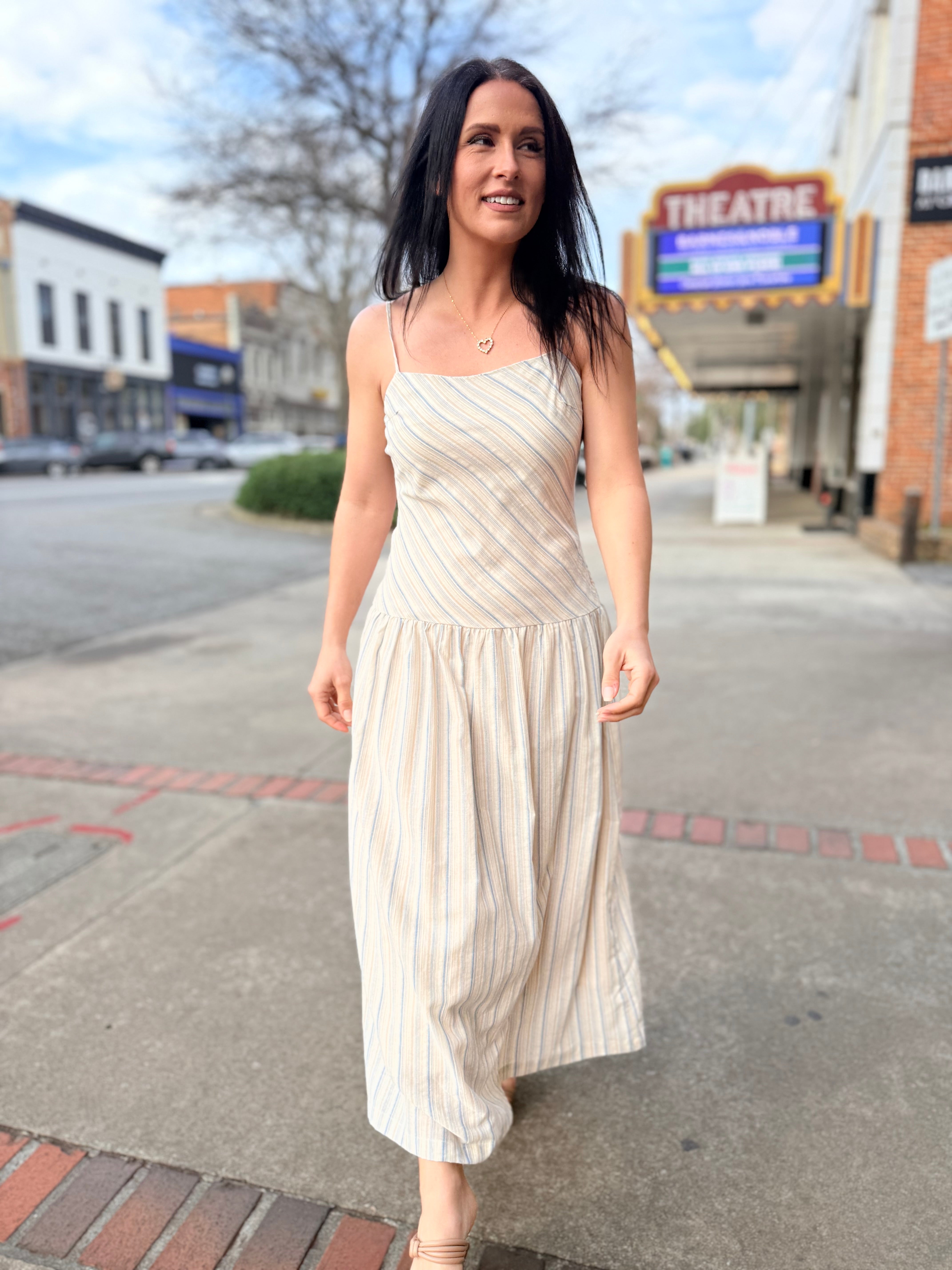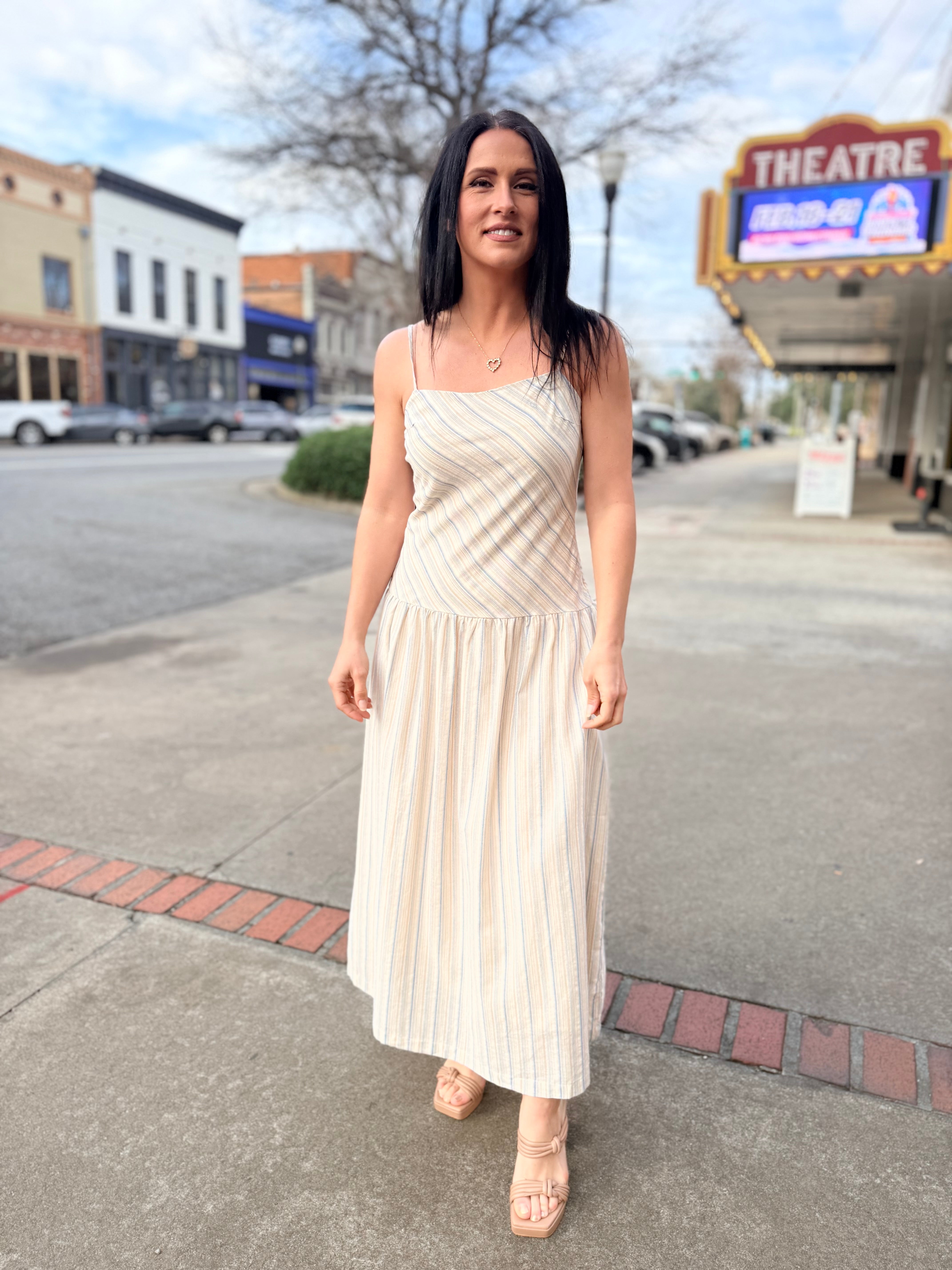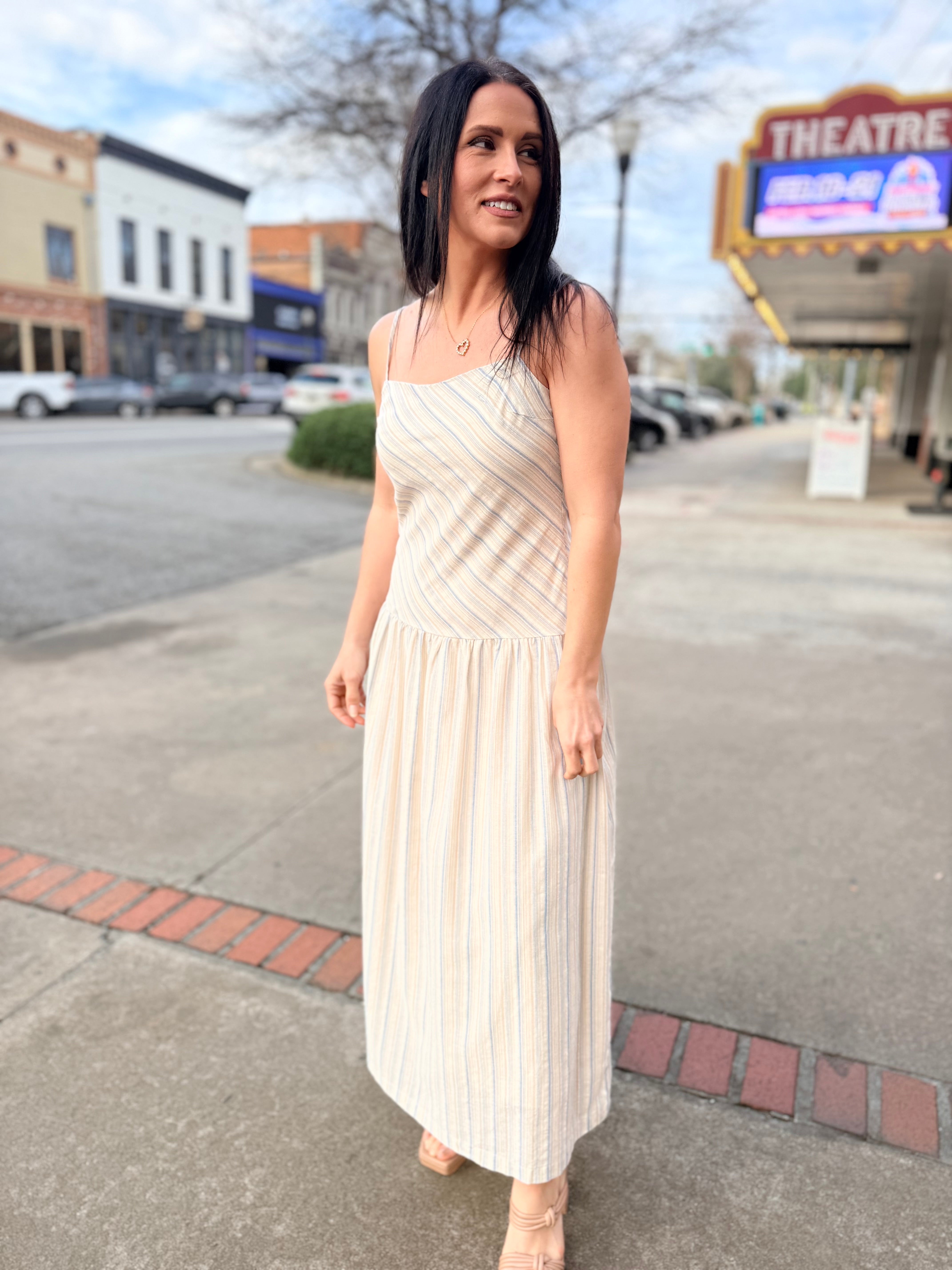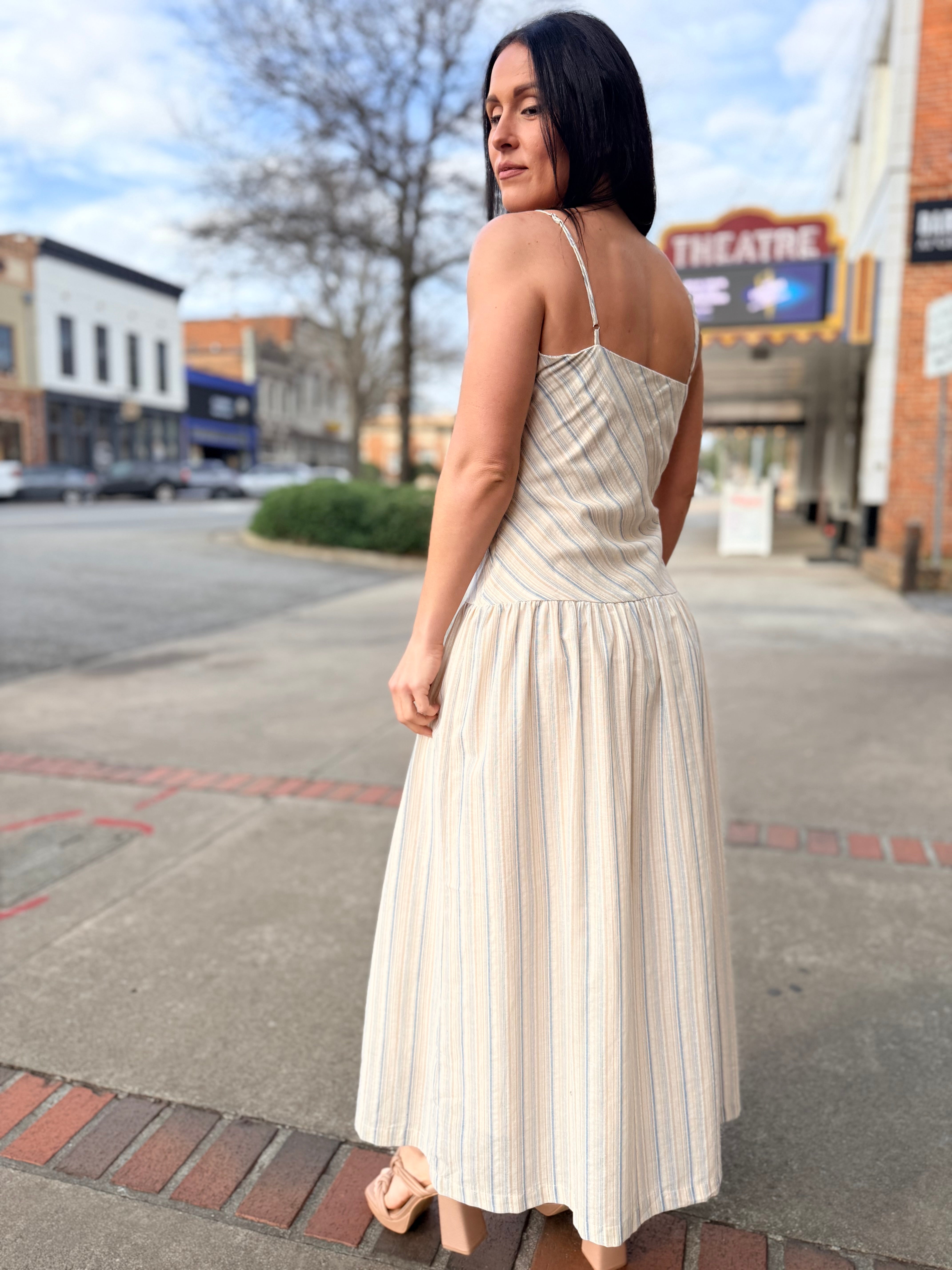 Light, breezy, and effortlessly elegant, The Lands Maxi Dress is a warm-weather essential made for easy days and sunny getaways. Designed in a soft blue multi stripe, this sleeveless maxi silhouette features a clean straight neckline with delicate spaghetti straps and a flattering relaxed fit that flows into a full-length skirt. Crafted from breathable 100% cotton with a comfortable stretch lining, it’s perfect for all-day wear while staying polished and comfortable. Pair it with sandals for a casual look or dress it up with wedges and accessories for an elevated summer moment.