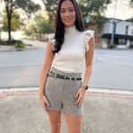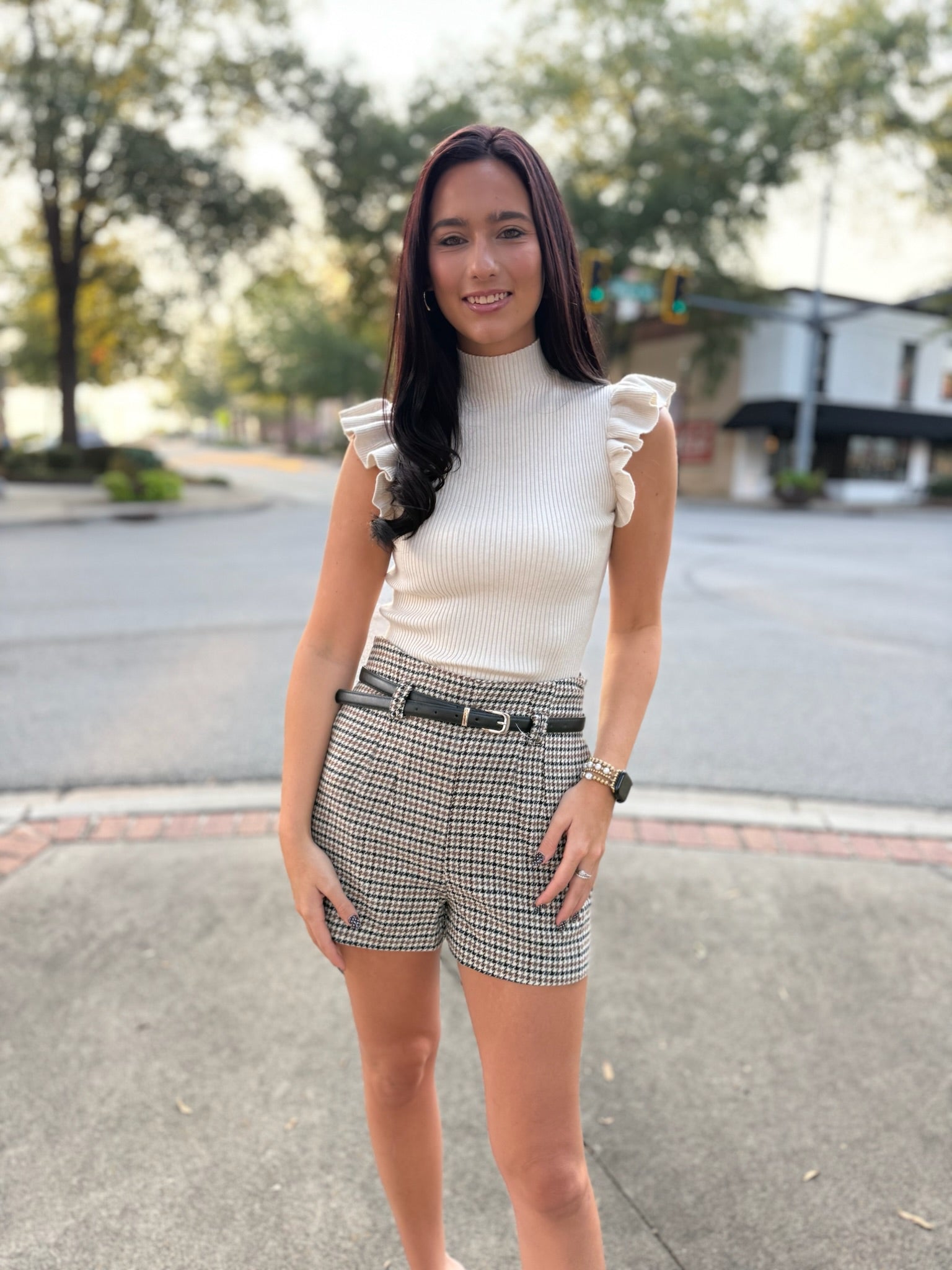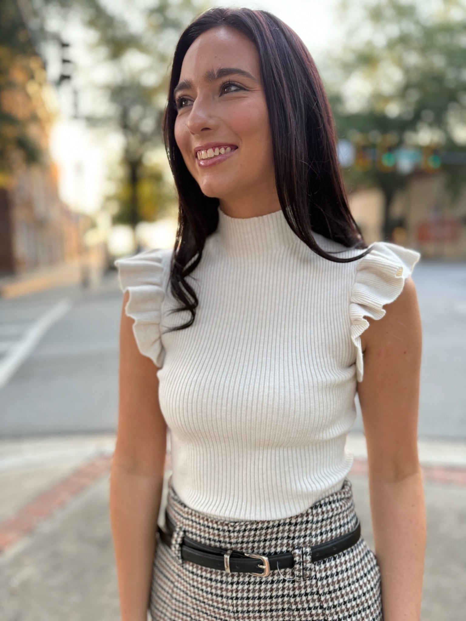 This chic sleeveless knit top blends elegance with ease, featuring a ribbed texture that flatters the figure and a modern mock neckline for a refined touch. The standout detail—soft ruffle shoulders—adds a playful yet sophisticated edge, perfect for pairing with tailored trousers or high-waisted denim. A versatile neutral hue makes this a year-round essential, taking you seamlessly from desk to dinner.