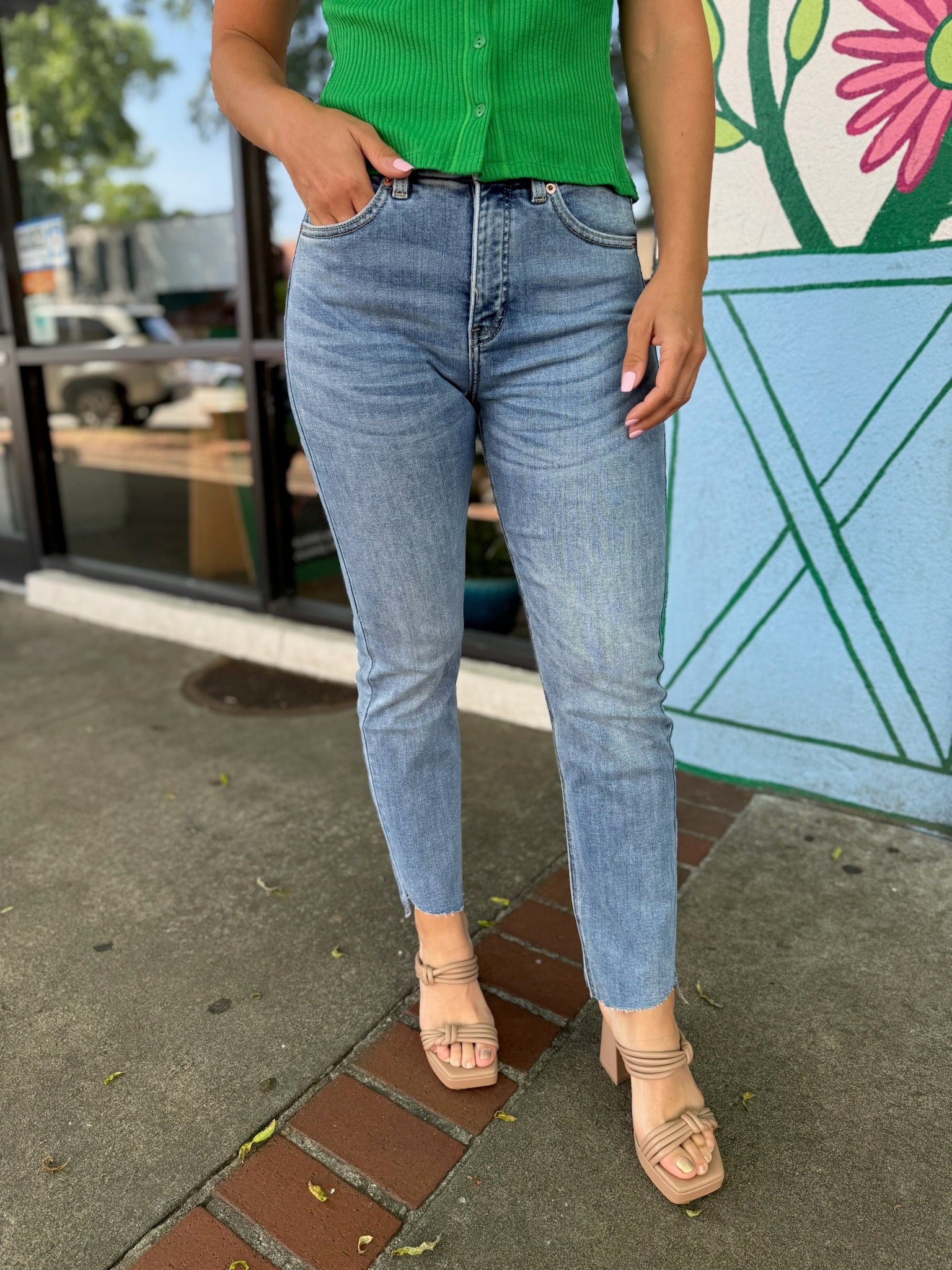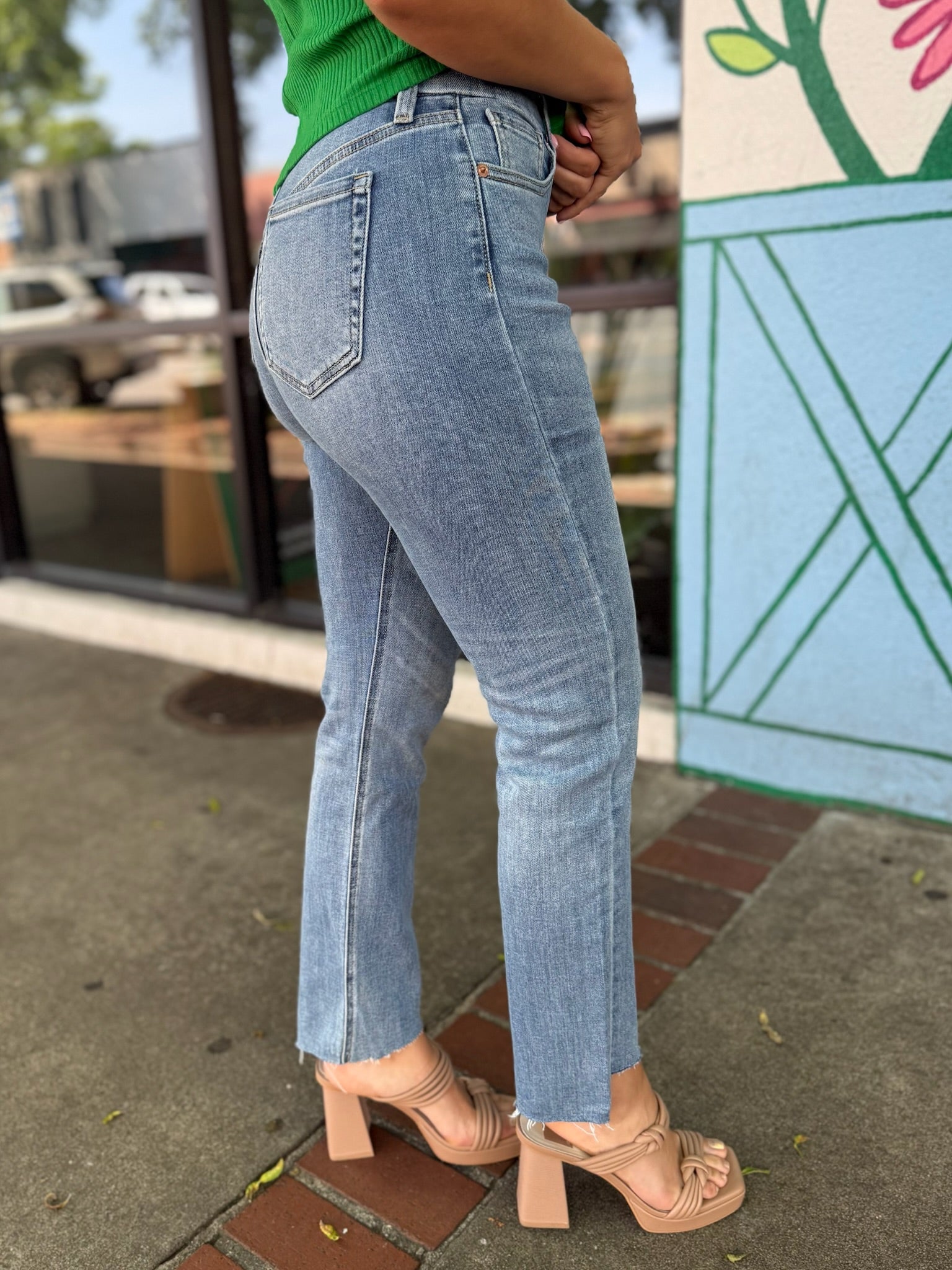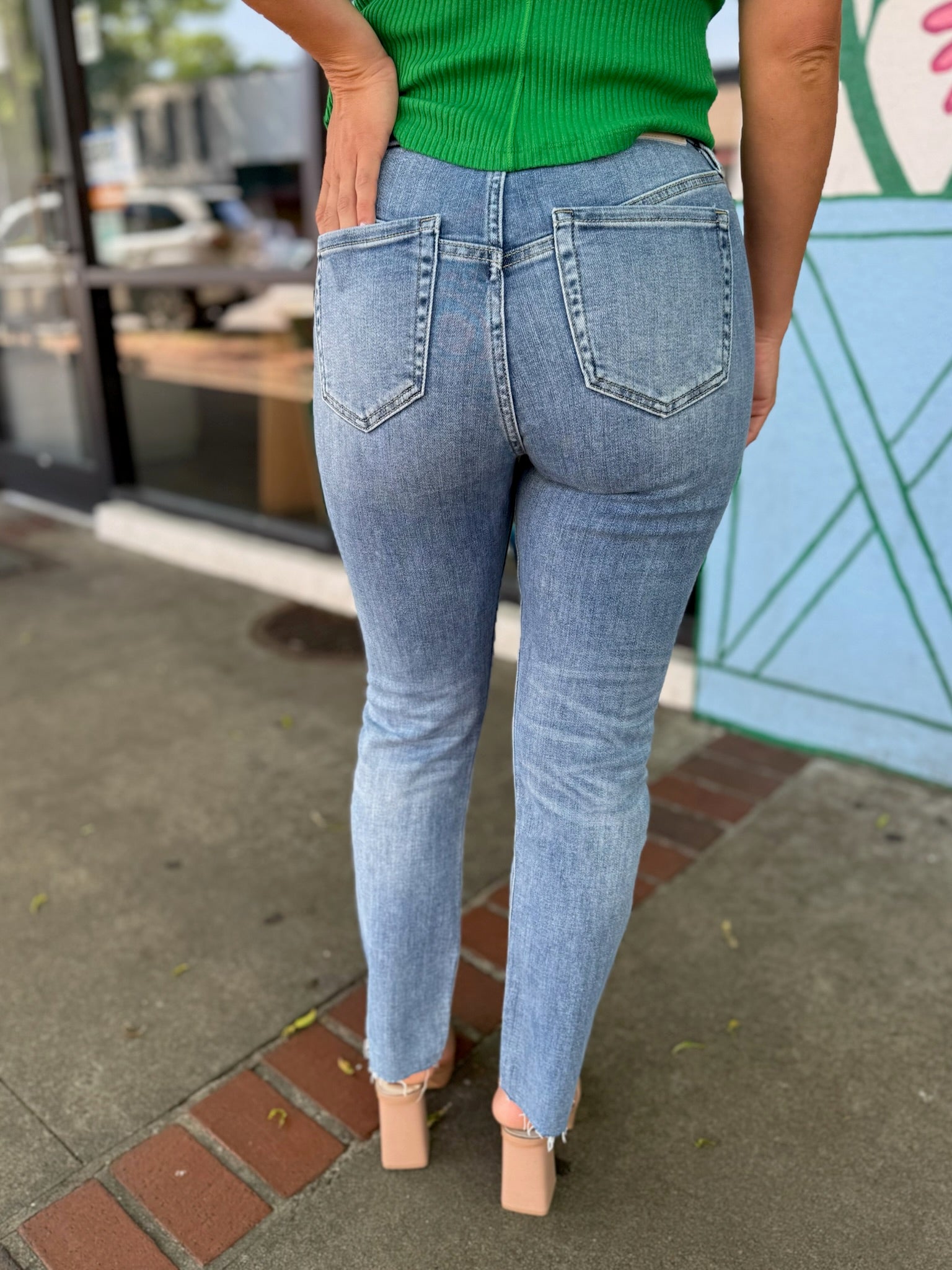 The Tummy Control Denim has innovative technology that will flatter your fit giving you confidence in every step. Inner pocket bags are sewn to the J Stich creating a tight tuck-in on the midsection. A gap-proof waistband in smoothing denim. This will be your new favorite fit.