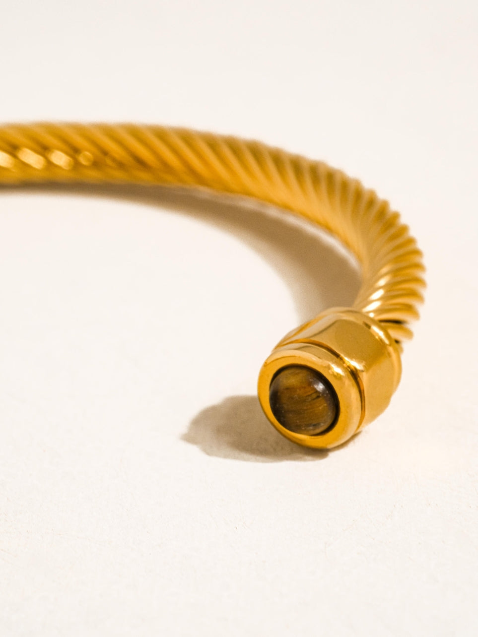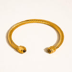 Enhance your style effortlessly with the Vail 18K Gold Non-Tarnish Stone Braided Bangle, an exquisite piece blending sophistication with contemporary flair. Featuring a beautifully twisted gold design adorned with rich, emerald-colored stones at each end, this adjustable bangle captures elegance and modernity. Crafted to maintain its radiant glow without tarnishing, it's perfect for everyday luxury or adding a subtle pop of color for special occasions. Wear this timeless bracelet to complete your look with refined confidence.