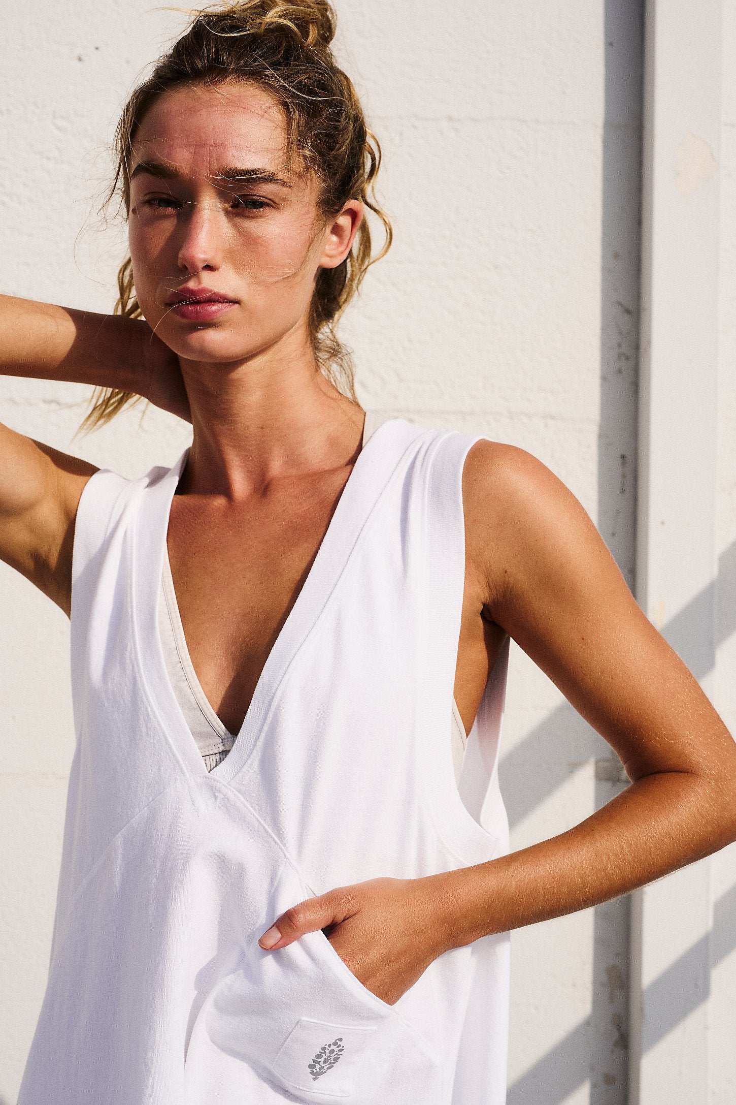 Features: Smooth, lightweight fabrication is 100% cotton; oversized fit; longline silhouette hits below natural waist; dropped armholes; deep v-neck; racerback; patch pocket at front; side seam slit detail