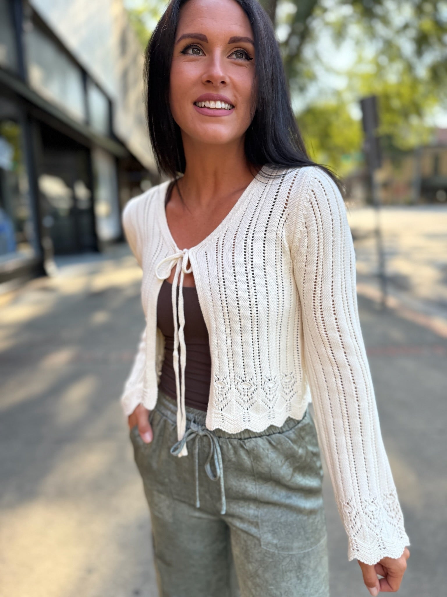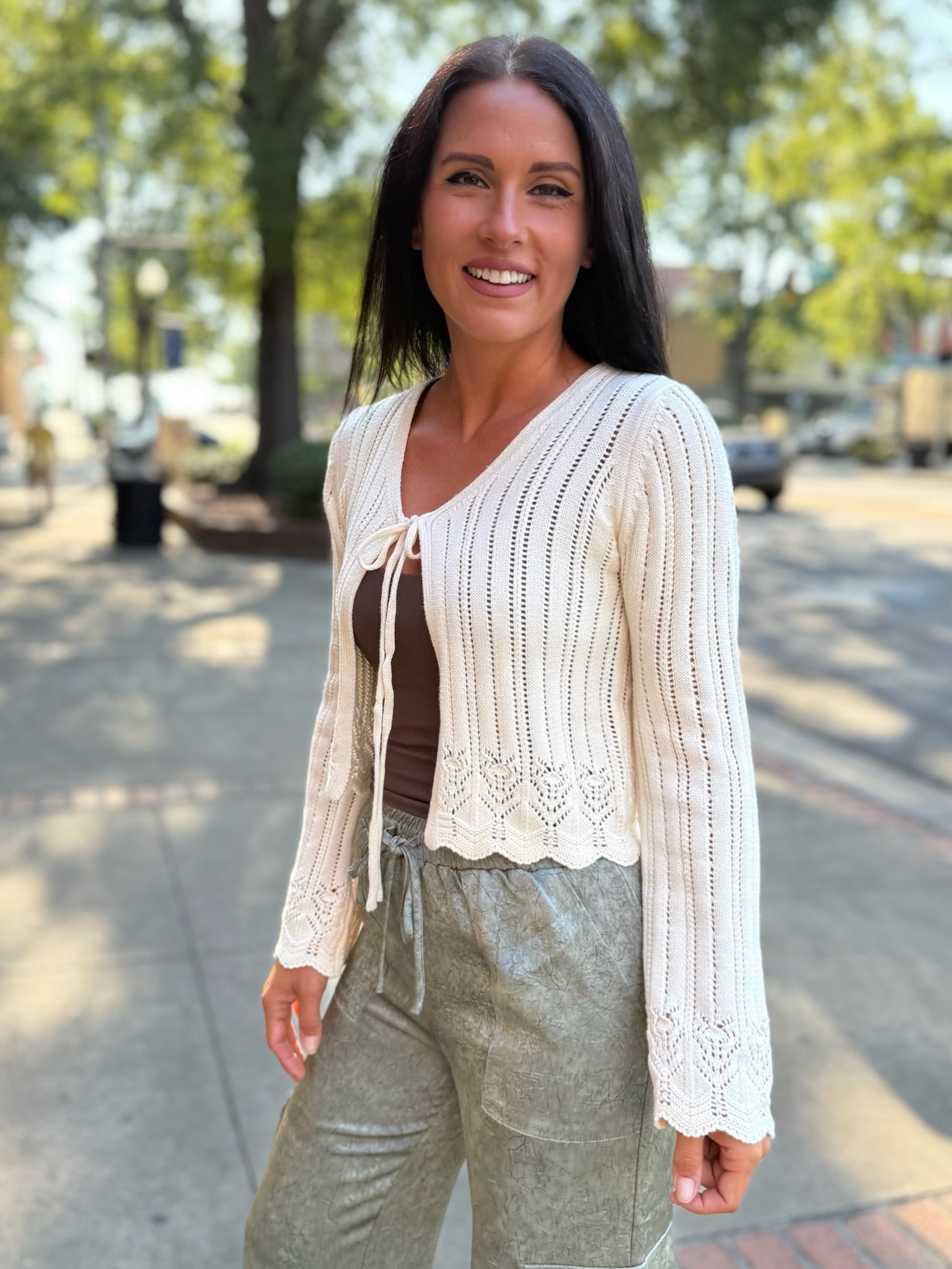 Elevate your layering game with this vintage-inspired cream knit cardigan. Featuring delicate floral pointelle detailing and a charming tie-front closure, this lightweight piece exudes feminine charm. The scalloped hem and flared cuffs add a romantic touch, making it the perfect complement to dresses, camis, or high-waisted jeans. Ideal for transitional weather or adding texture to your outfit, this cardigan blends comfort with timeless elegance.