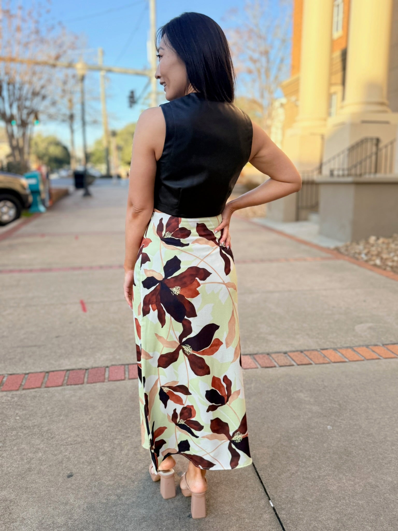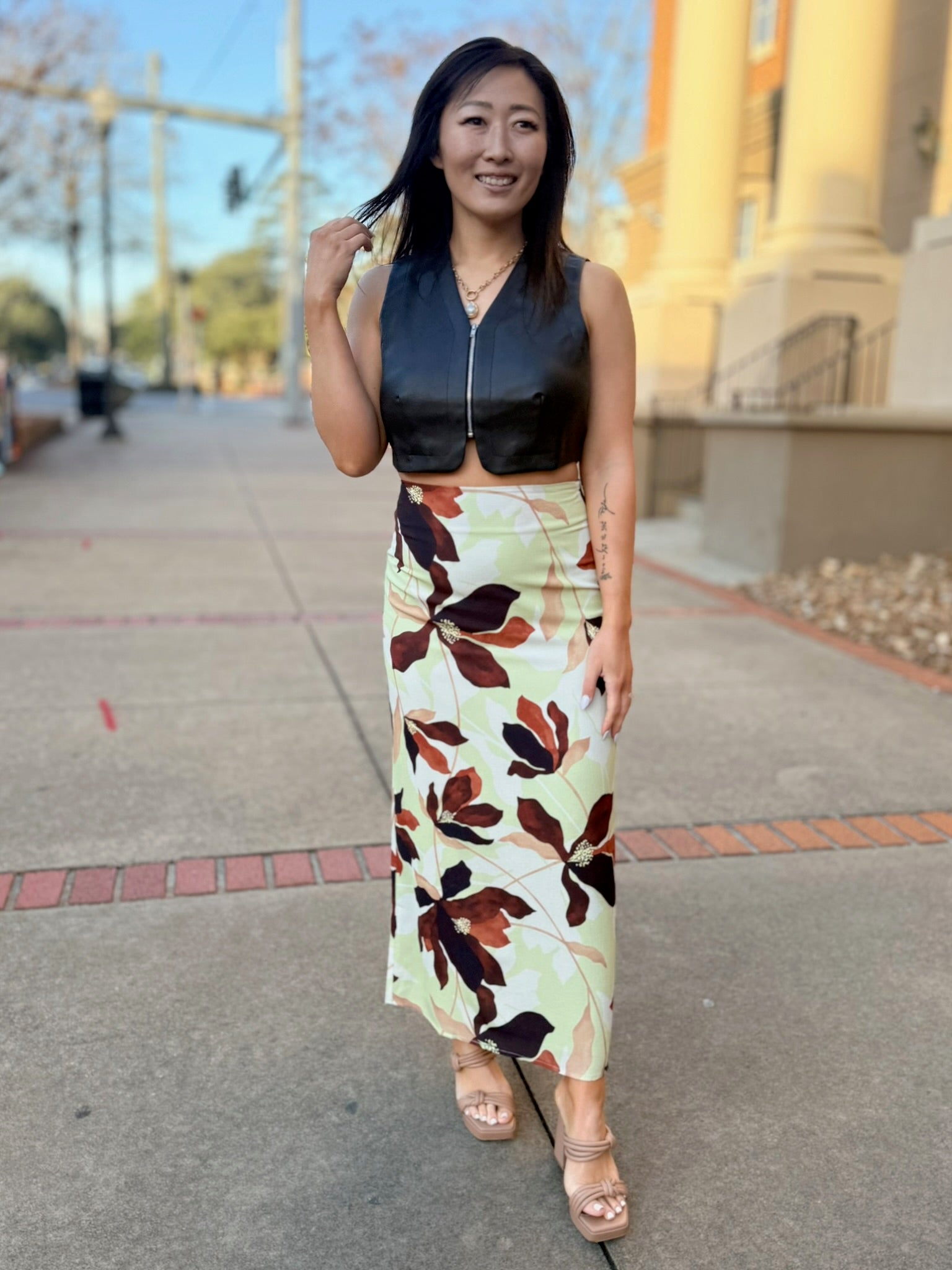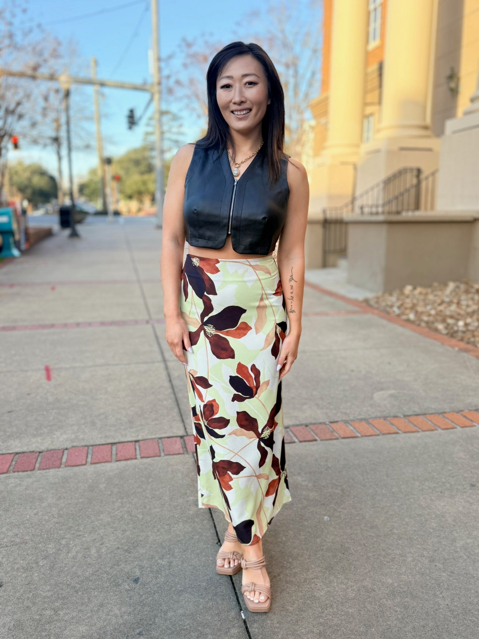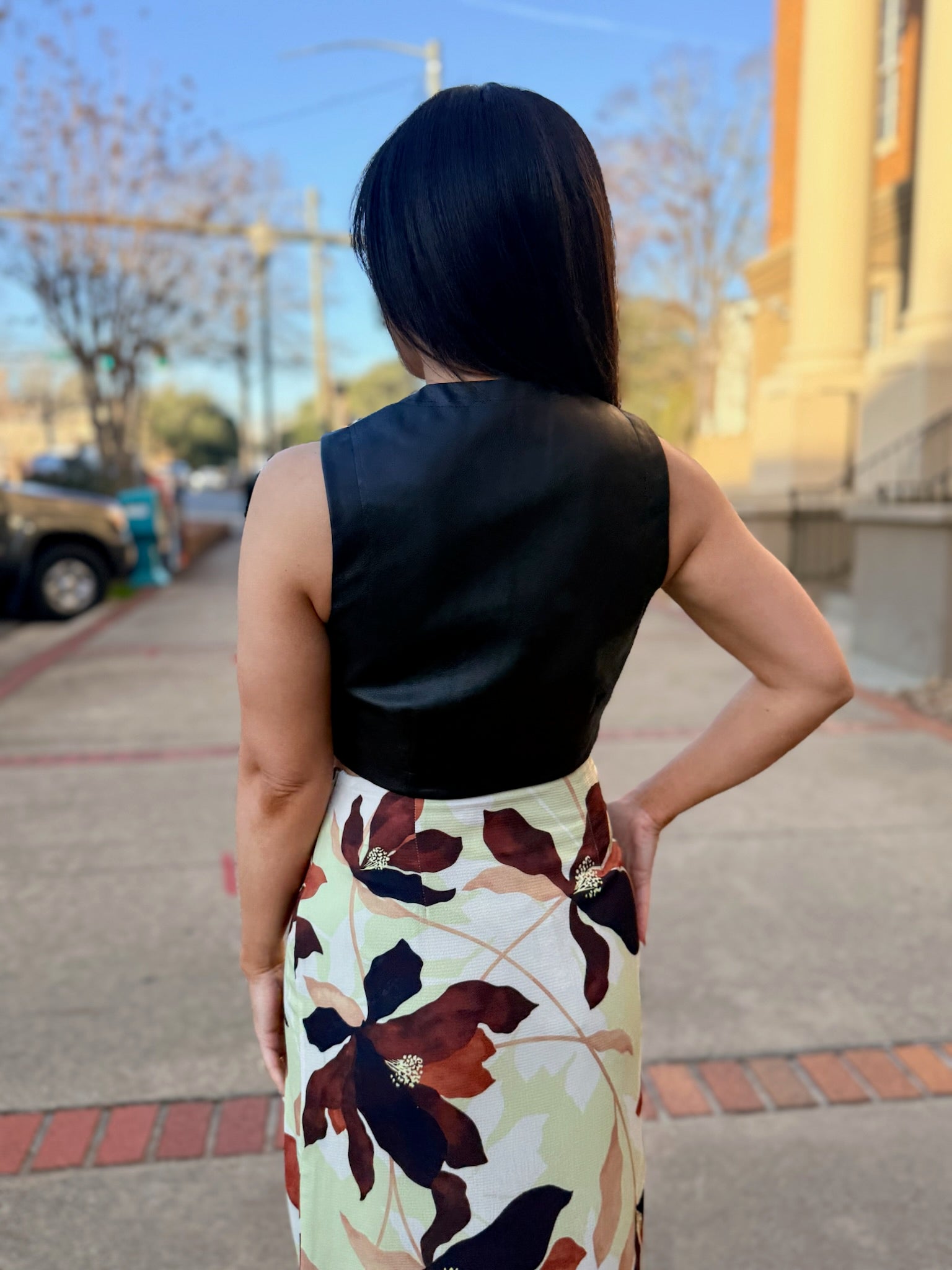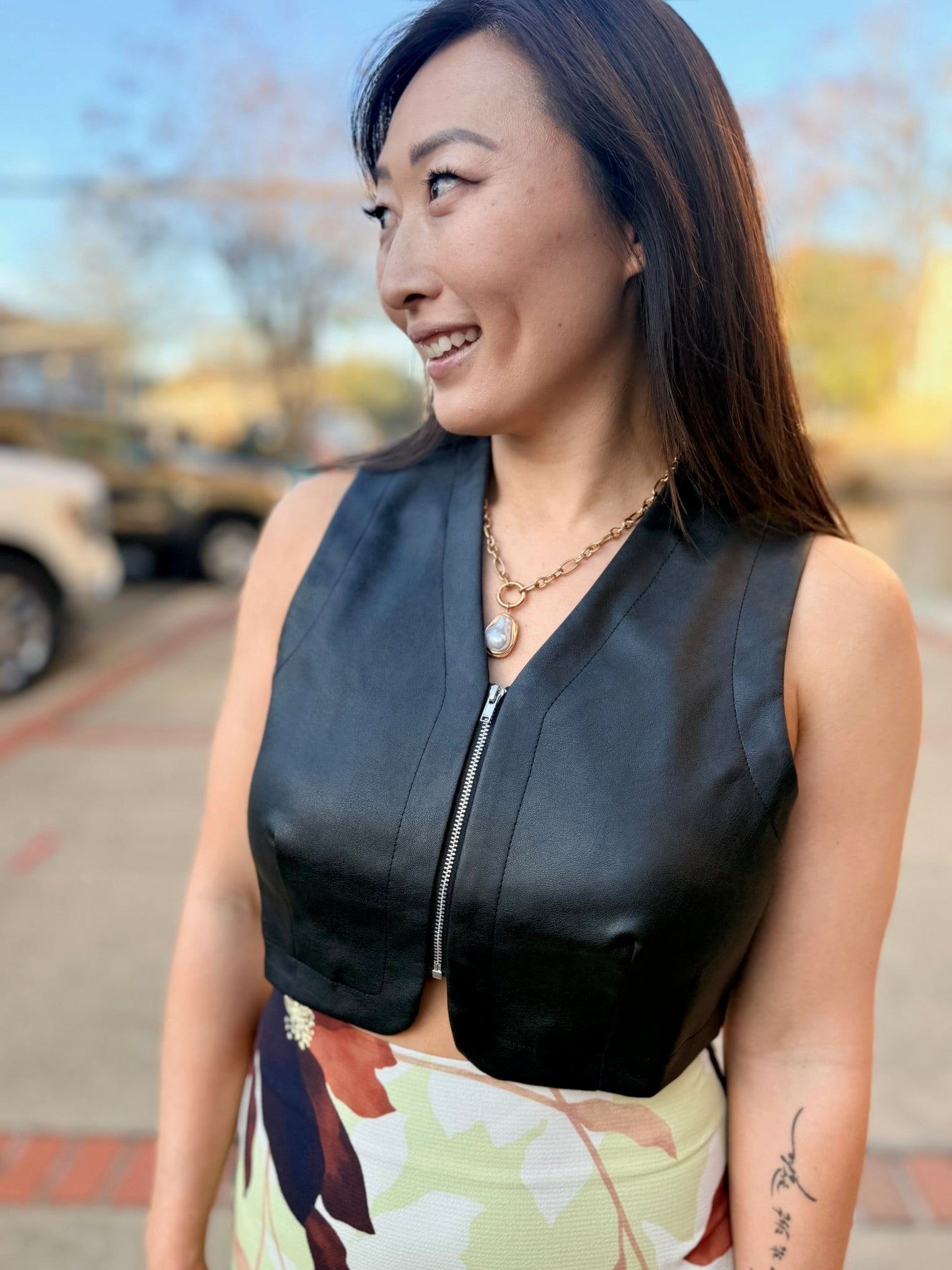 Sleek, edgy, and effortlessly cool, the Vroom Vroom Vegan Leather Vest by Sage the Label is the perfect statement layer. Crafted from smooth vegan leather with a soft stretch lining, this vest features a clean open-front silhouette that adds instant polish to any outfit. Lightweight yet structured, it layers seamlessly over dresses, tops, or knits, making it a versatile piece for elevating both casual and dressed-up looks. A modern must-have for adding attitude and sophistication to your wardrobe.