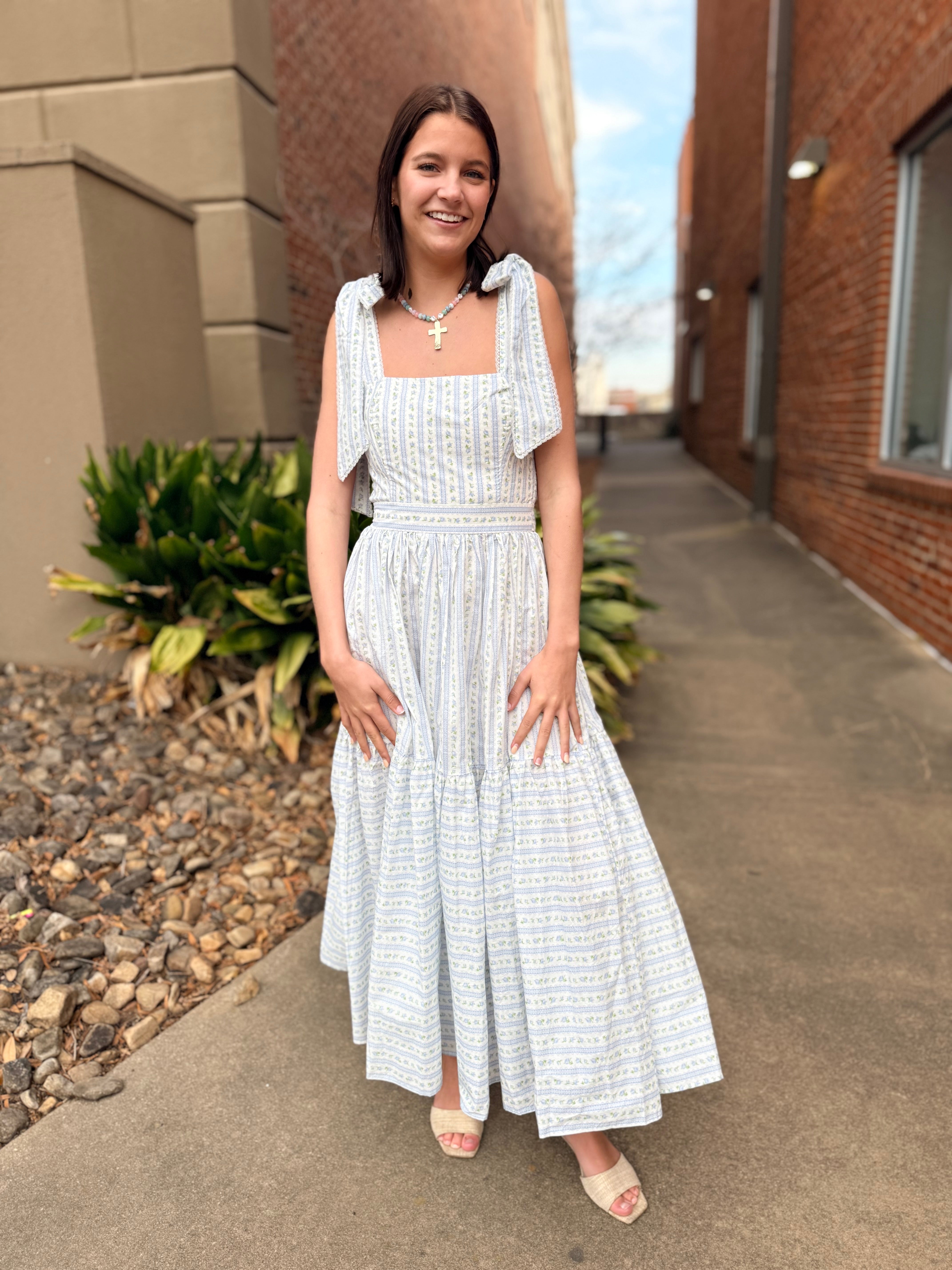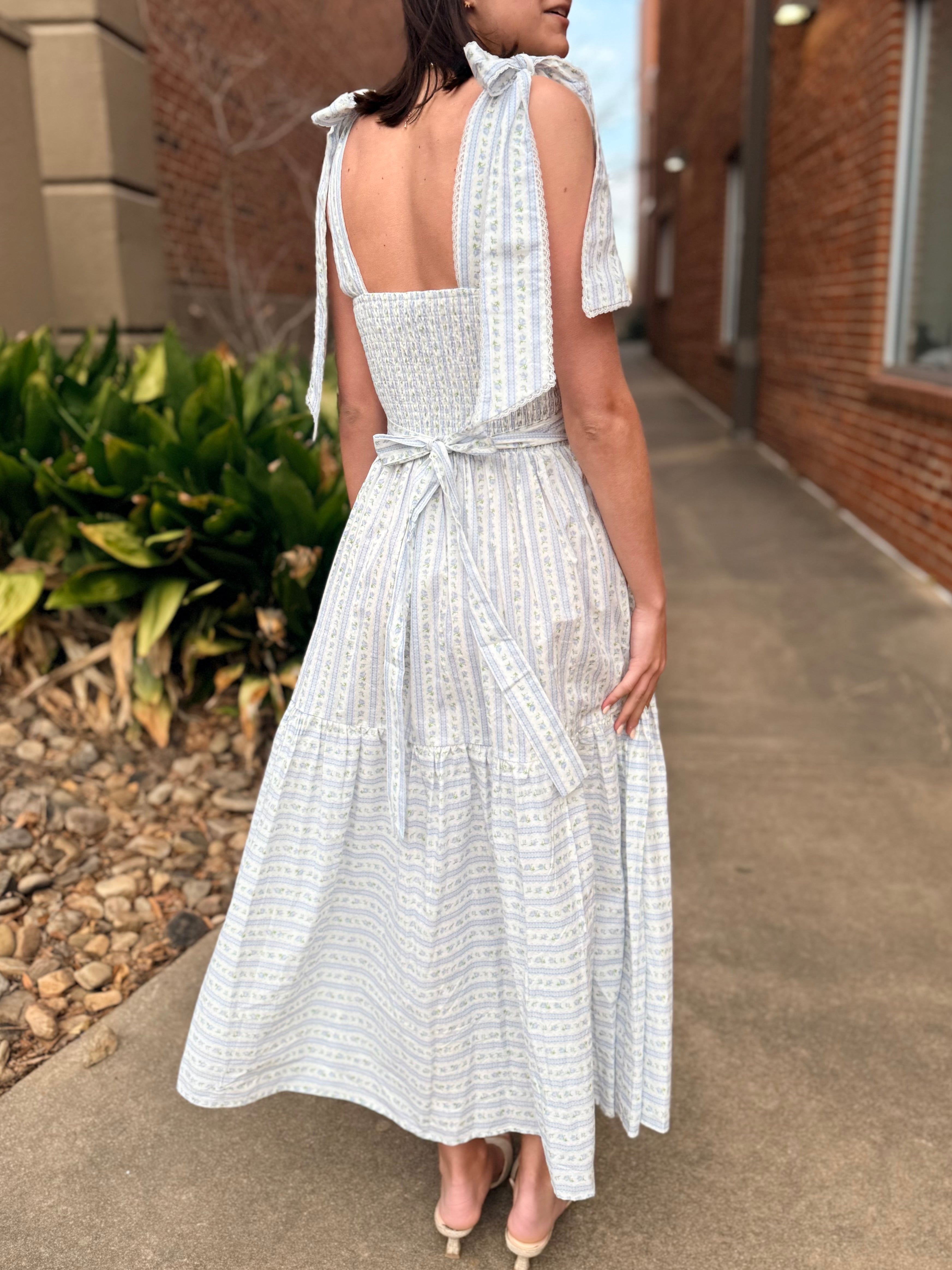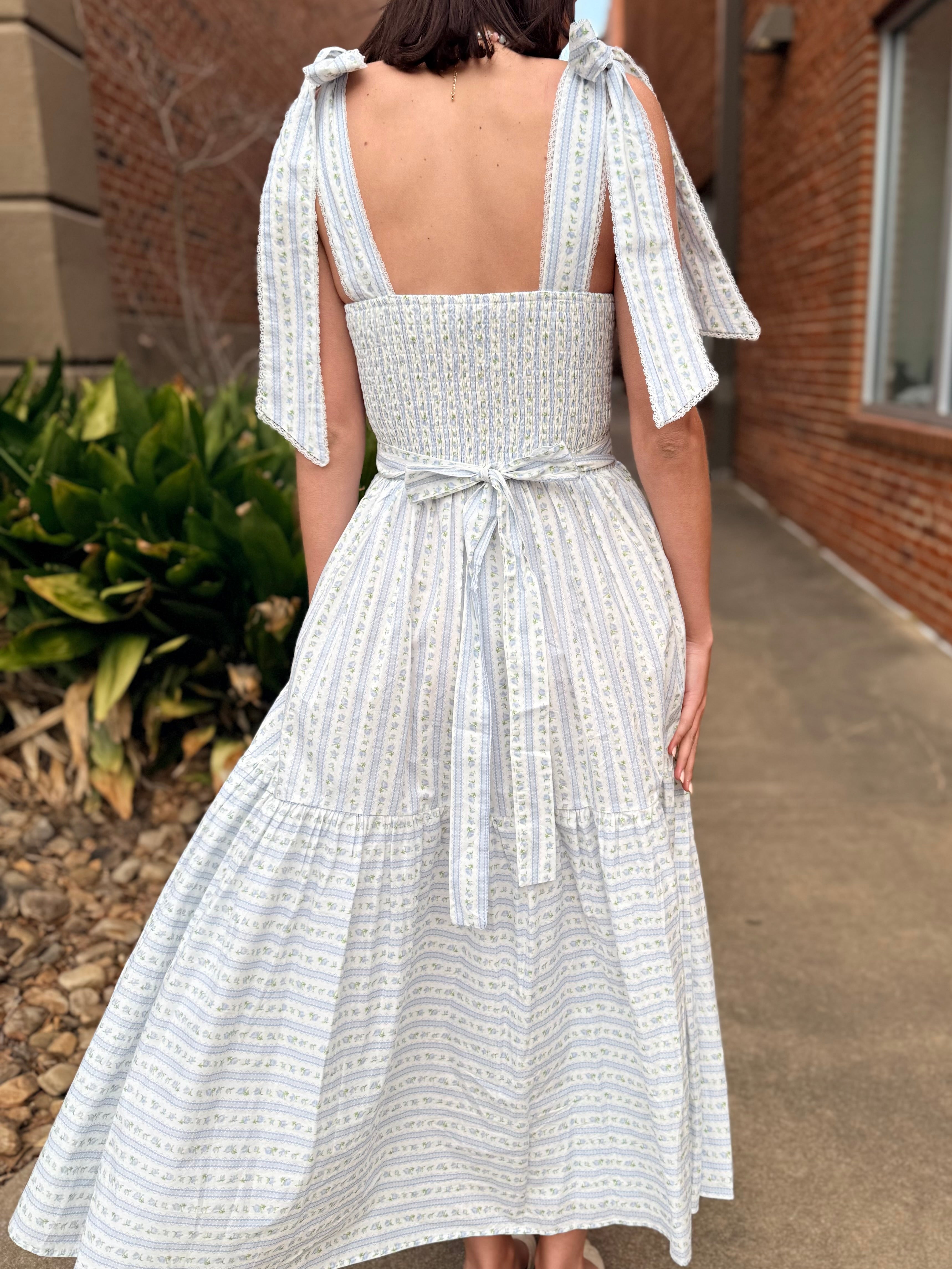 This dress is pure cottagecore charm with an elevated, wearable feel. Featuring a soft wallpaper-inspired floral print, it’s designed with adjustable self-tie shoulder straps and delicate micro lace trim that adds just the right amount of romantic detail. The tiered midi silhouette flows beautifully, while the smocked back ensures a comfortable, flattering fit.