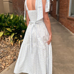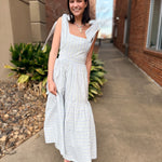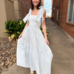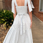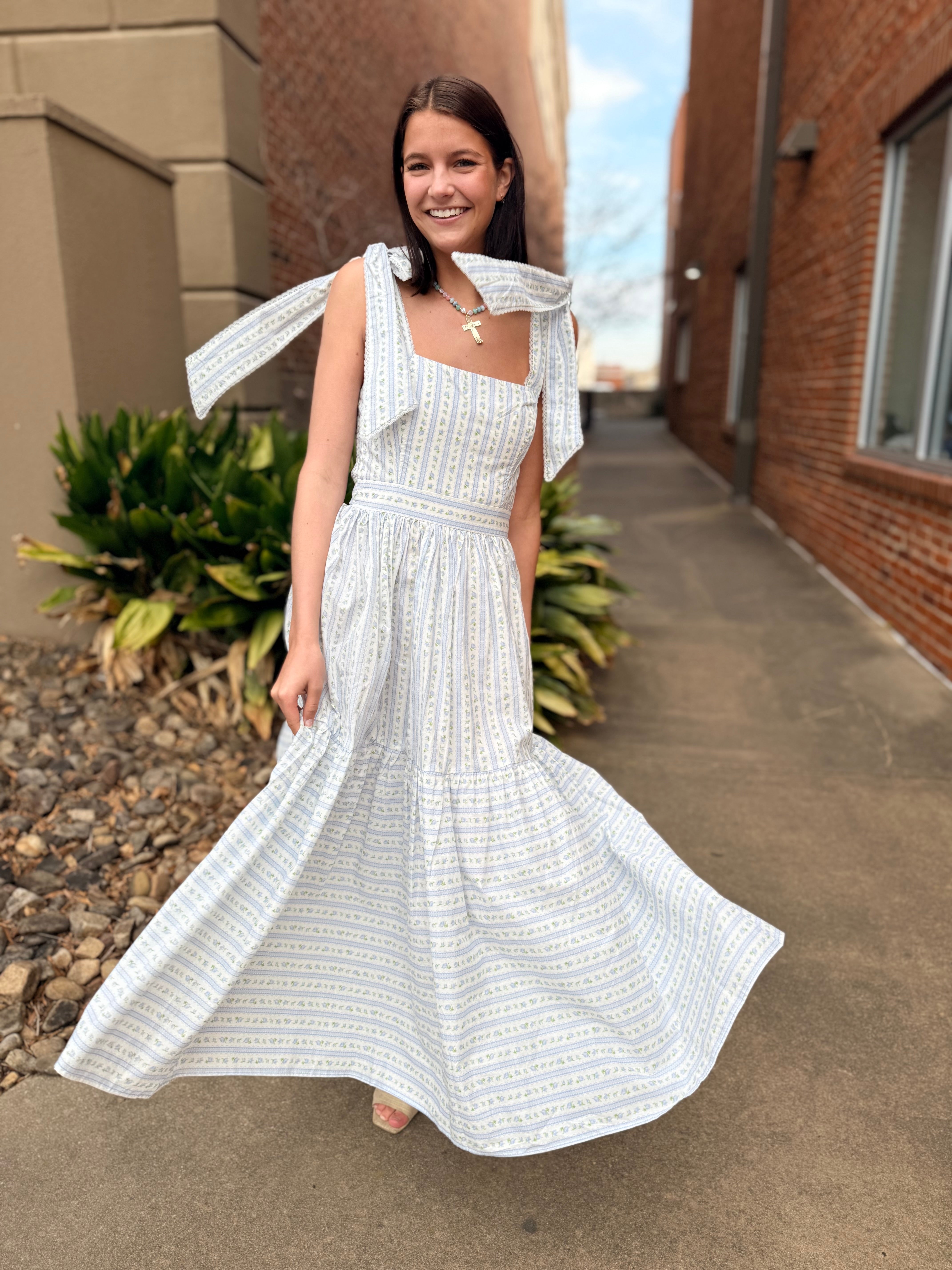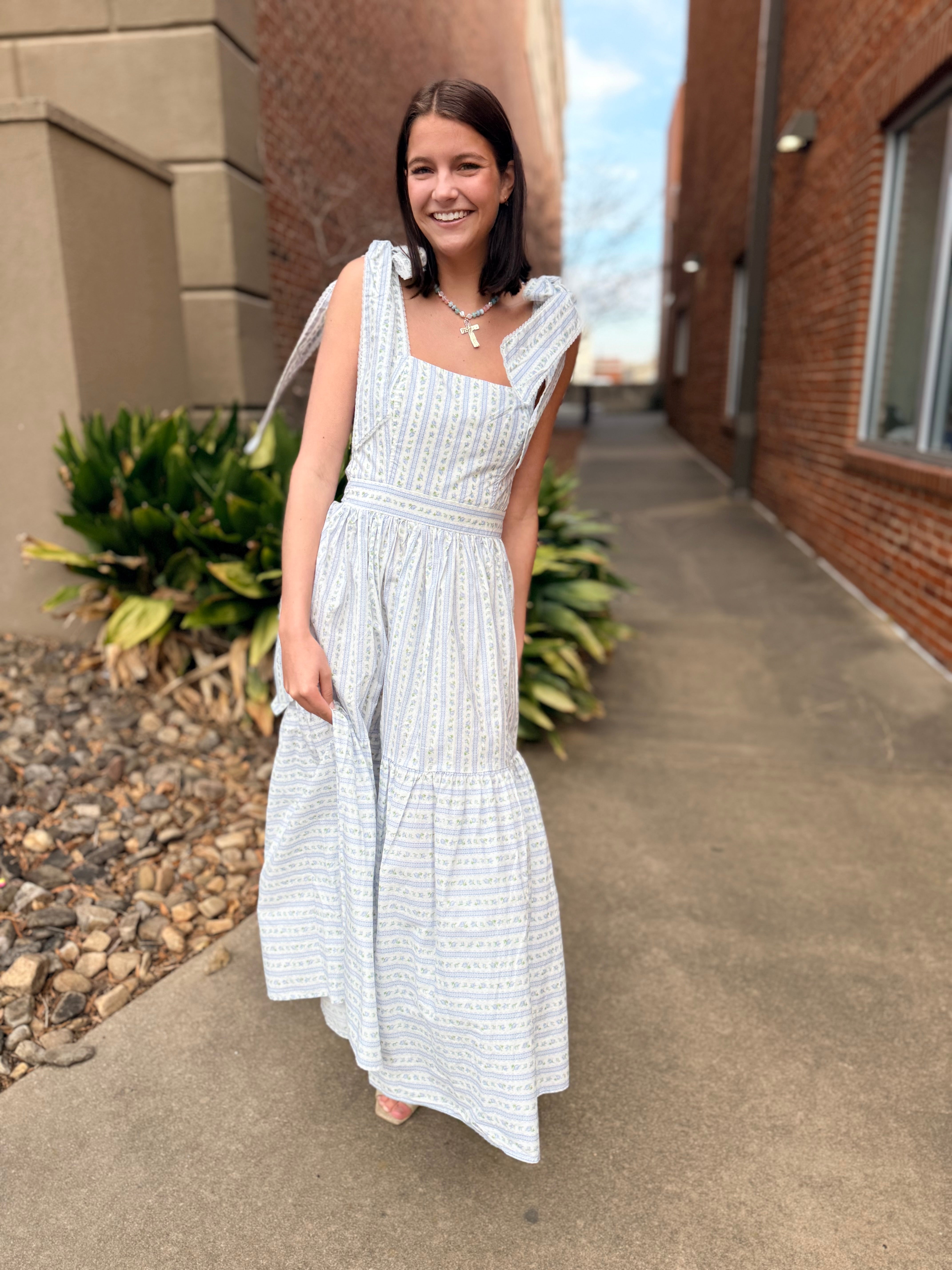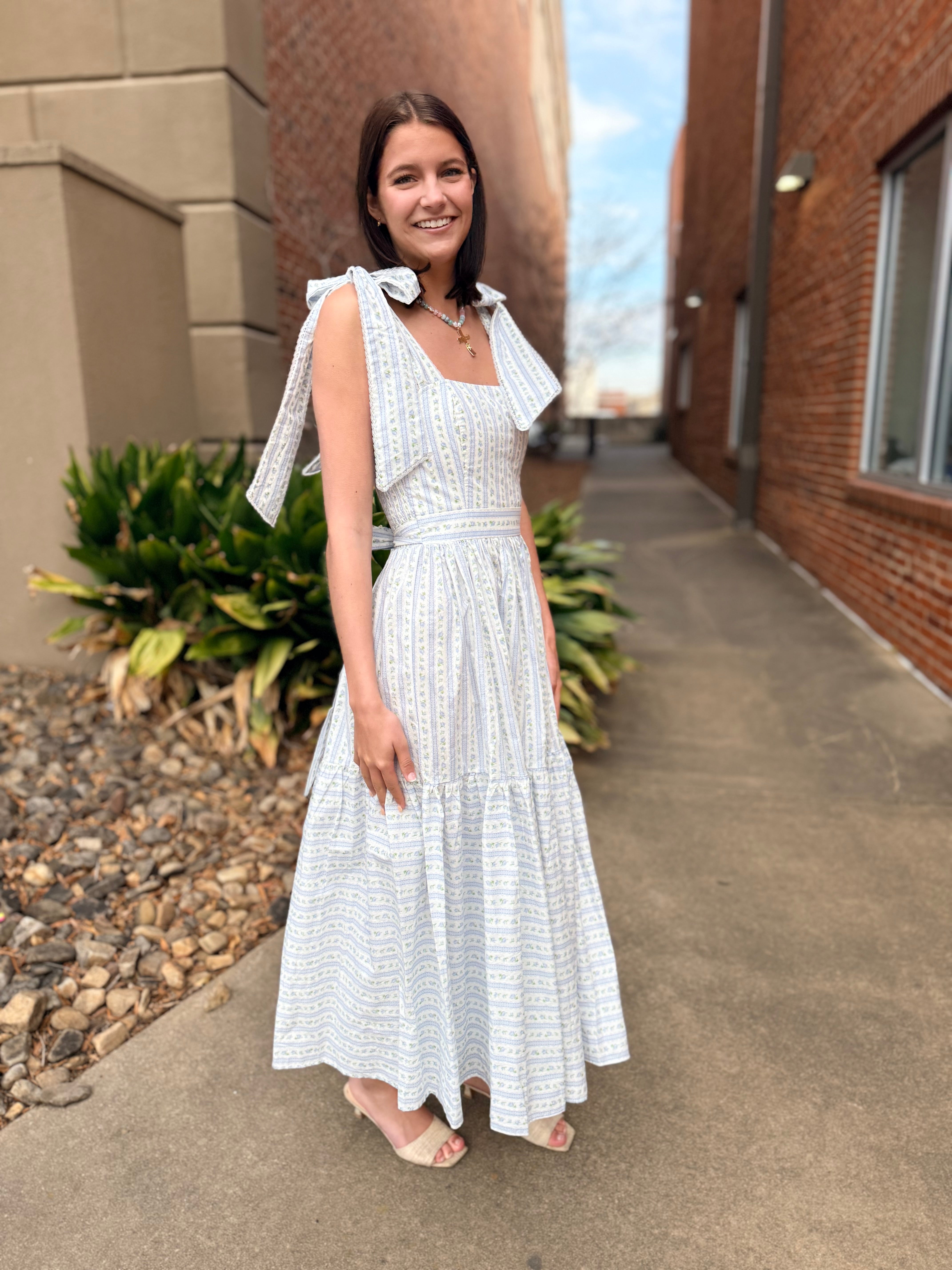 This dress is pure cottagecore charm with an elevated, wearable feel. Featuring a soft wallpaper-inspired floral print, it’s designed with adjustable self-tie shoulder straps and delicate micro lace trim that adds just the right amount of romantic detail. The tiered midi silhouette flows beautifully, while the smocked back ensures a comfortable, flattering fit.