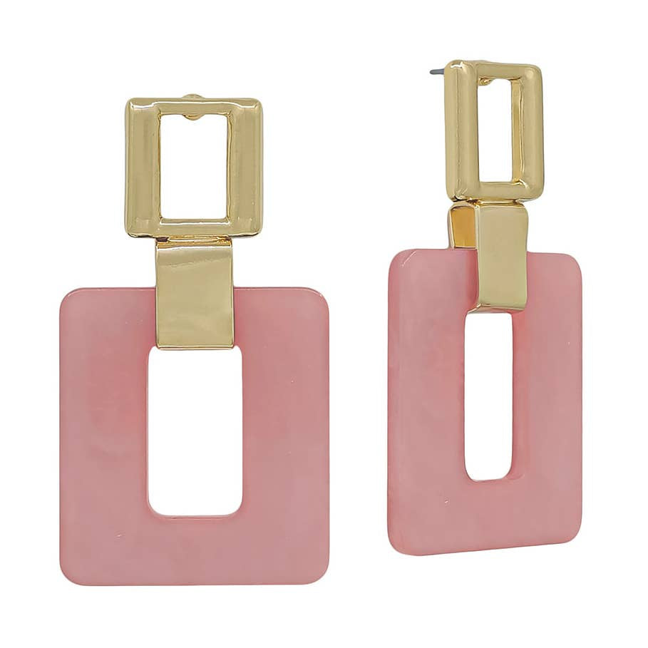 Water Resistant Gold with Matte Pink Open Square 2" Earring