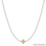 Combine elegance and spirituality with the Golden Cross Pearl Necklace! This 16"-18" water-resistant necklace features a delicate gold cross pendant accented with lustrous pearls, creating a timeless and sophisticated look.
