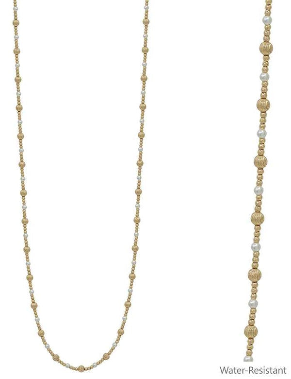 Say hello to the Golden Pearl Whisper Necklace – a delicate 34" strand of gold and pearl beads made for effortless layering. Its water-resistant design makes it as practical as it is pretty, perfect for all-day elegance. The mix of textures adds just the right amount of shimmer and charm to any look. Whether worn solo or styled with other favorites, it’s a graceful touch you’ll reach for again and again.