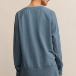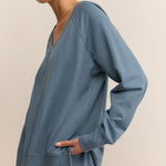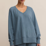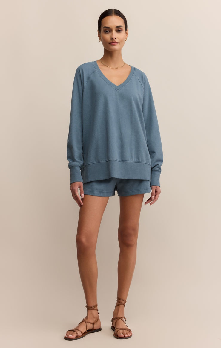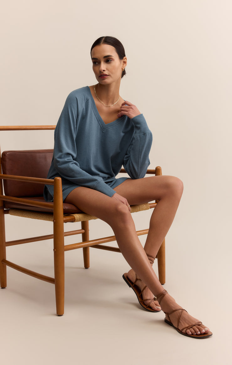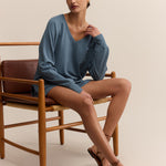 The Weekender V Neck - Boathouse is a relaxed, cozy pullover featuring a soft, washed blue tone. Designed with a flattering V-neckline, dropped shoulders, and ribbed cuffs and hem, it pairs effortlessly with matching shorts or your favorite lounge bottoms for a laid-back, stylish look. Perfect for casual days or relaxing at home.