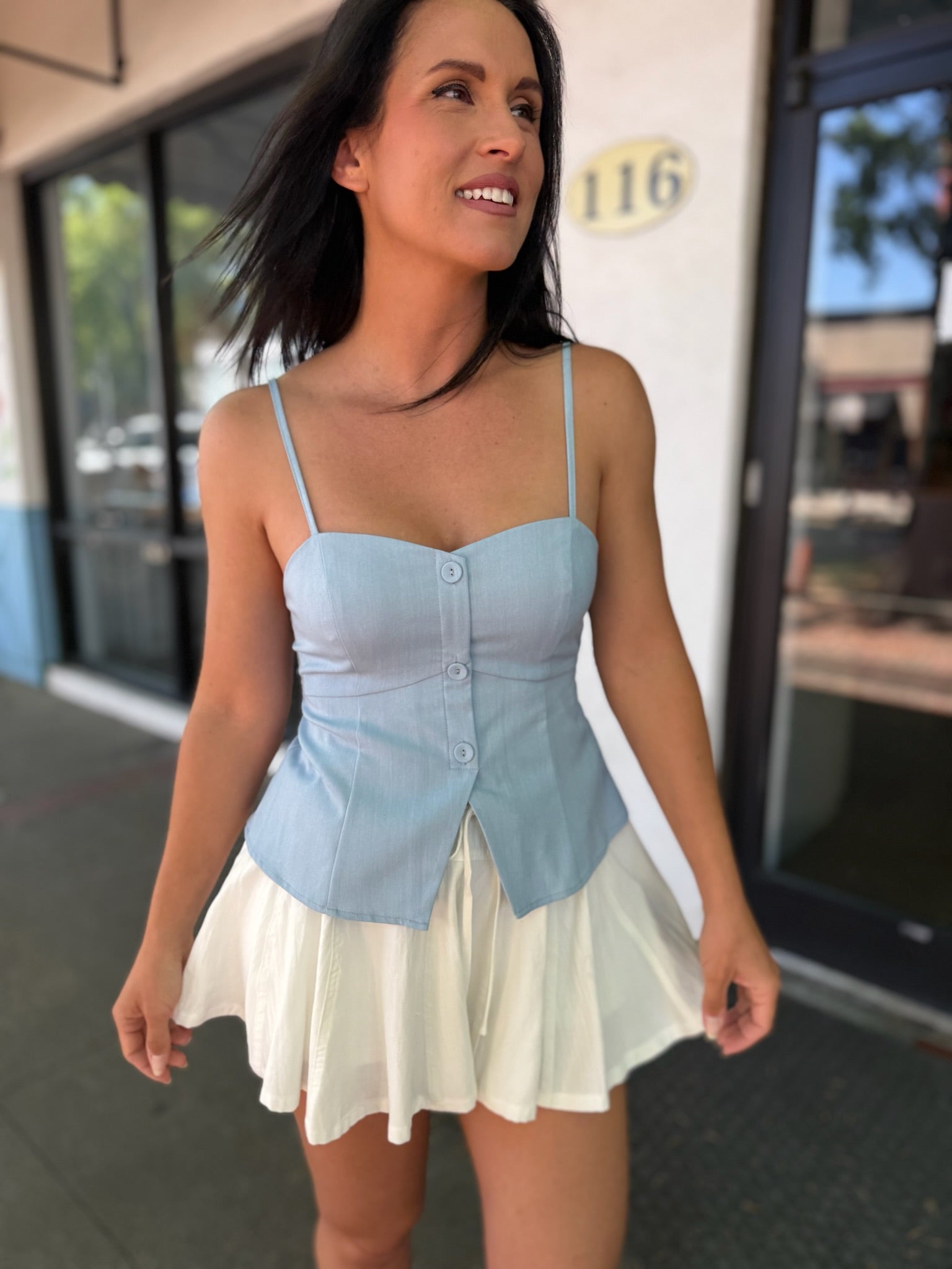 This white banded tie-front flare skort blends the femininity of a flared skirt with the comfort of shorts, offering both elegance and ease of movement. The lightweight fabric drapes beautifully, creating a flowy and breezy silhouette perfect for casual outings, beachwear, or summer adventures. The adjustable tie-front waistband adds a playful yet practical touch, ensuring a comfortable and flattering fit.